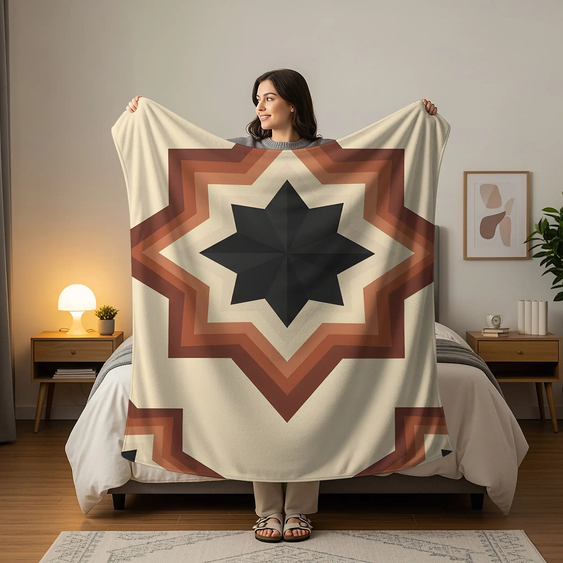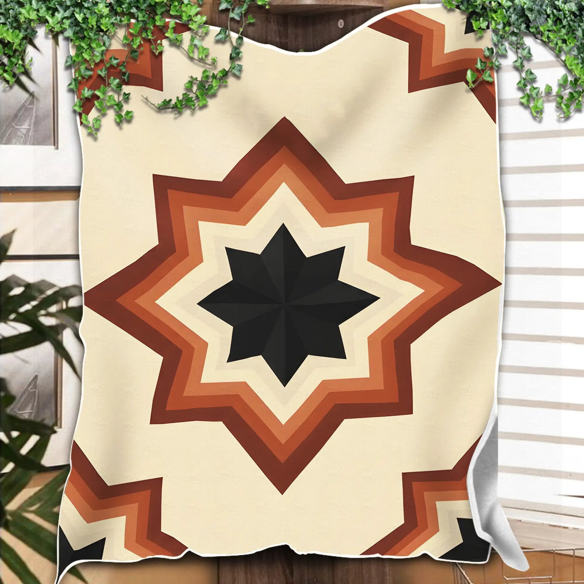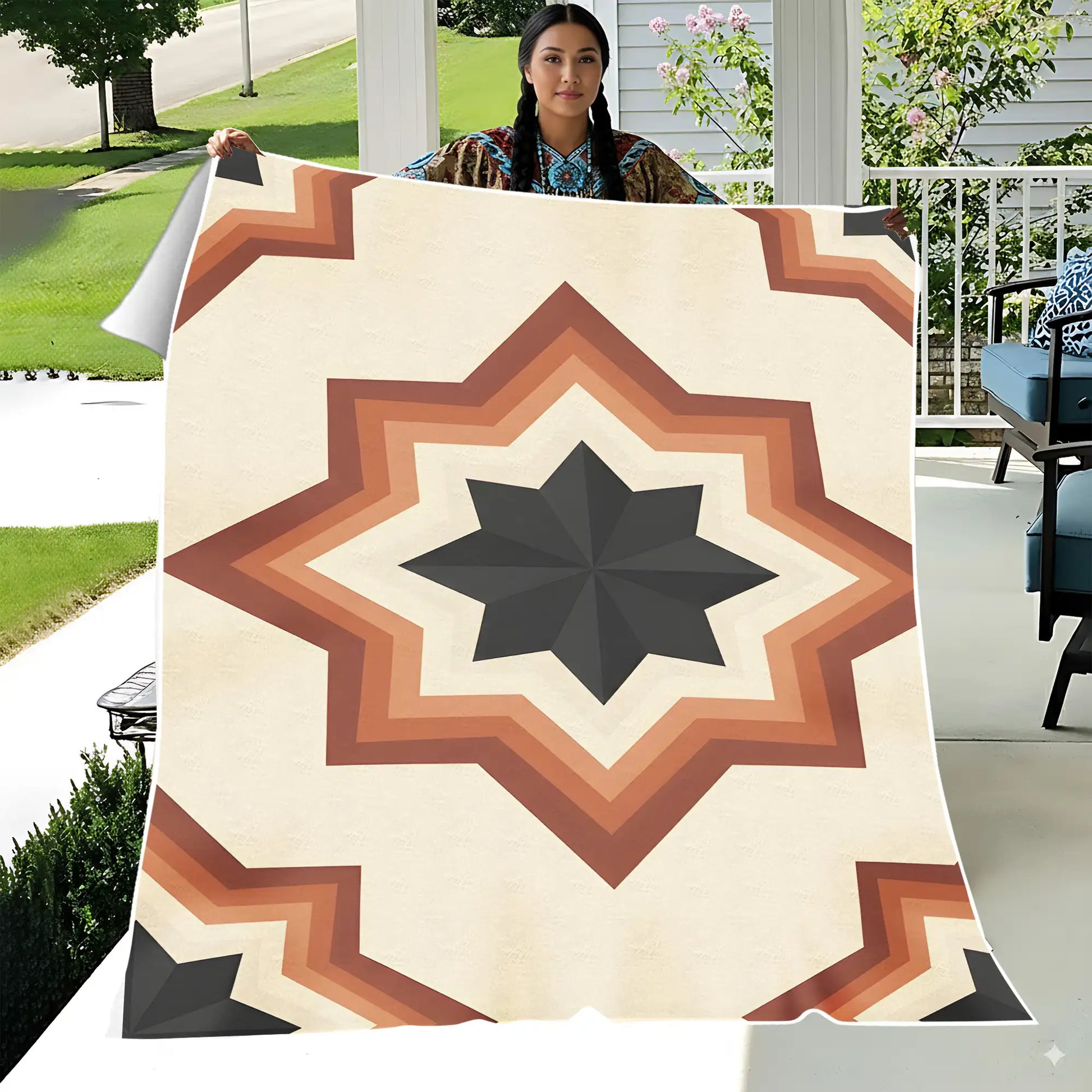 This blanket showcases the bold star motif often seen in Native America artistry, symbolizing guidance, strength, and unity. The geometric star is rendered in warm earthy tones of beige, brown, and black, creating a striking centerpiece that radiates balance and harmony. The pattern reflects the deep cultural traditions of tribal communities, where stars often represented spiritual direction and a connection to the universe. Soft yet durable, this blanket is perfect for everyday comfort or as a distinctive decorative piece in modern or rustic spaces, bringing warmth, heritage, and timeless beauty into your home environment.