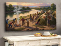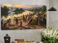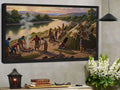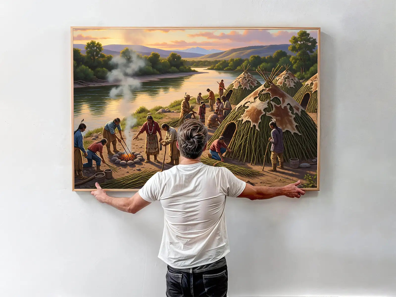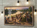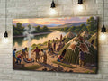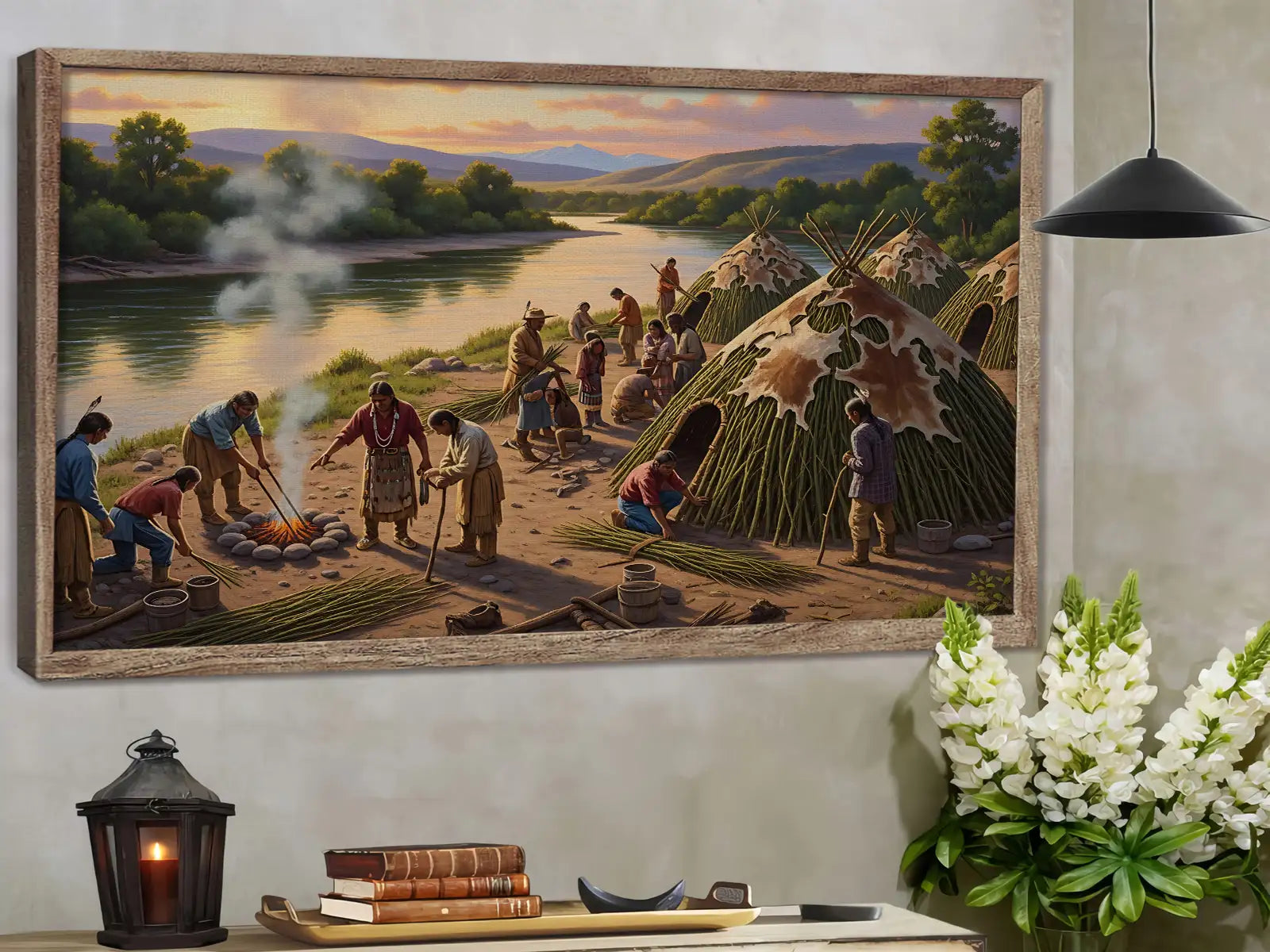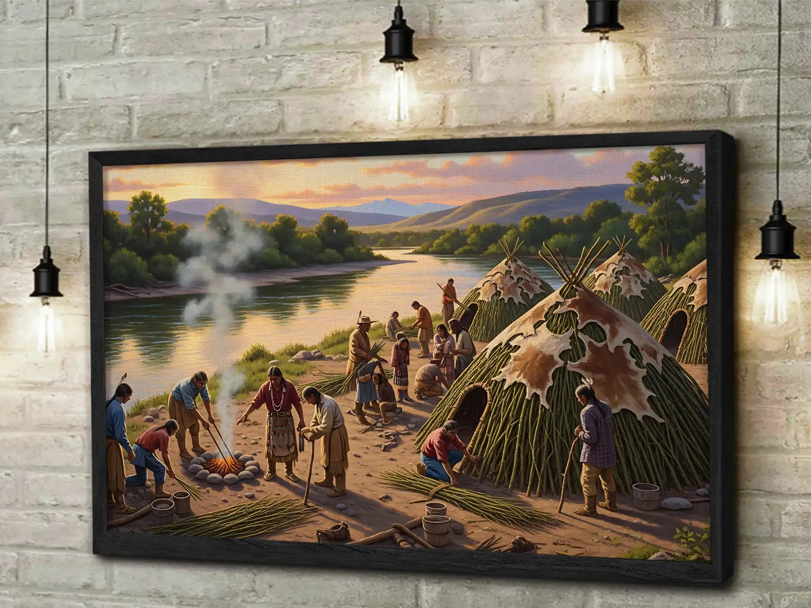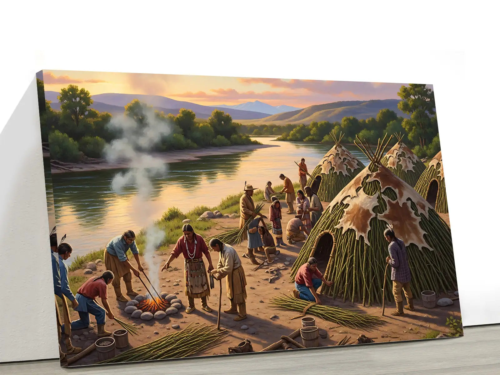 This Native America canvas wall art beautifully captures the daily life of an Indigenous riverside village. The scene depicts families gathered around a warm campfire, preparing food, weaving, and working together in harmony, with traditional domed dwellings in the background. Vibrant colors highlight the sunset sky, flowing river, and green landscape, evoking both serenity and strength. Every detail reflects a sense of unity, tradition, and respect for the land. Perfect for rustic interiors, cultural spaces, or as a meaningful gift, this artwork brings history and spirit into your home while celebrating the timeless connection between people and nature.