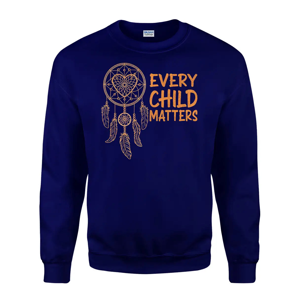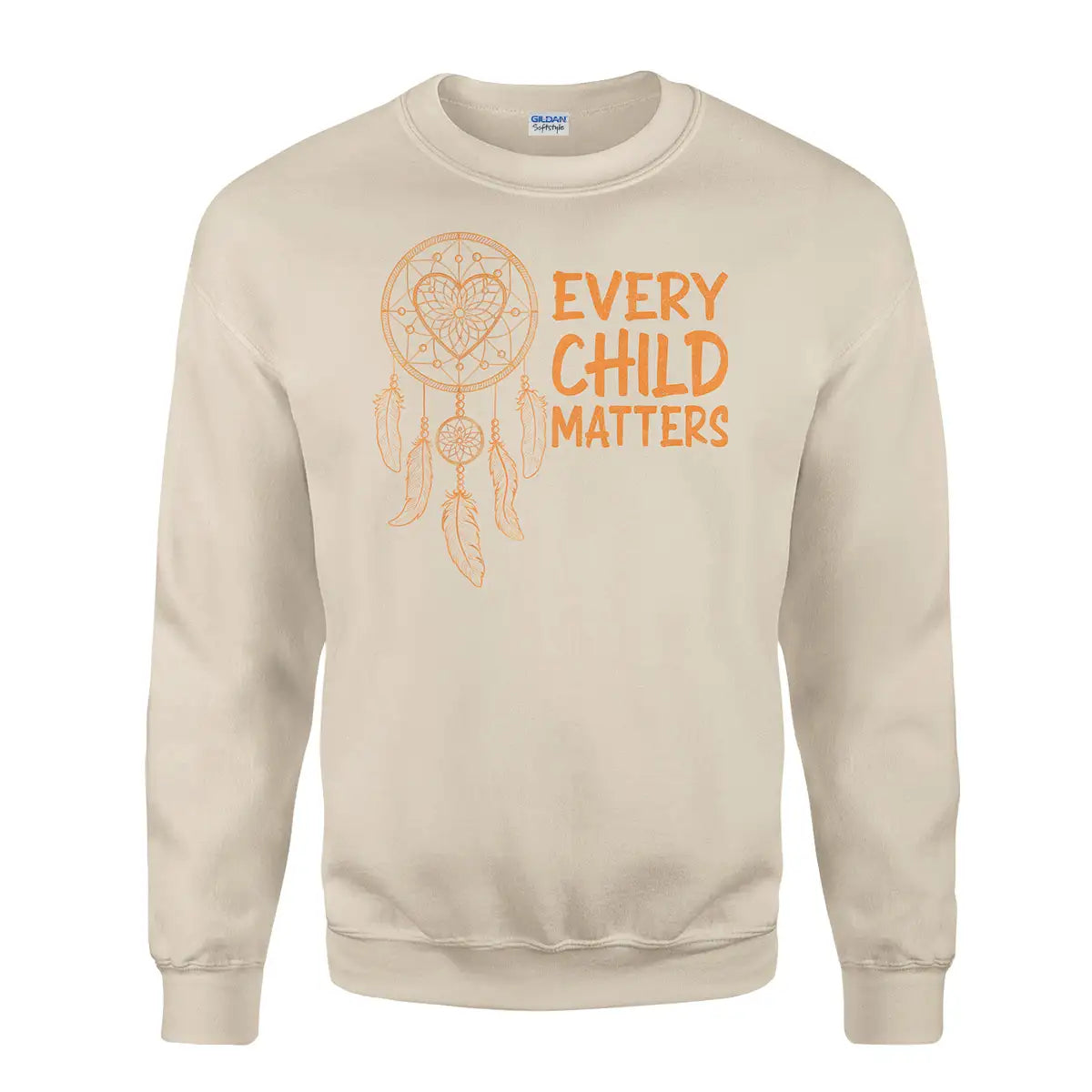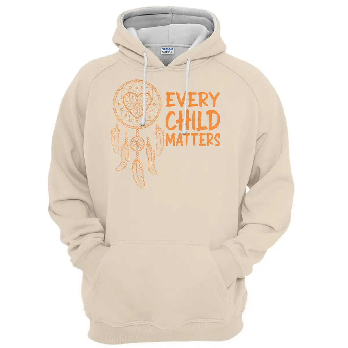 This hoodie carries the heartfelt message "Every Child Matters" combined with a dreamcatcher illustration that reflects Native America heritage. The dreamcatcher, a traditional symbol of protection and hope, reminds us of the importance of safeguarding children and honoring their voices. Printed in bold orange on a soft beige hoodie, the design is both powerful and comforting, perfect for raising awareness while keeping warm. Whether worn at events, gatherings, or in everyday life, this hoodie stands as a reminder of unity, respect, and the significance of cultural traditions. It is more than clothing, it is a statement of compassion and remembrance.