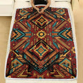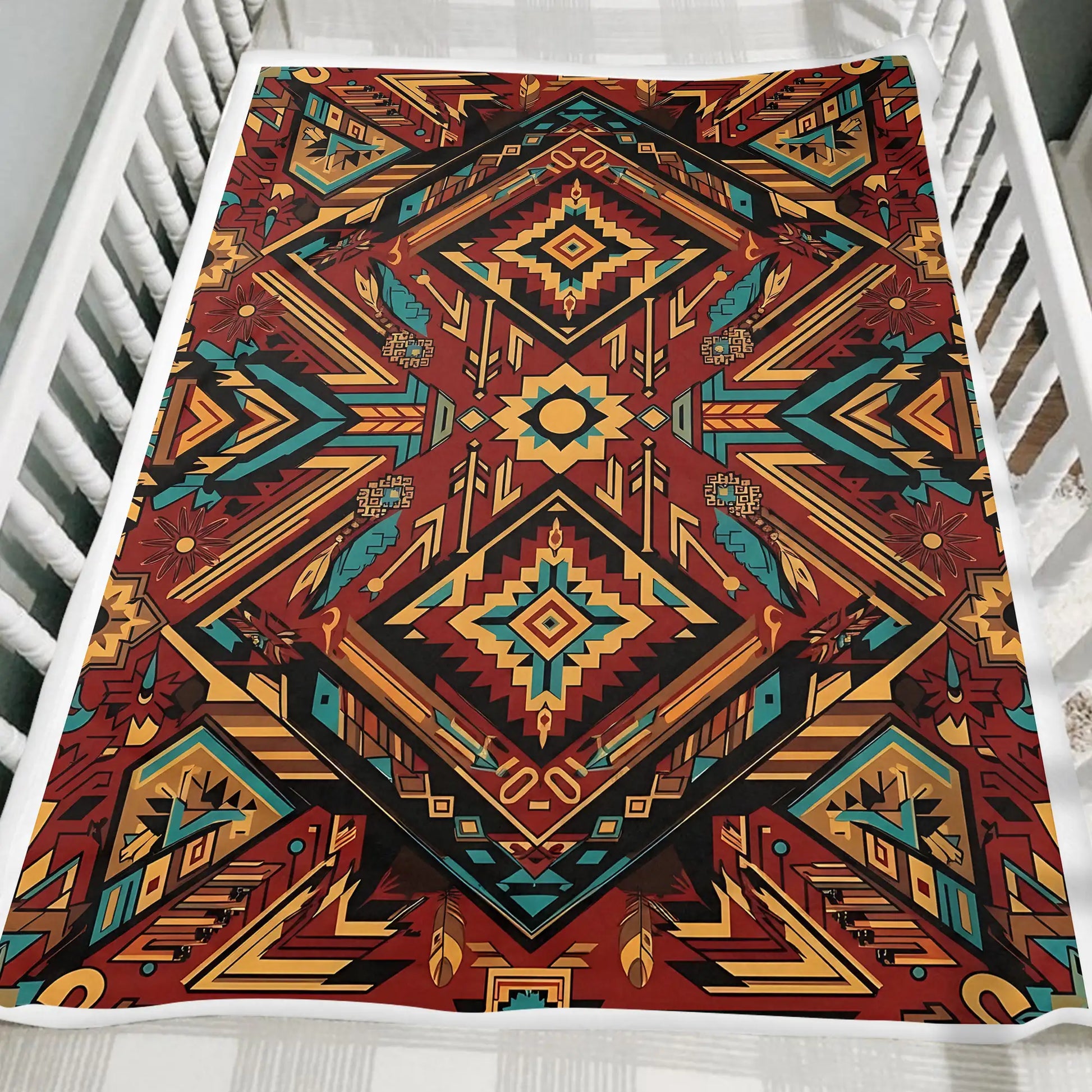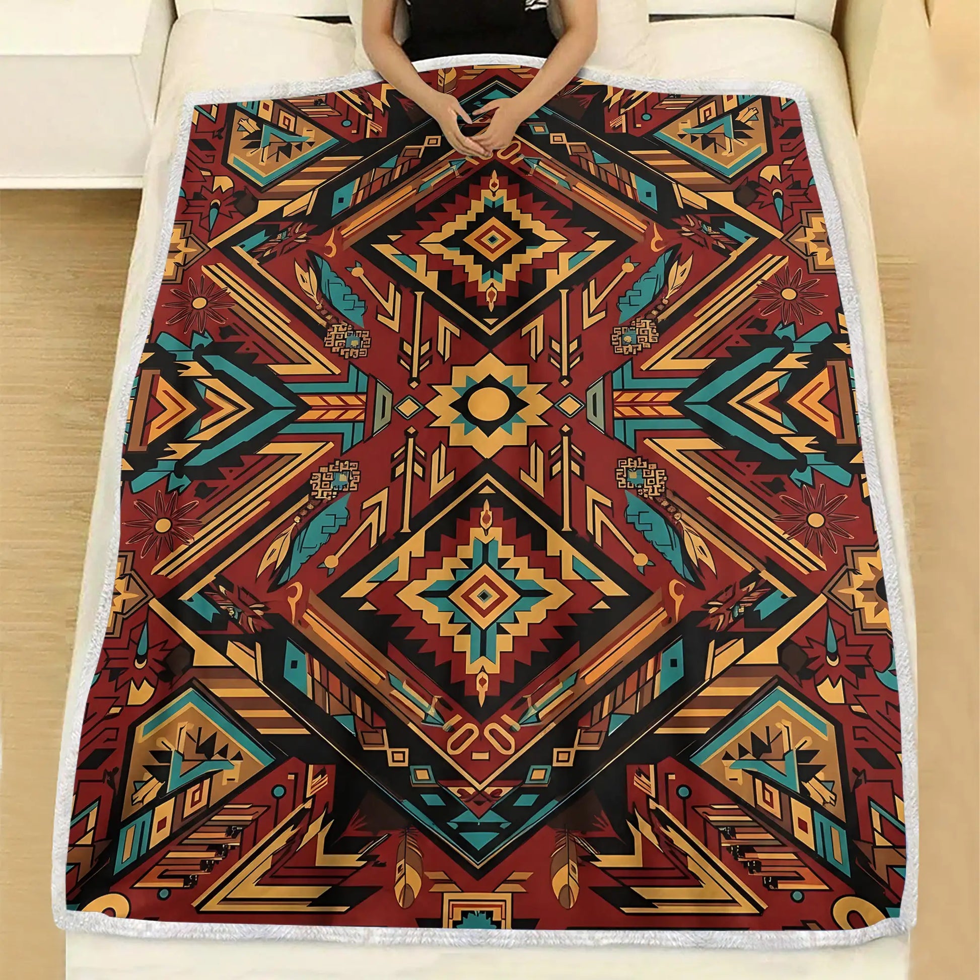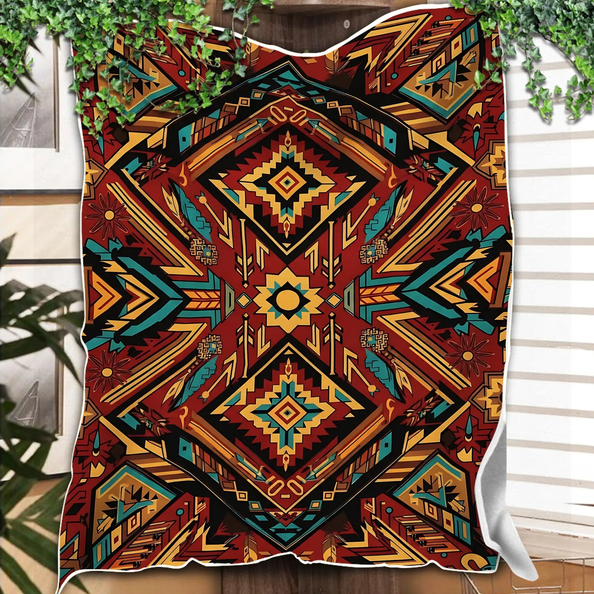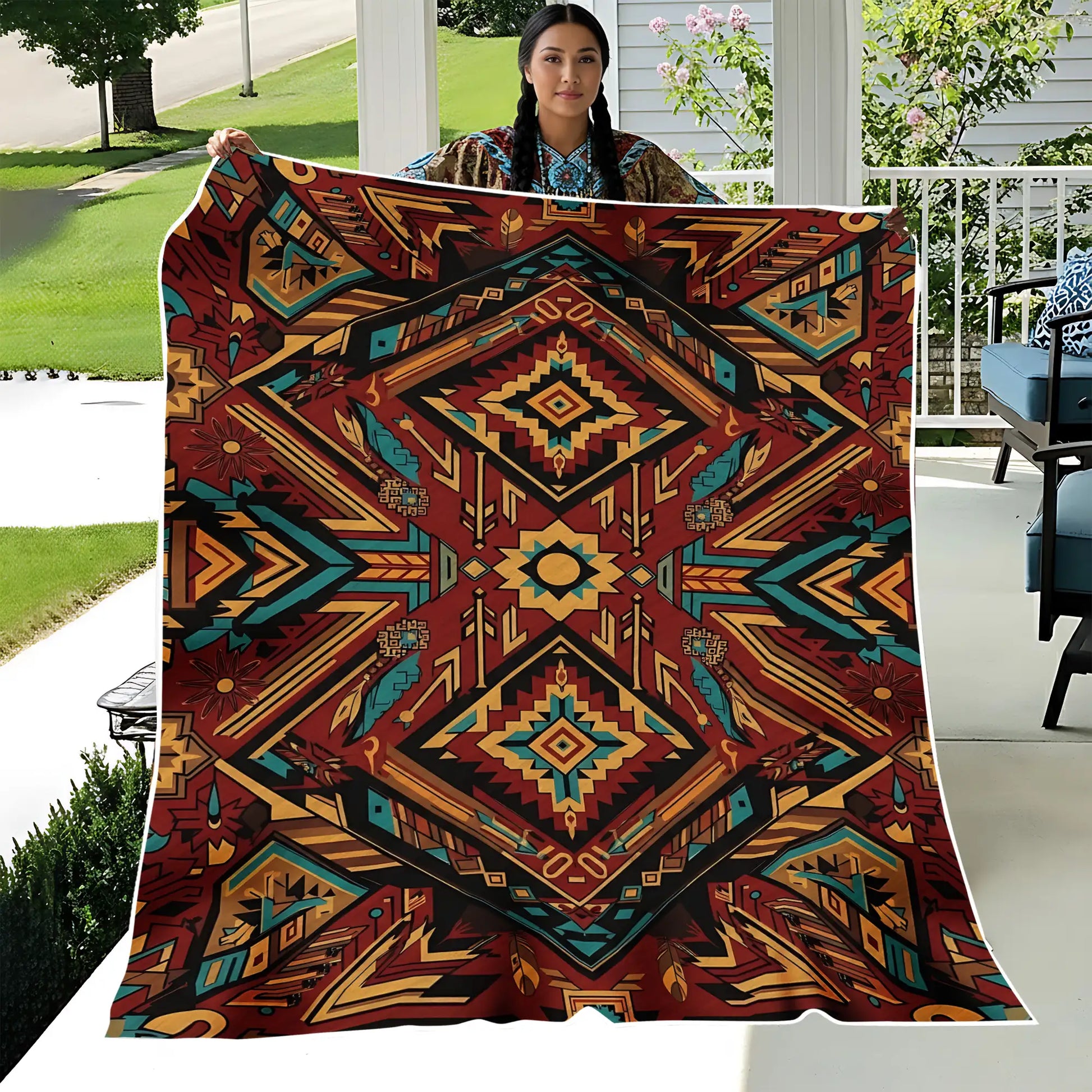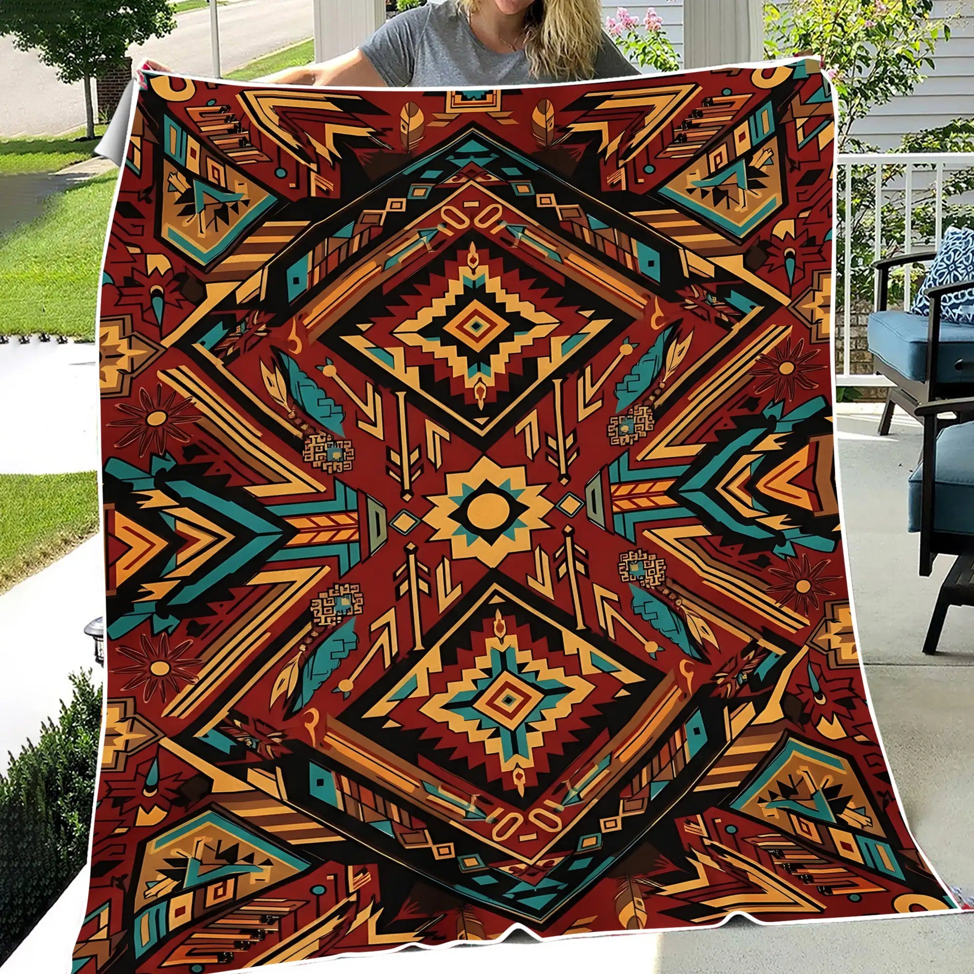 This blanket showcases a striking Native America design with complex geometric motifs in red, gold, turquoise, and deep brown. Inspired by traditional Southwestern tribes, the diamond and feather-like patterns symbolize protection, wisdom, and harmony with nature. Each detail reflects cultural storytelling, from the bold center diamond that represents balance to the surrounding shapes that echo strength and unity. Perfect for adding character to your home, this blanket can serve as a cozy sofa throw, a warm bedspread, or even a decorative accent. With its rich symbolism and vibrant colors, it merges cultural heritage with modern home comfort.