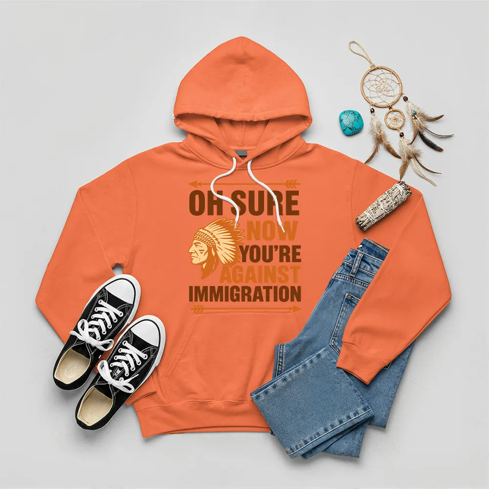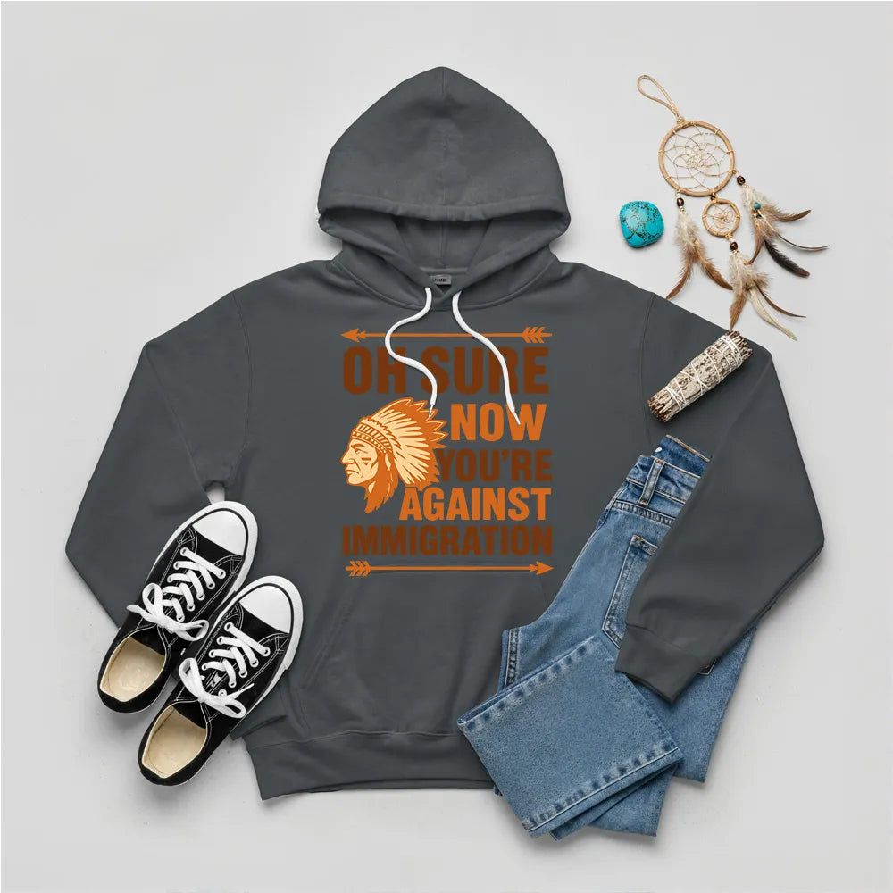This hoodie draws inspiration from Native American culture, featuring a traditional chief’s headdress design. The slogan, “Oh Sure Now You’re Against Immigration,” makes a poignant statement about history and migration. Designed for those who embrace bold statements and social awareness, this hoodie is perfect for casual wear. It symbolizes a reflection on the struggles faced by Native Americans and highlights the importance of immigration discussions. Made for comfort and style, it’s an ideal piece for those looking to make a statement while paying tribute to Native American heritage. Wear it proudly and spread awareness with every step.
