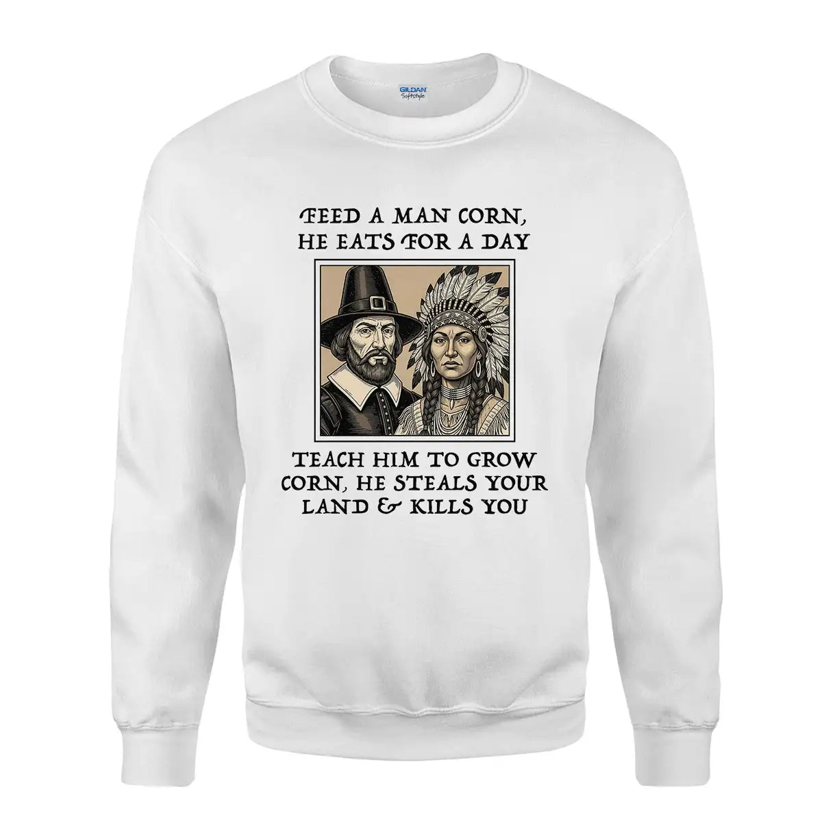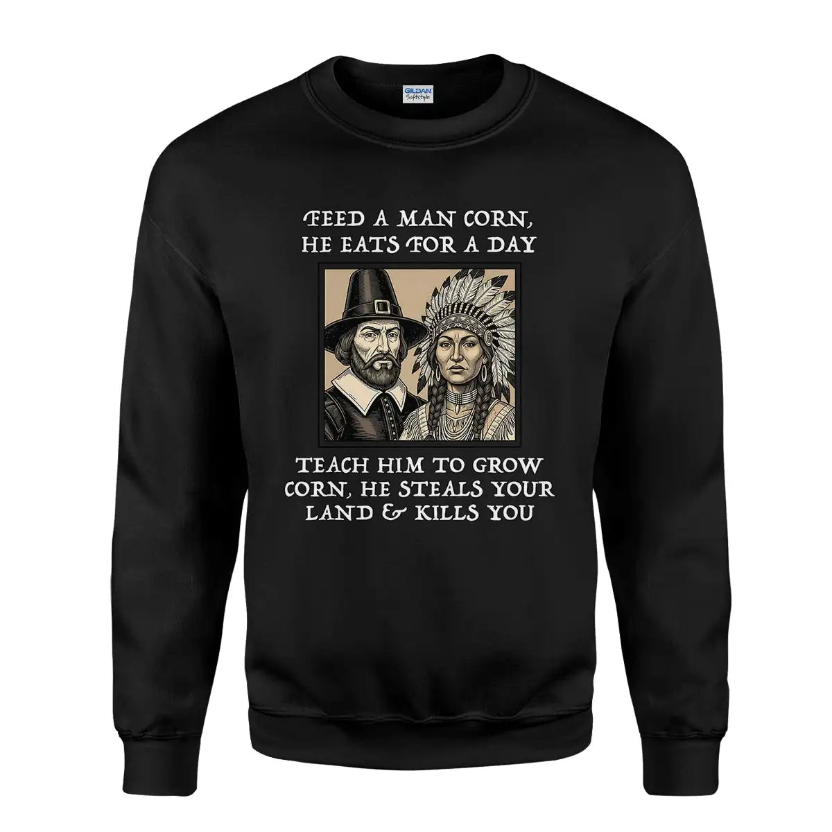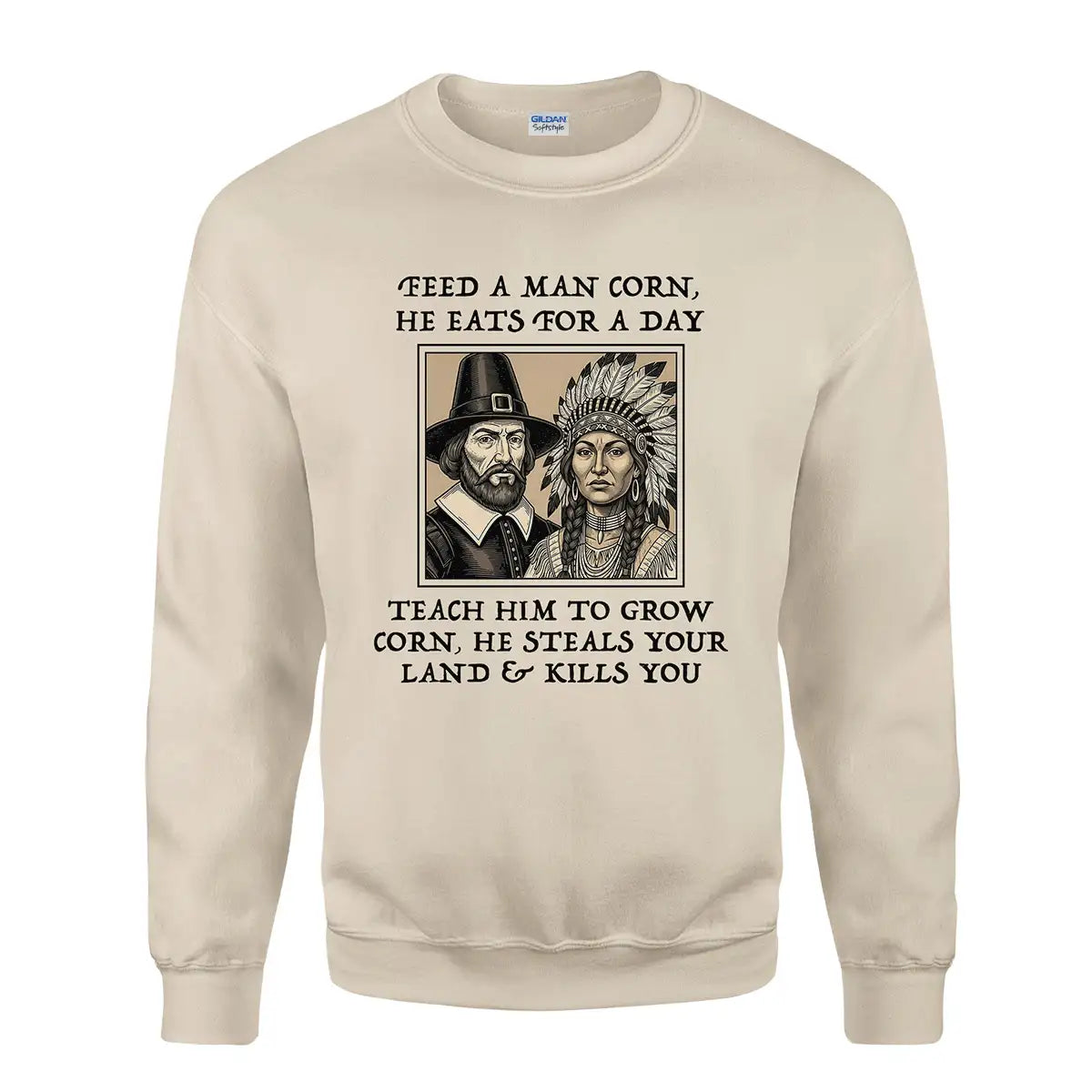"Feed A Man Corn" Quote Sweatshirt, Tribal Chief and Pilgrim Graphic Design