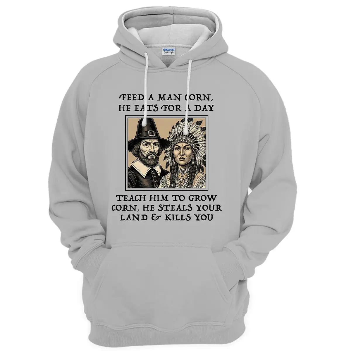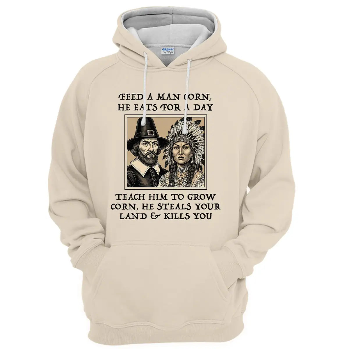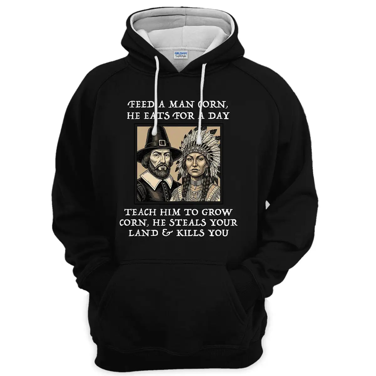 This hoodie delivers a powerful historic message with the quote “Feed a man corn, he eats for a day. Teach him to grow corn, he steals your land and kills you.” The artwork features a tribal chief and a pilgrim side by side, reflecting the early encounters between indigenous tribes and settlers. The design highlights themes of generosity, betrayal, and resilience, reminding us of the struggles Native people endured. Soft, warm, and comfortable, this hoodie is more than just clothing, it is a meaningful statement on heritage and truth. Ideal for cultural events, gatherings, or everyday wear with purpose.