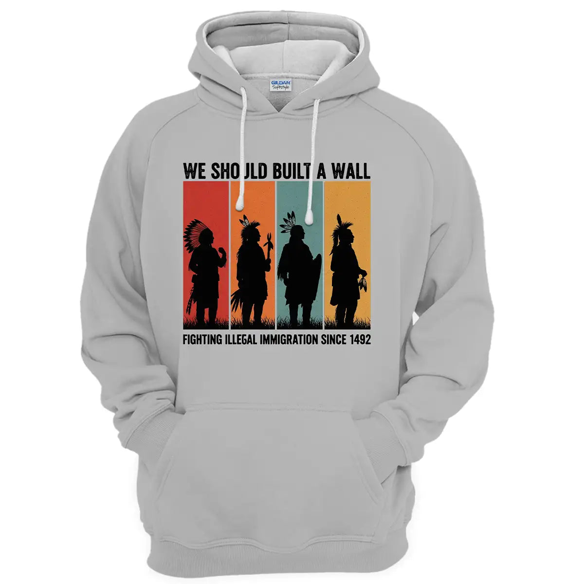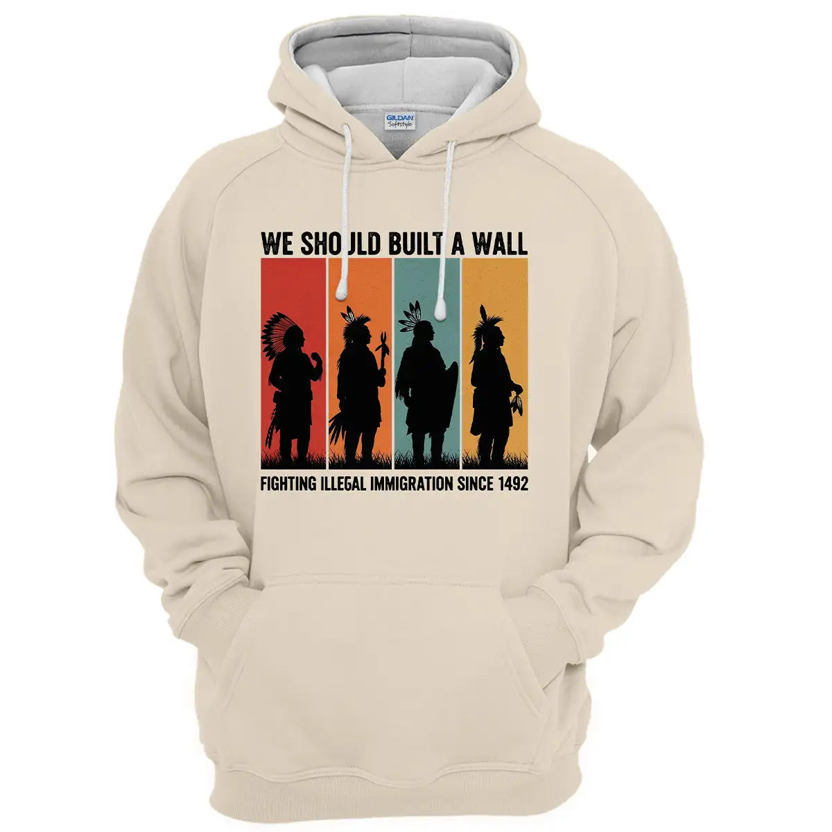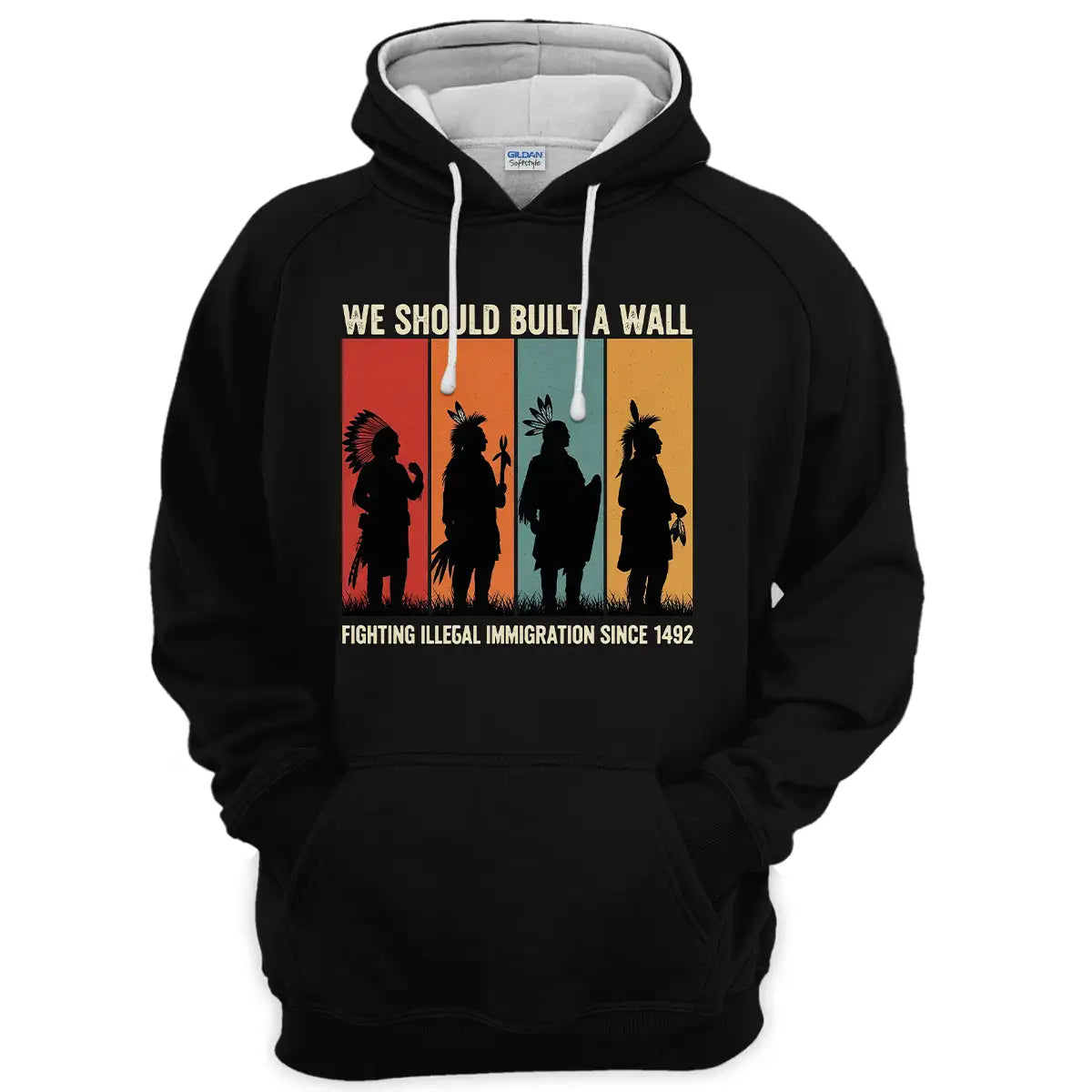 This hoodie showcases a bold cultural message with the striking quote “We Should Built A Wall Fighting Illegal Immigration Since 1492.” The design features four warrior silhouettes from Native tribes, displayed against vintage color blocks that symbolize resilience and history. Each figure reflects the deep connection between indigenous people and their homeland, representing strength, unity, and survival. Comfortable and warm, this hoodie is more than fashion, it is a meaningful statement about heritage and identity. Ideal for those who value individuality, freedom, and a voice rooted in history, it is perfect for casual wear, gatherings, or sparking thoughtful conversations.