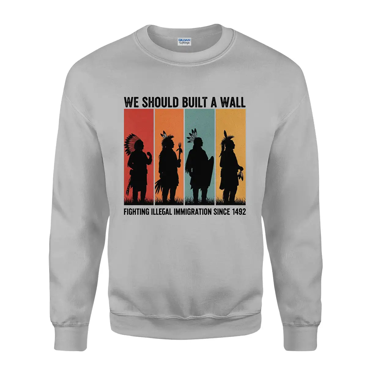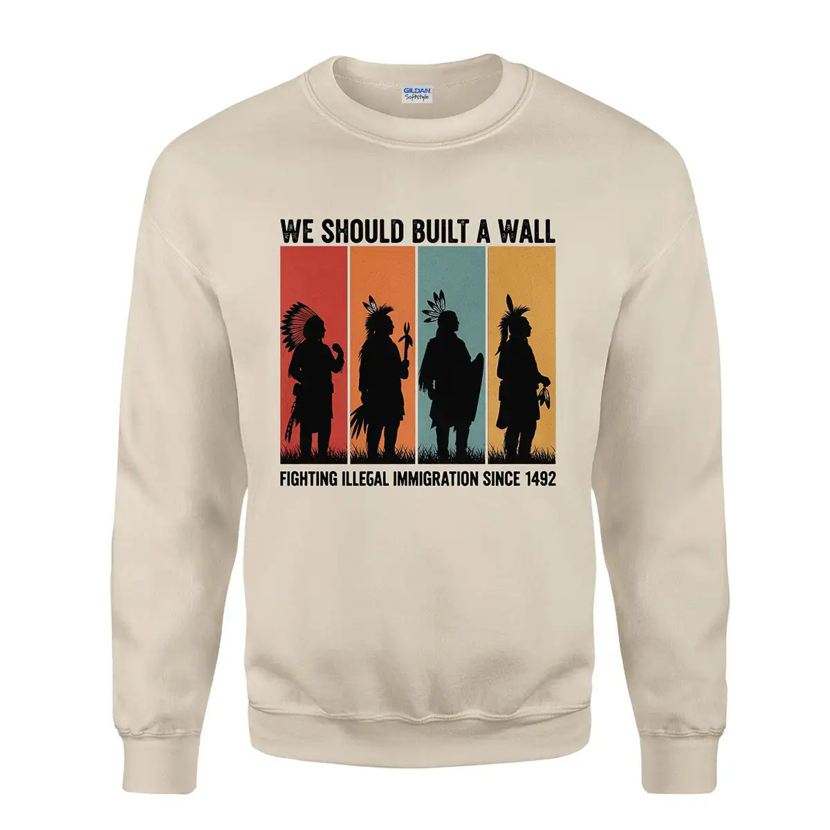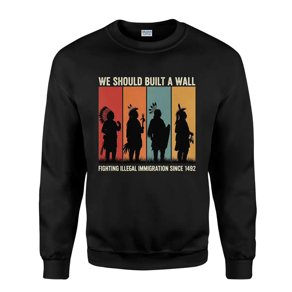 This hoodie showcases a bold cultural message with the striking quote “We Should Built A Wall Fighting Illegal Immigration Since 1492.” The design features four warrior silhouettes from Native tribes, displayed against vintage color blocks that symbolize resilience and history. Each figure reflects the deep connection between indigenous people and their homeland, representing strength, unity, and survival. Comfortable and warm, this hoodie is more than fashion, it is a meaningful statement about heritage and identity. Ideal for those who value individuality, freedom, and a voice rooted in history, it is perfect for casual wear, gatherings, or sparking thoughtful conversations.
