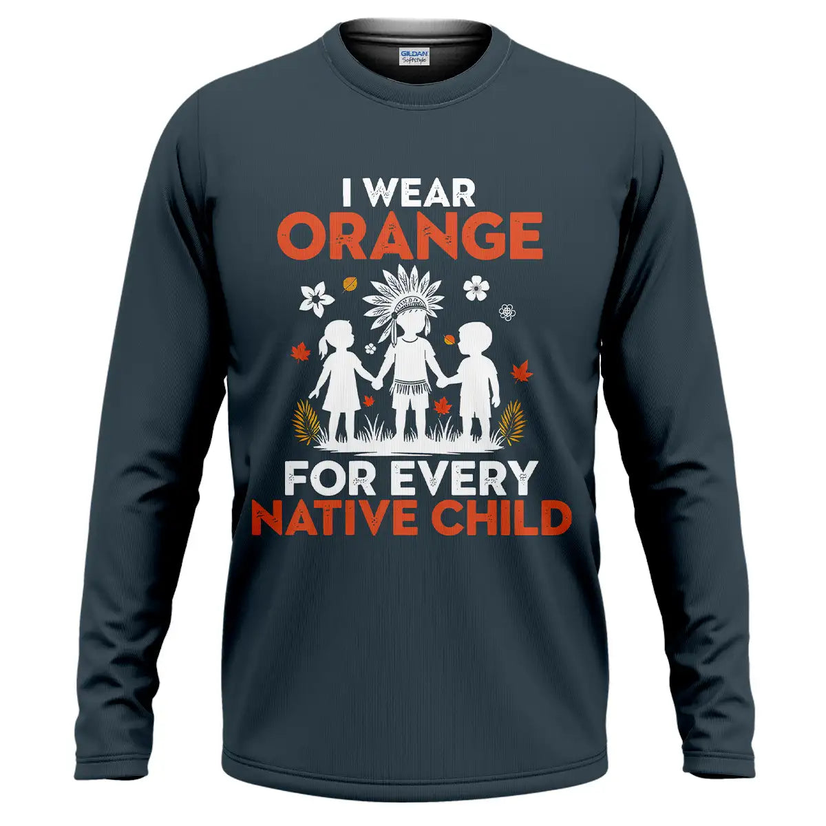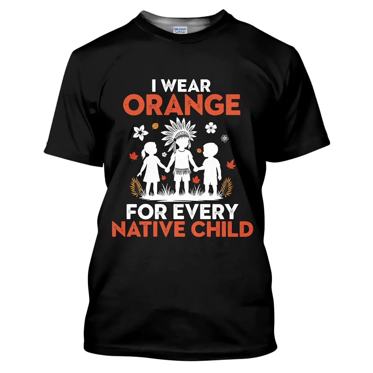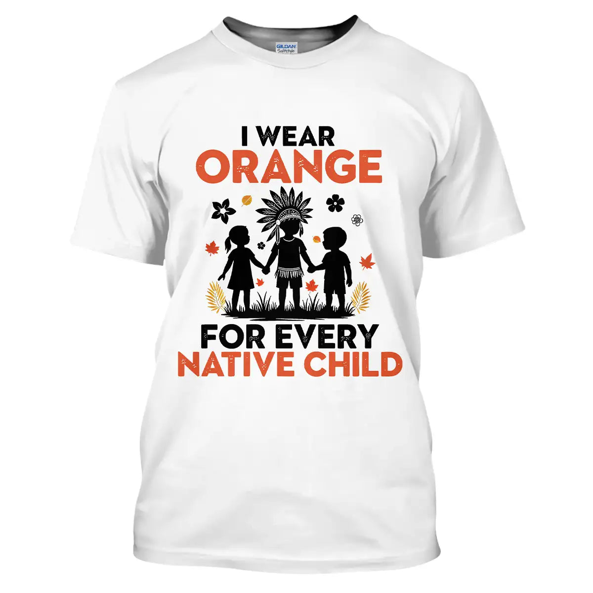 This T-shirt carries a powerful message with the quote "I Wear Orange For Every Native Child." The design features silhouettes of children holding hands, surrounded by leaves and flowers, with orange details symbolizing awareness and remembrance. Inspired by the traditions of Native America communities that emphasize unity, resilience, and honoring children, this shirt is both meaningful and wearable. Made from high-quality fabric, it ensures comfort while spreading a message of compassion and solidarity. Ideal for awareness events, memorial days, or daily wear, this shirt is more than clothing—it is a statement of respect, remembrance, and hope for future generations.