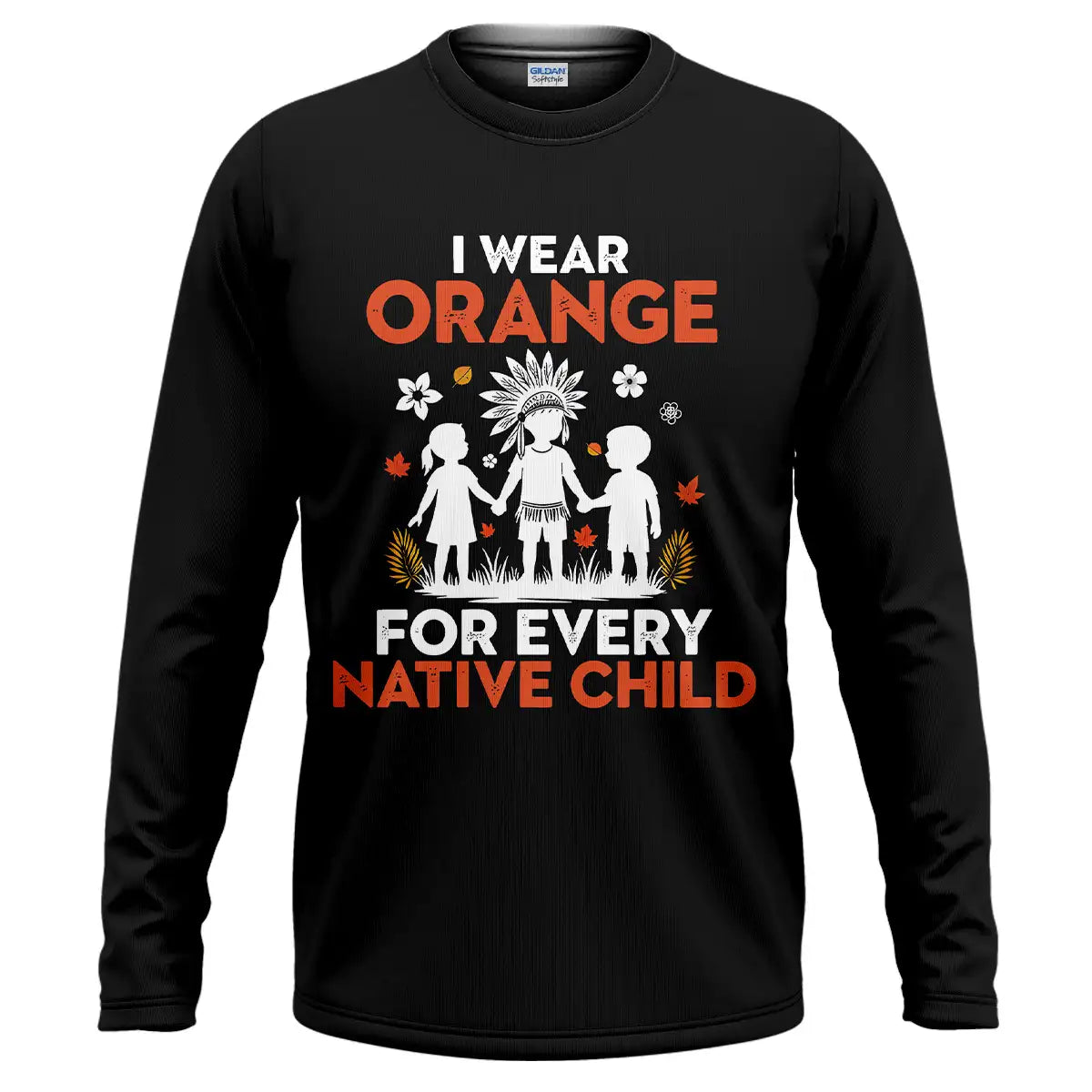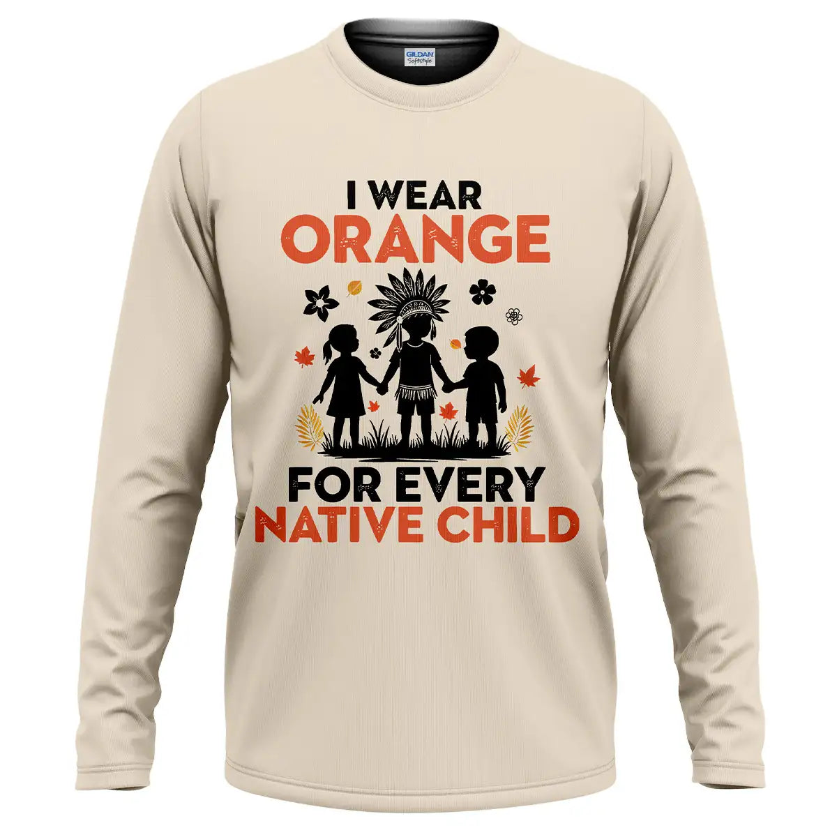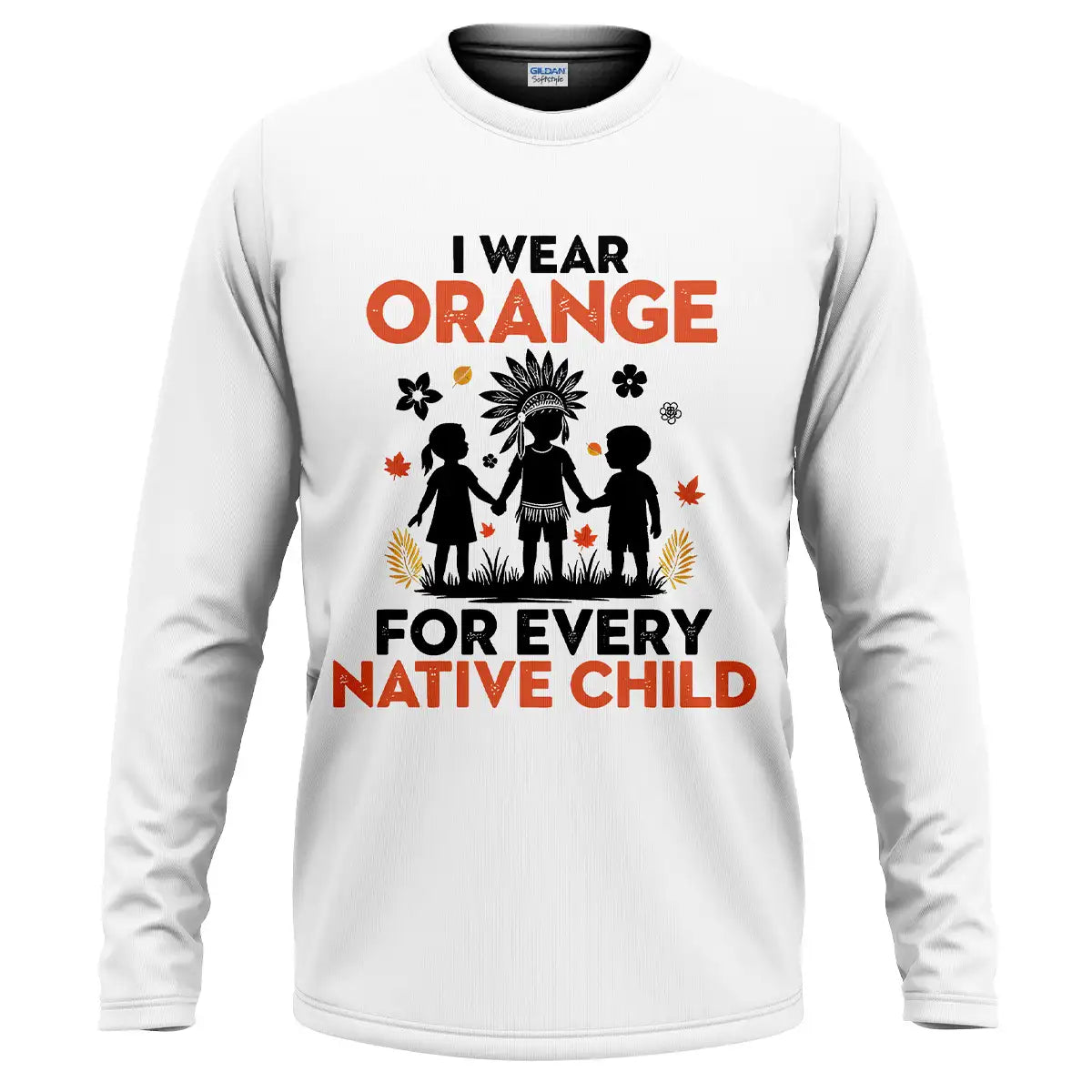 This T-shirt carries a powerful message with the quote "I Wear Orange For Every Native Child." The design features silhouettes of children holding hands, surrounded by leaves and flowers, with orange details symbolizing awareness and remembrance. Inspired by the traditions of Native America communities that emphasize unity, resilience, and honoring children, this shirt is both meaningful and wearable. Made from high-quality fabric, it ensures comfort while spreading a message of compassion and solidarity. Ideal for awareness events, memorial days, or daily wear, this shirt is more than clothing—it is a statement of respect, remembrance, and hope for future generations.