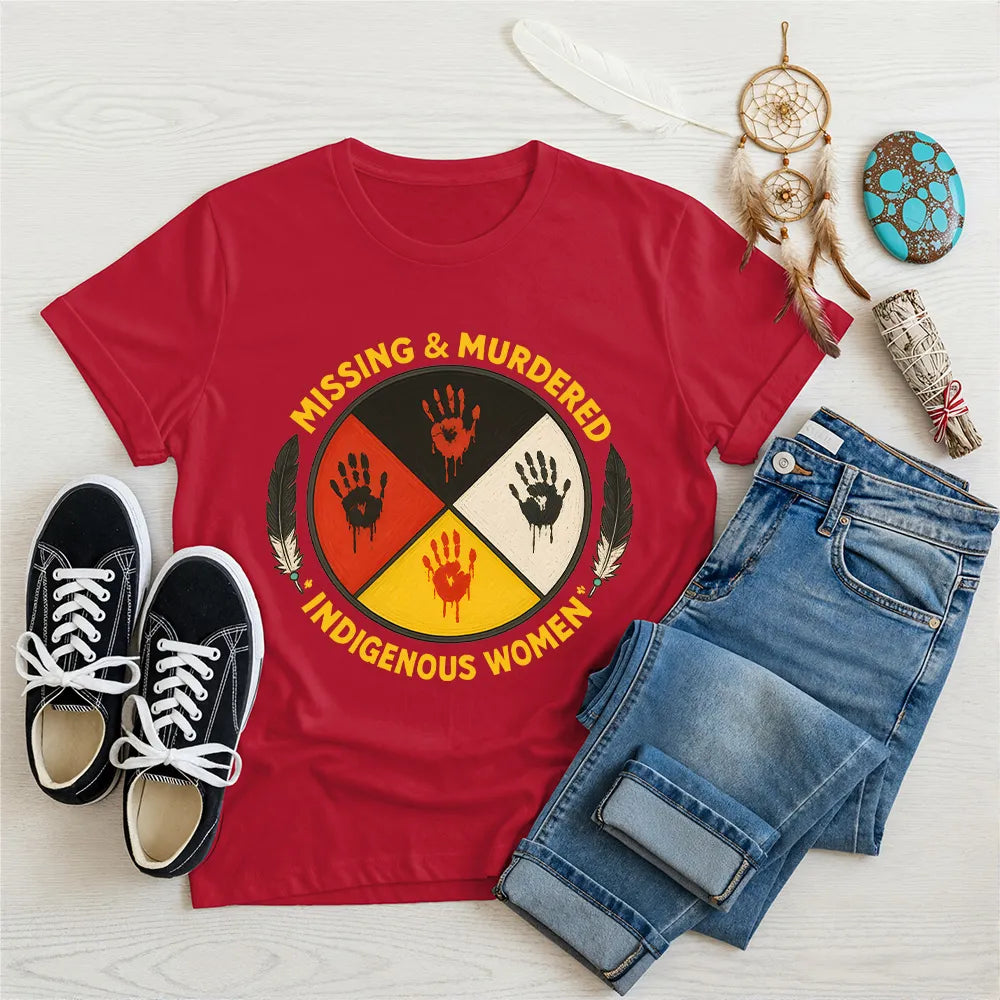This Native America-designed t-shirt features a compelling graphic that speaks to the Missing & Murdered Indigenous Women (MMIW) movement. With handprints in red, yellow, black, and white, the design symbolically acknowledges the need for justice and the recognition of indigenous women who have been affected by violence. Designed for those who stand in solidarity and raise awareness, this shirt is a tribute to the courage of indigenous communities. Wear it proudly to honor their stories and contribute to the ongoing conversation for change. Ideal for anyone looking to show support and keep the issue visible.