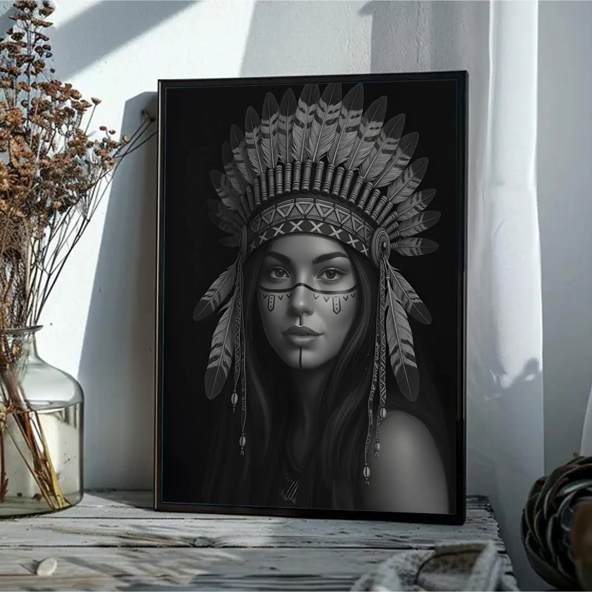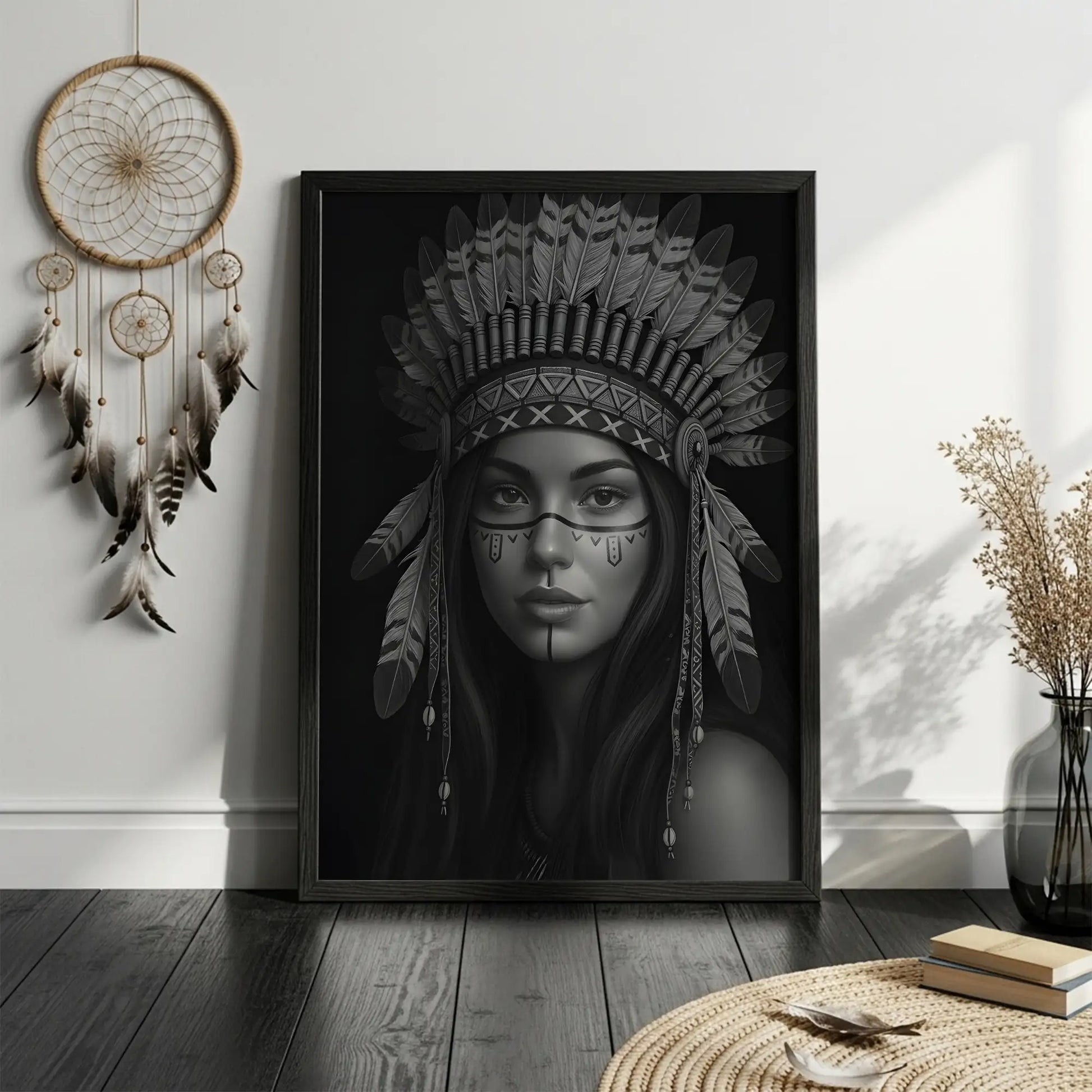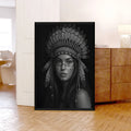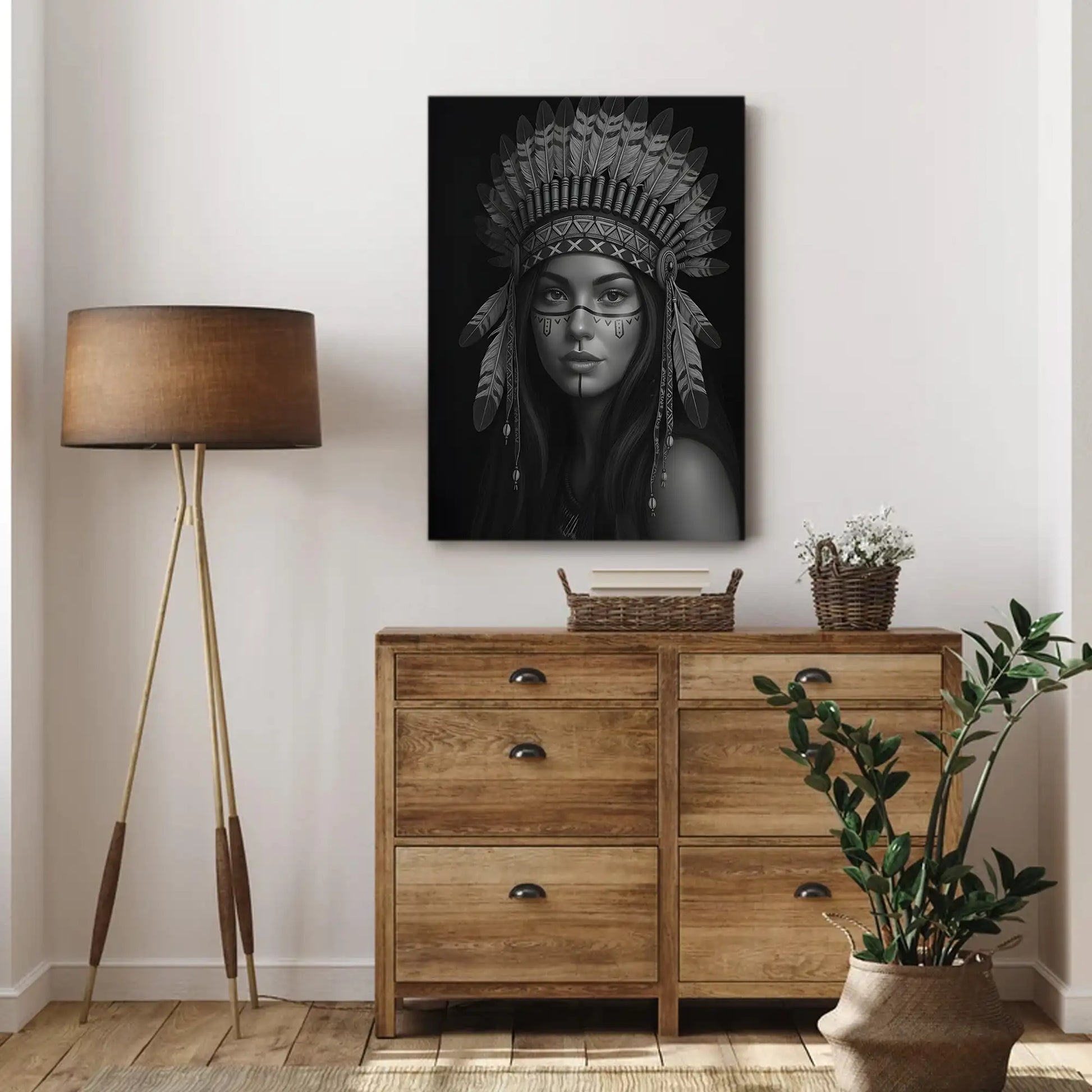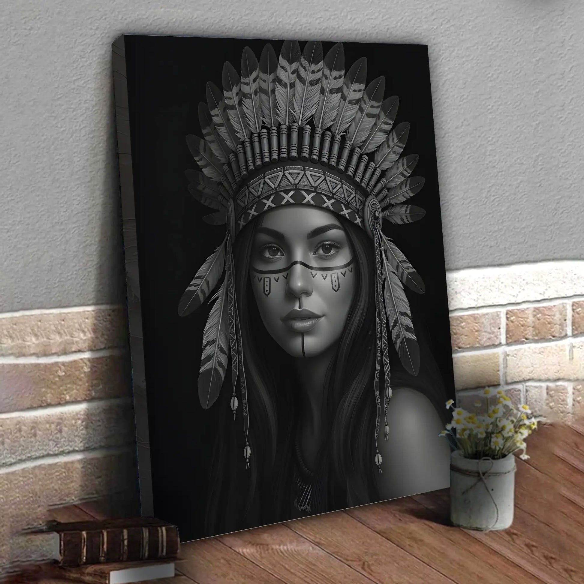 This stunning canvas wall art portrays the powerful image of an Indigenous woman adorned with a traditional feather headdress, representing wisdom, resilience, and cultural identity. The detailed black-and-white portrait emphasizes her strength and beauty, highlighting symbolic tribal face paint and ceremonial attire. Inspired by Native American heritage, this artwork carries deep spiritual meaning, reminding us of the sacred connection between people and tradition. Perfect as a statement piece in living rooms, offices, or art collections, it embodies pride, history, and timeless elegance. A meaningful decor choice for anyone who values cultural heritage and artistic craftsmanship.
