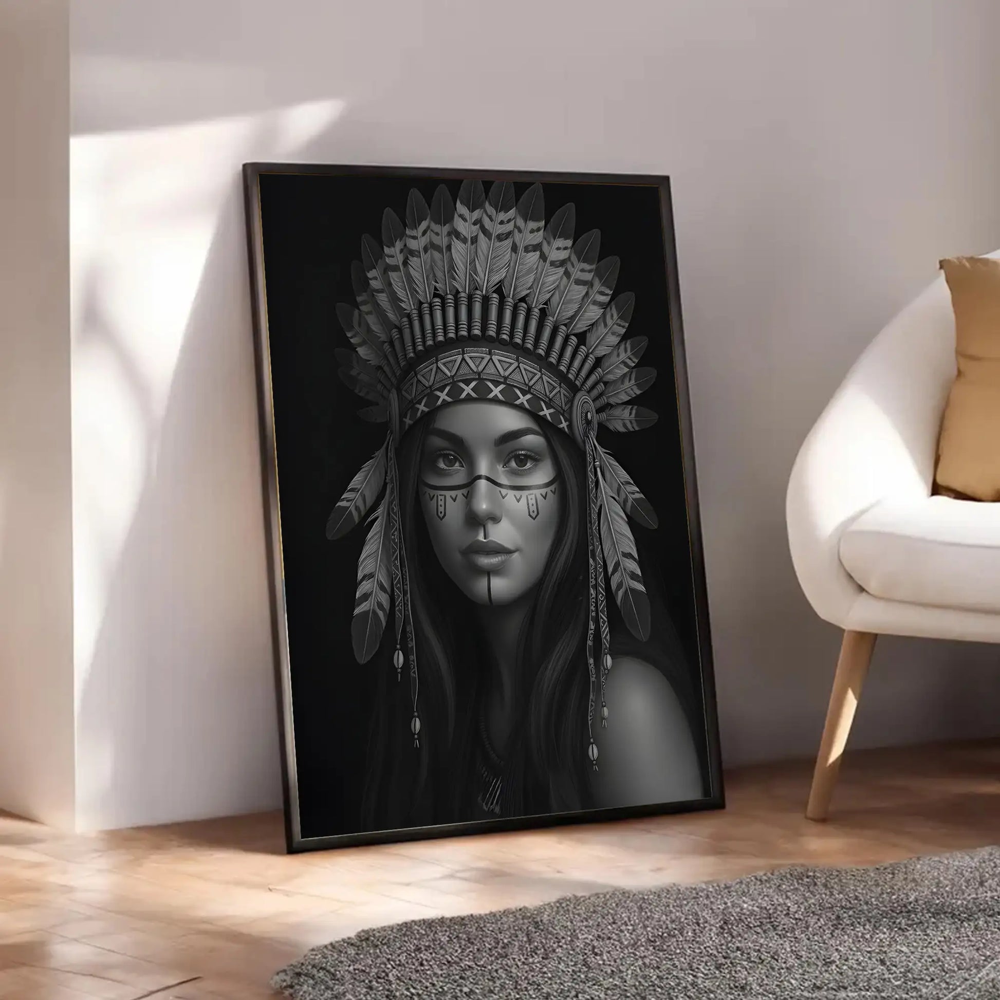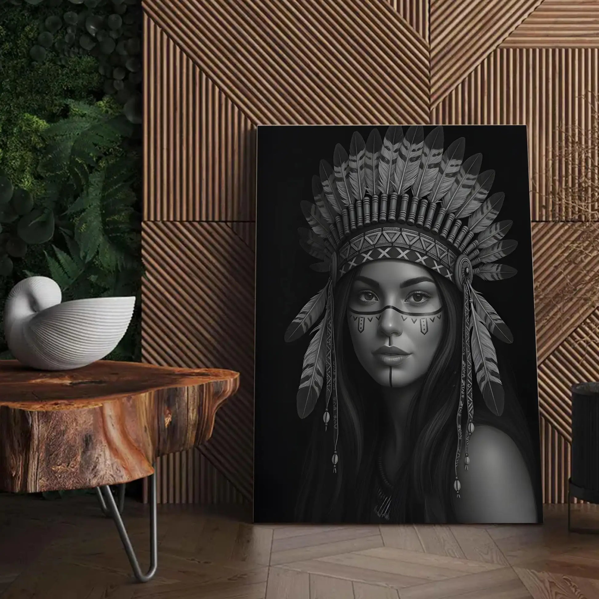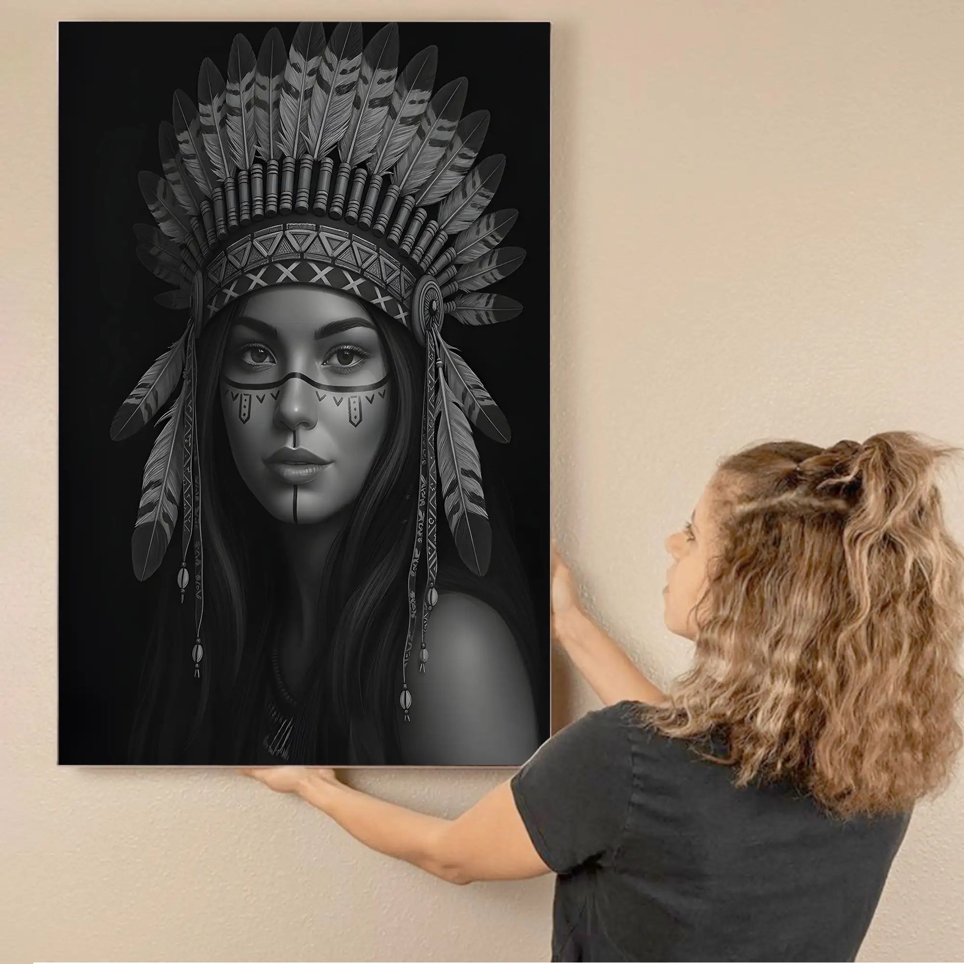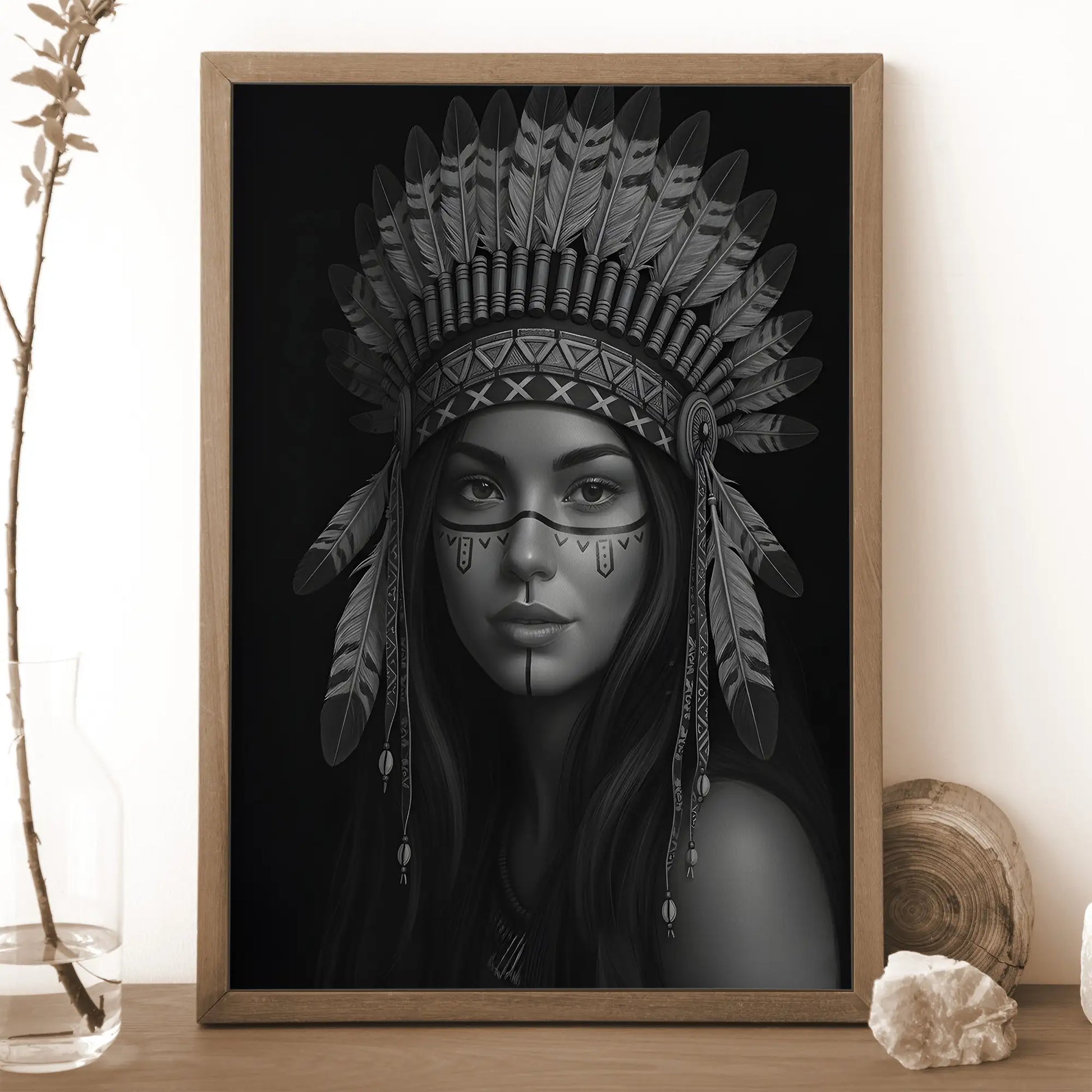 This stunning canvas wall art portrays the powerful image of an Indigenous woman adorned with a traditional feather headdress, representing wisdom, resilience, and cultural identity. The detailed black-and-white portrait emphasizes her strength and beauty, highlighting symbolic tribal face paint and ceremonial attire. Inspired by Native American heritage, this artwork carries deep spiritual meaning, reminding us of the sacred connection between people and tradition. Perfect as a statement piece in living rooms, offices, or art collections, it embodies pride, history, and timeless elegance. A meaningful decor choice for anyone who values cultural heritage and artistic craftsmanship.