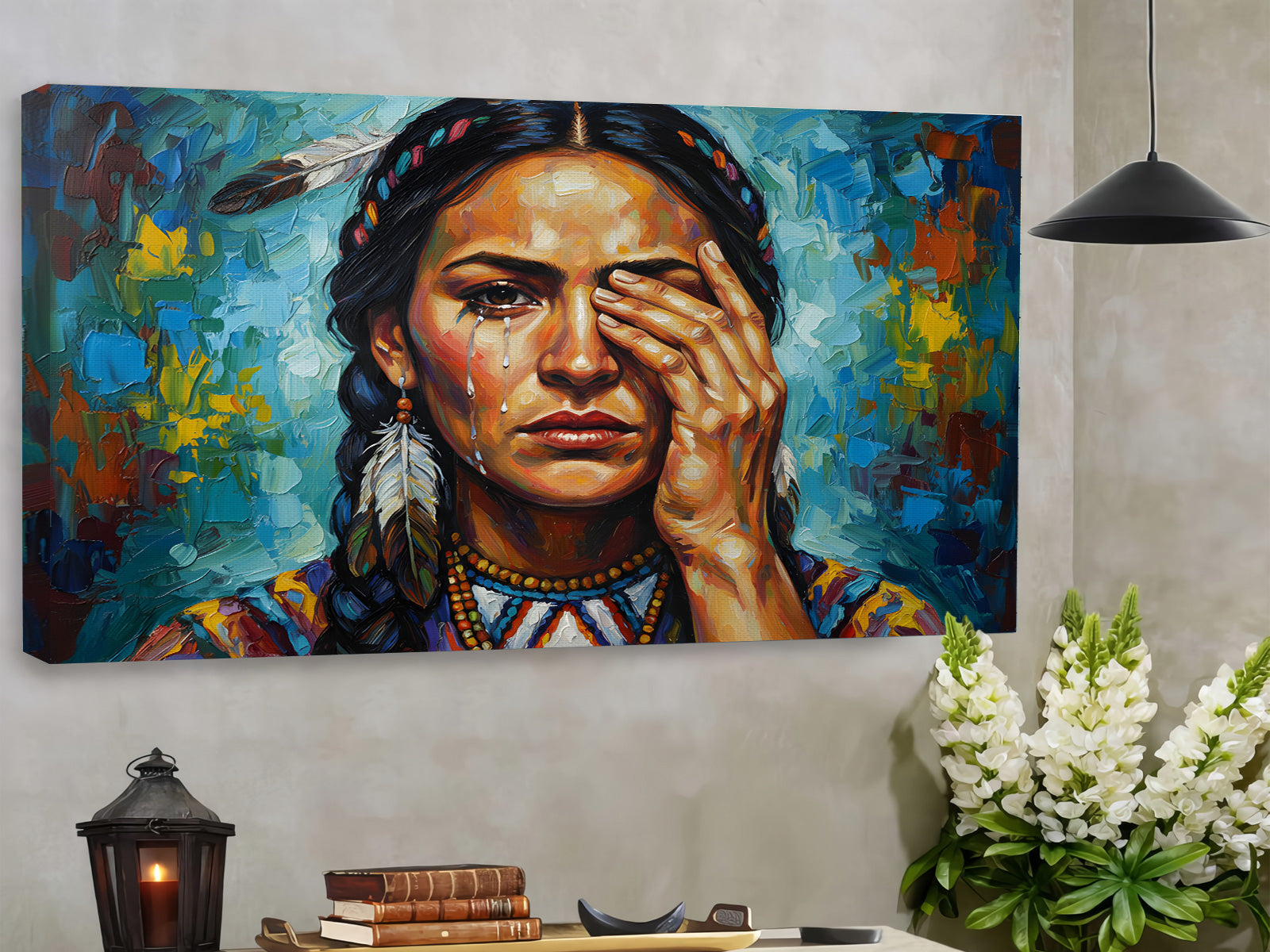 Native America Woman Tears, Colorful Expression Canvas Wall Art