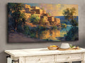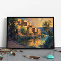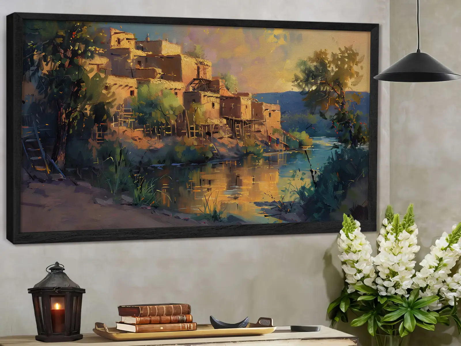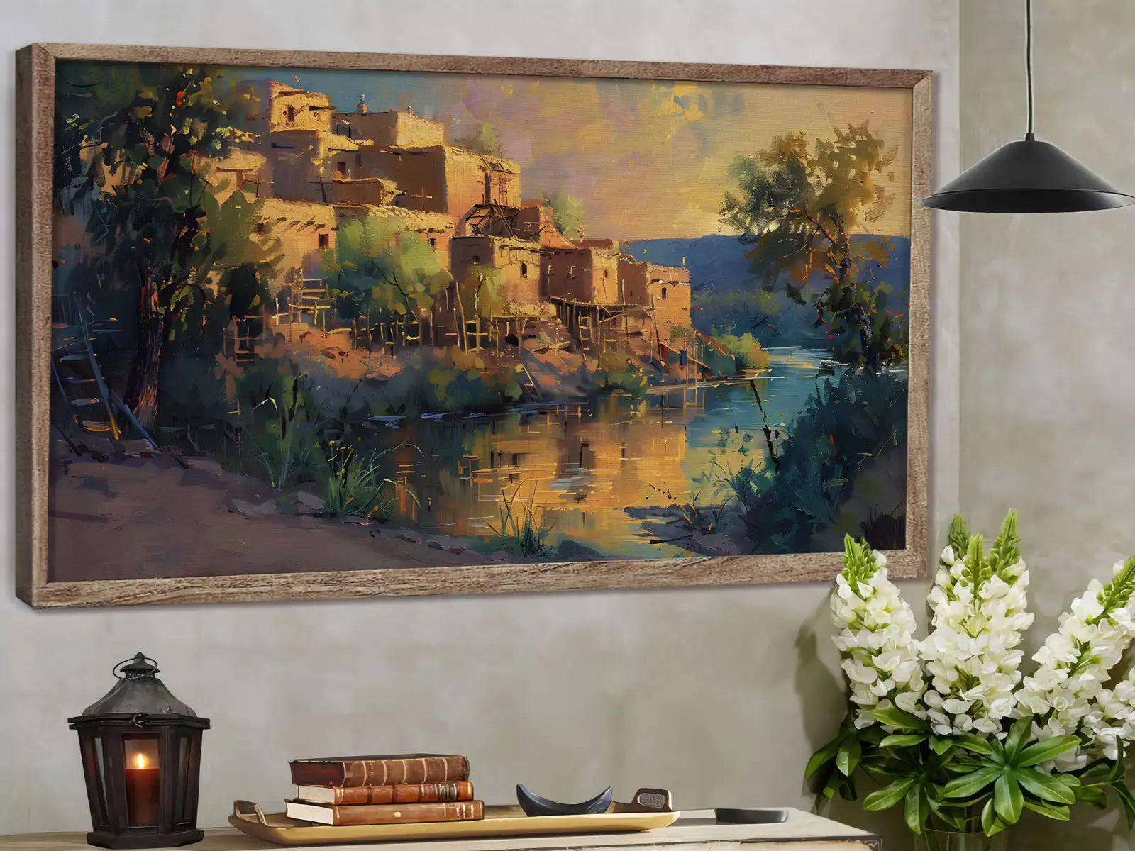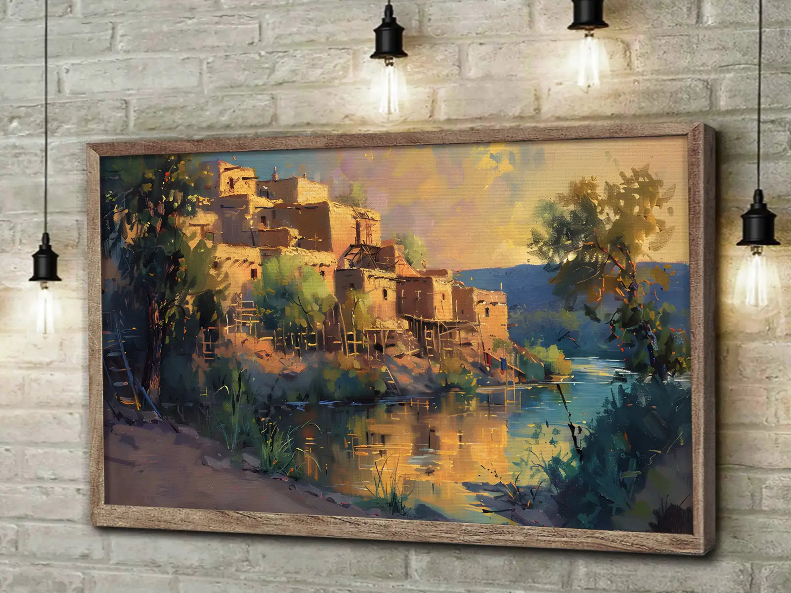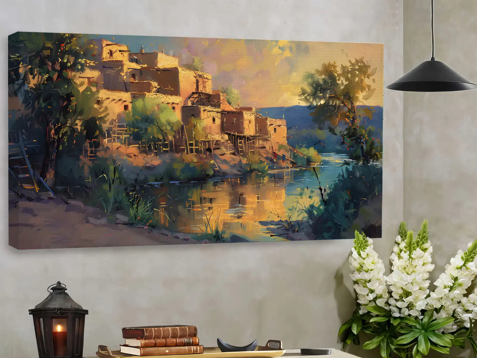 This Native American canvas wall art beautifully illustrates a Pueblo village bathed in golden sunlight beside a peaceful river. The adobe structures reflect centuries of tradition and harmony with nature, capturing the resilience and artistry of Indigenous communities in the Southwest. With earthy tones and vibrant reflections on the water, this piece conveys serenity and cultural heritage, making it a meaningful addition to any living room, office, or gallery wall. Inspired by the ancestral homes of the Pueblo people, it tells a story of strength, community, and the sacred bond between land, water, and spirit.