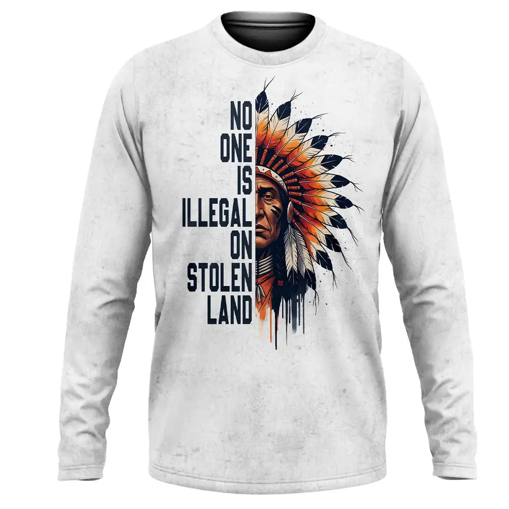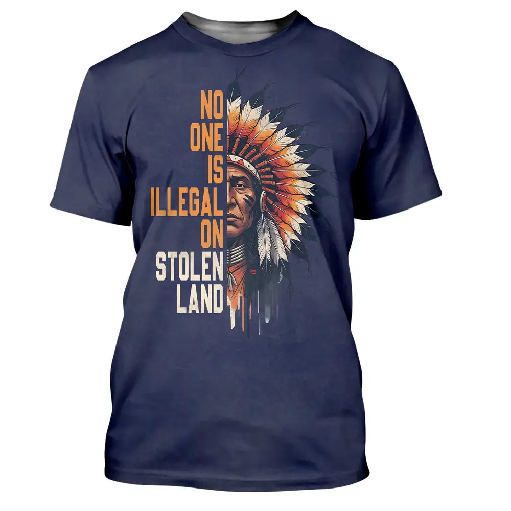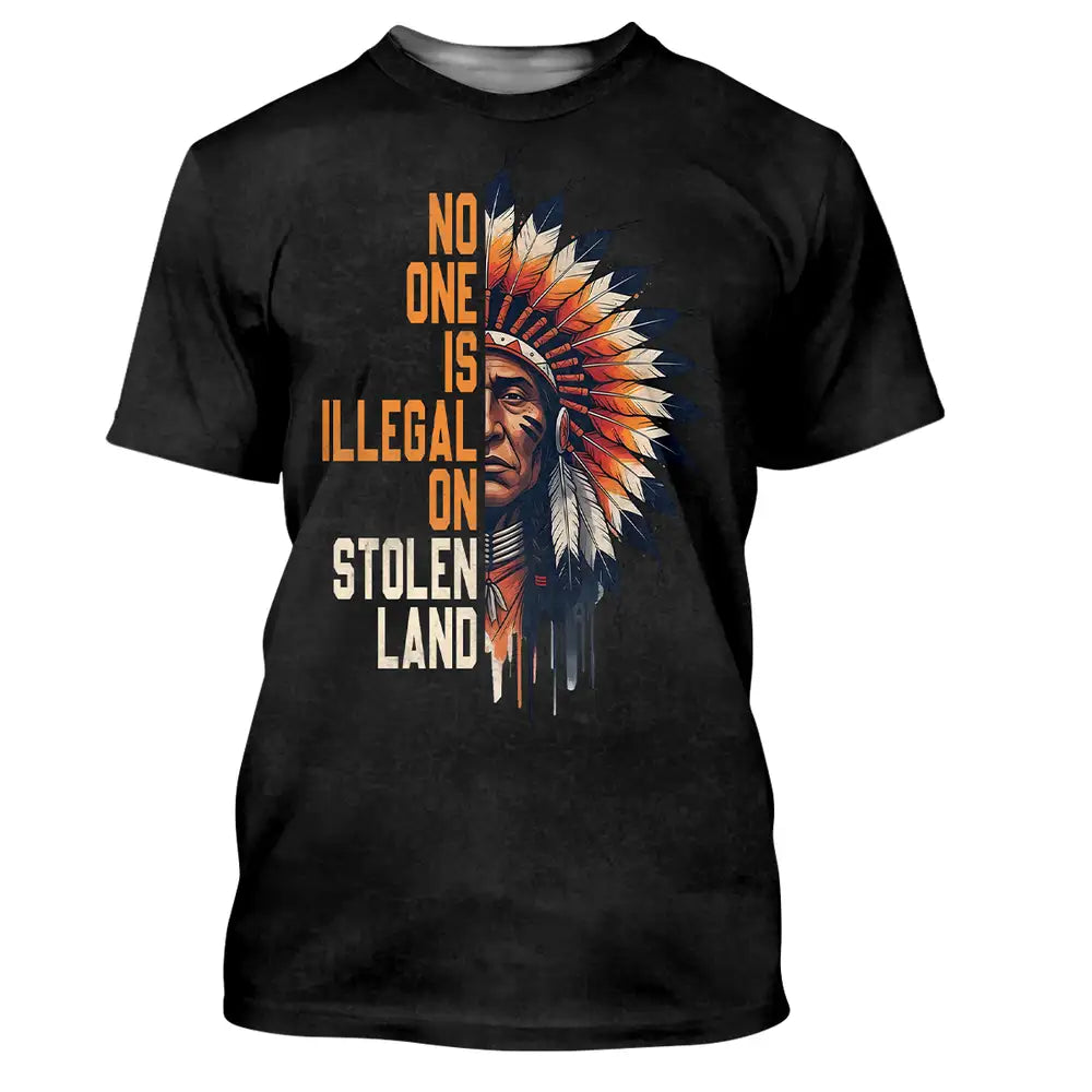 designed by the resilience and pride of Native American tribes, this “No One Is Illegal On Stolen Land” shirt delivers a powerful statement about justice and history. The design features a striking image of a chief wearing an elaborate feathered headdress, with bold orange, red, and white tones contrasting against the deep black background. More than just apparel, it’s a cultural declaration that embodies strength and heritage. Perfect for everyday wear, cultural events, or as a meaningful gift for someone who values bold style and deep historical significance.