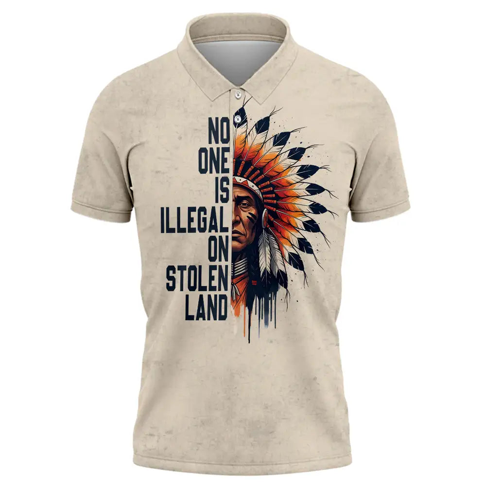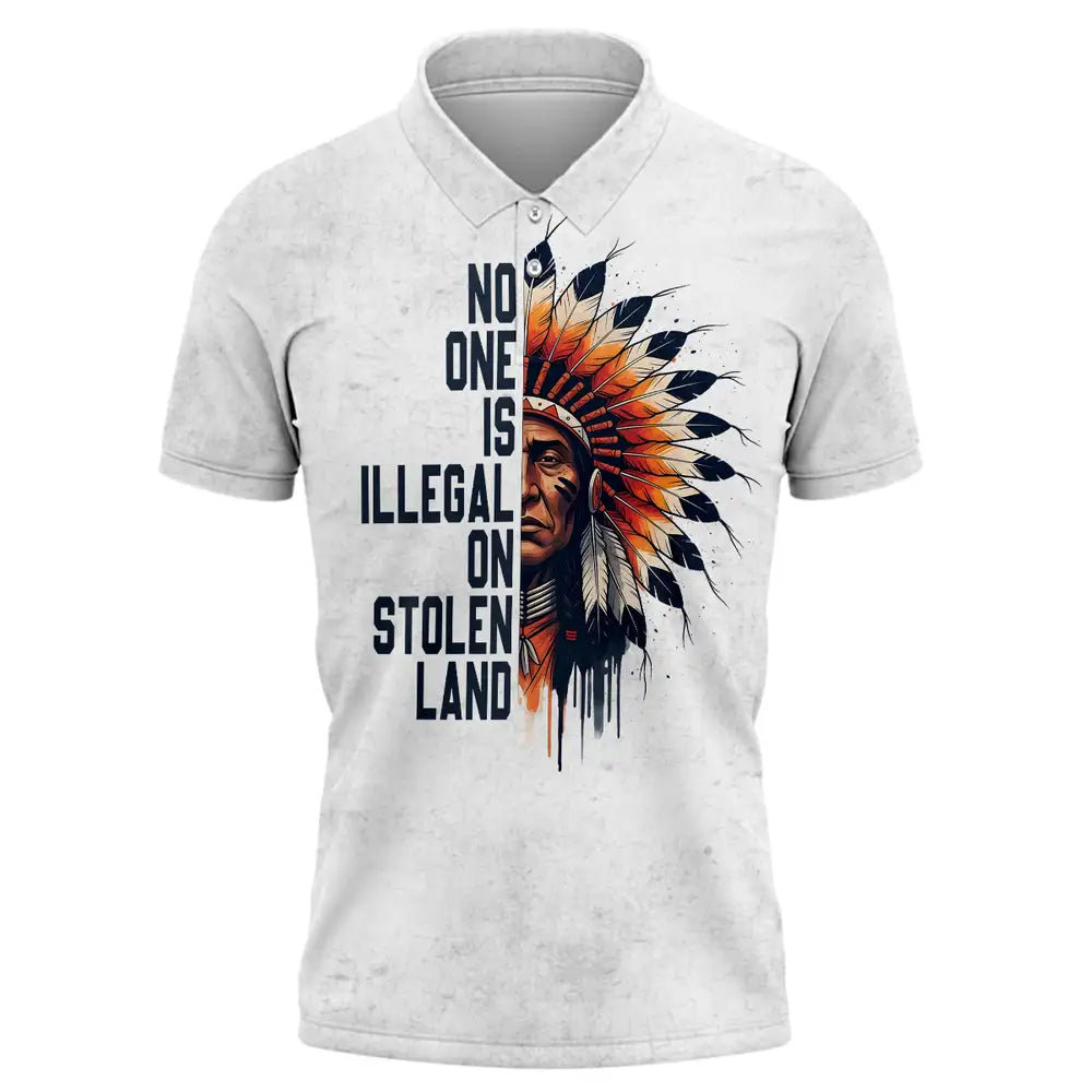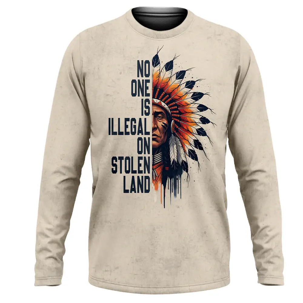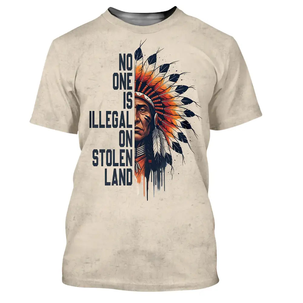 designed by the resilience and pride of Native American tribes, this “No One Is Illegal On Stolen Land” shirt delivers a powerful statement about justice and history. The design features a striking image of a chief wearing an elaborate feathered headdress, with bold orange, red, and white tones contrasting against the deep black background. More than just apparel, it’s a cultural declaration that embodies strength and heritage. Perfect for everyday wear, cultural events, or as a meaningful gift for someone who values bold style and deep historical significance.