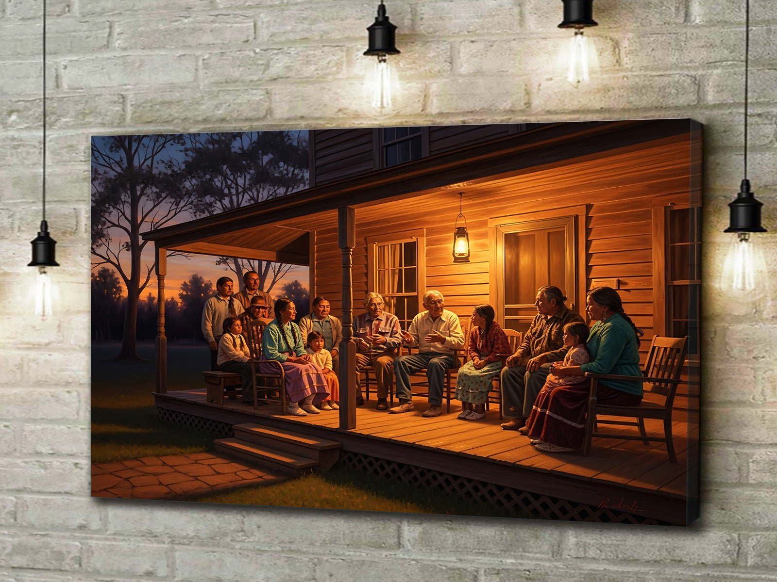 Native American Family Gathering Canvas Wall Art, Evening Porch Scene