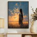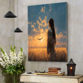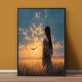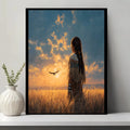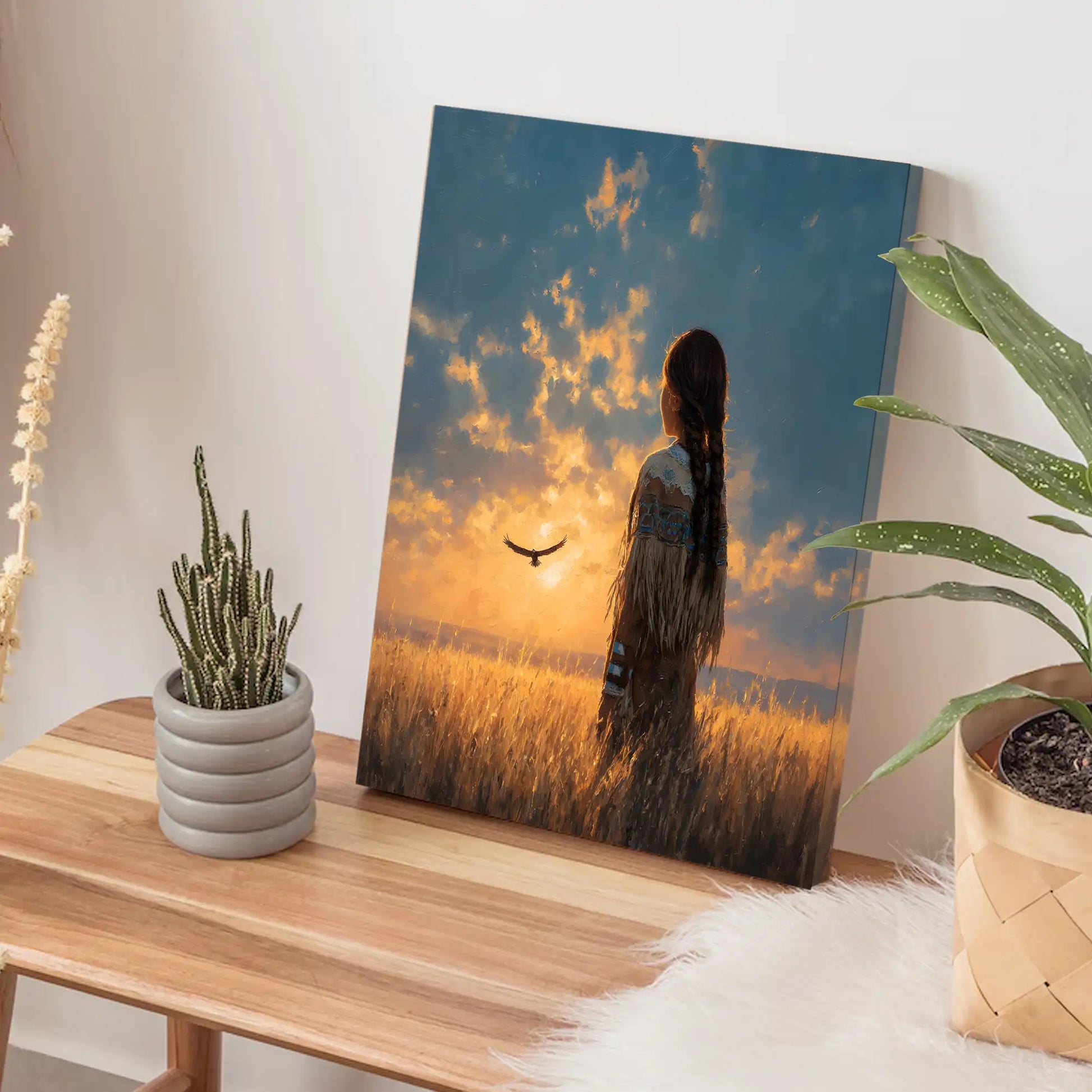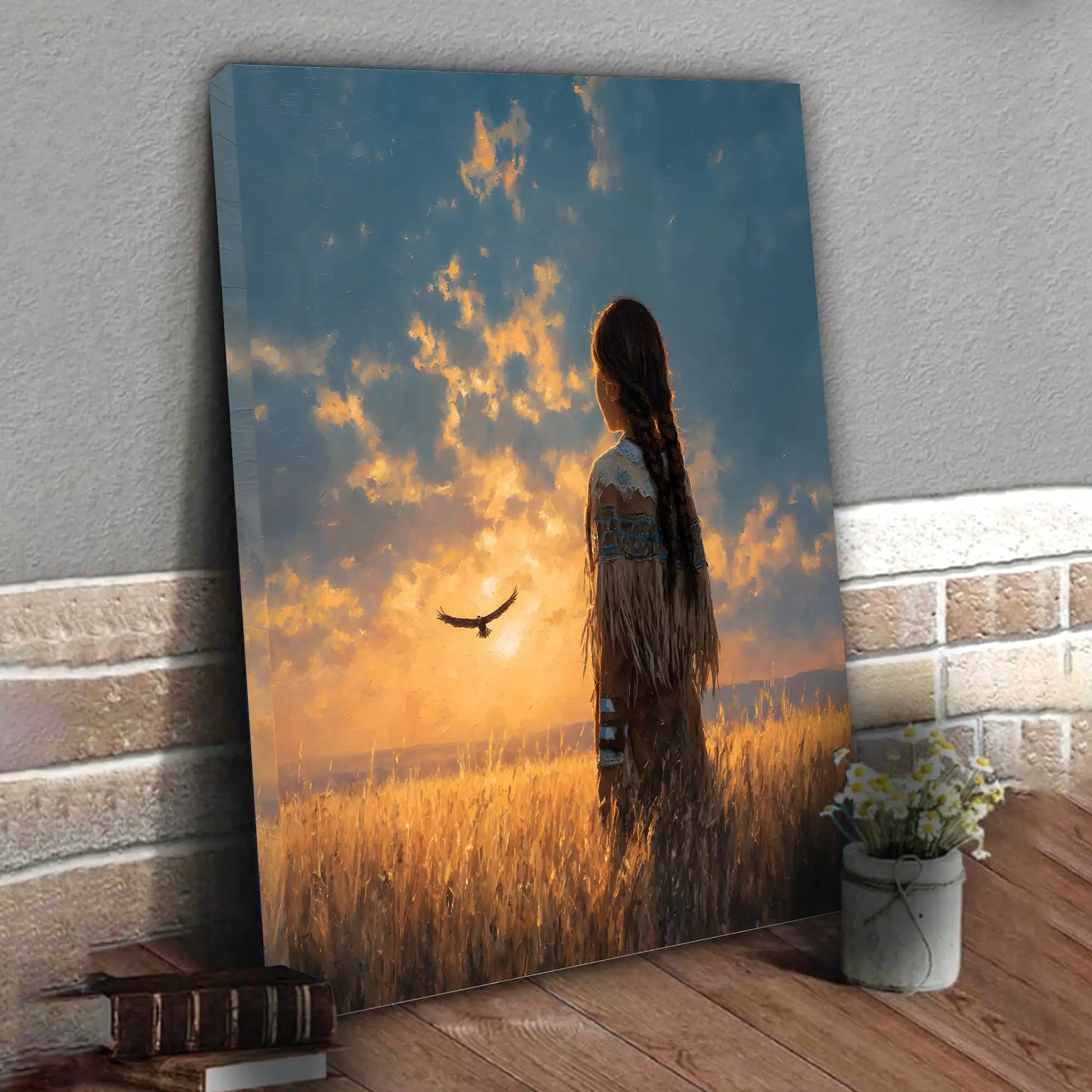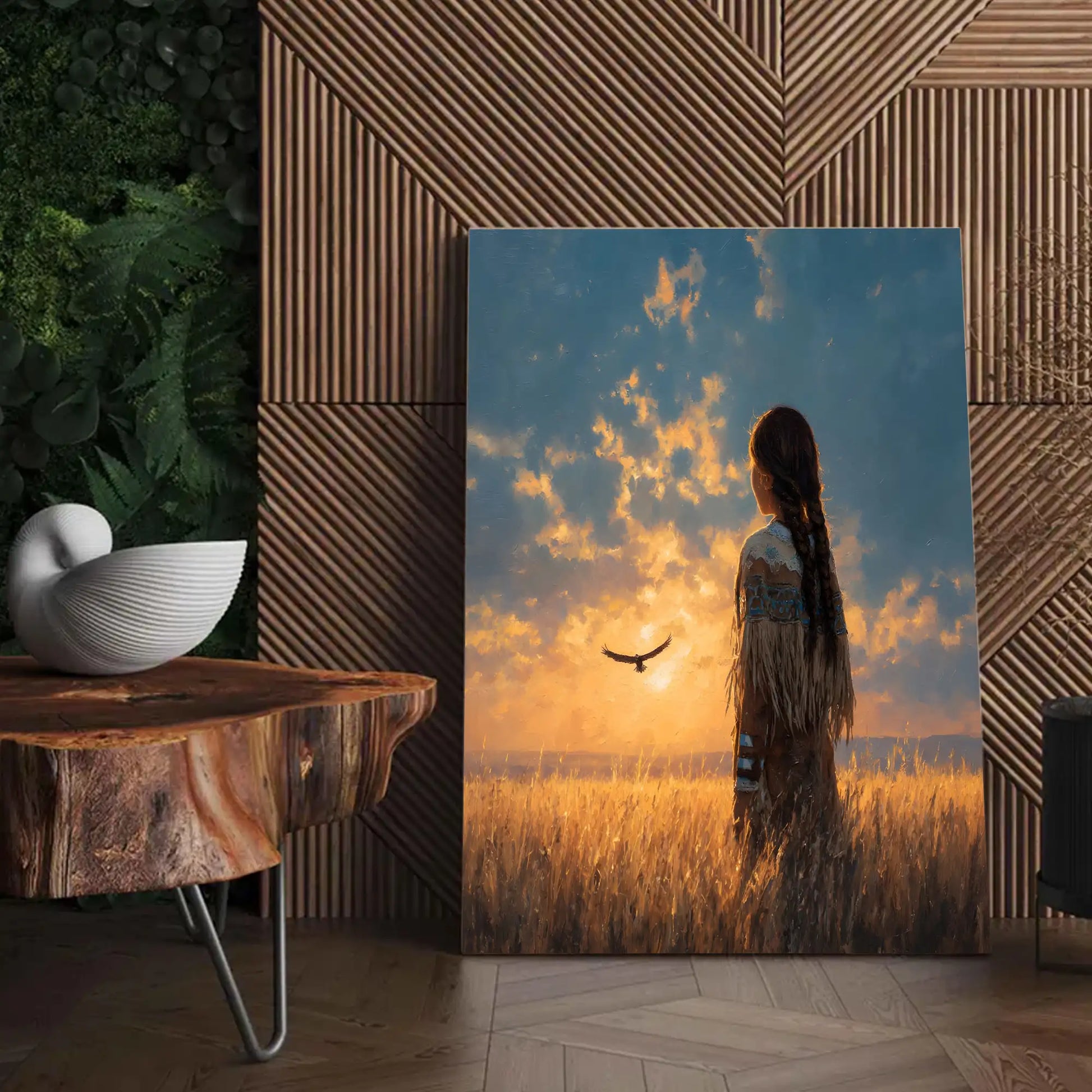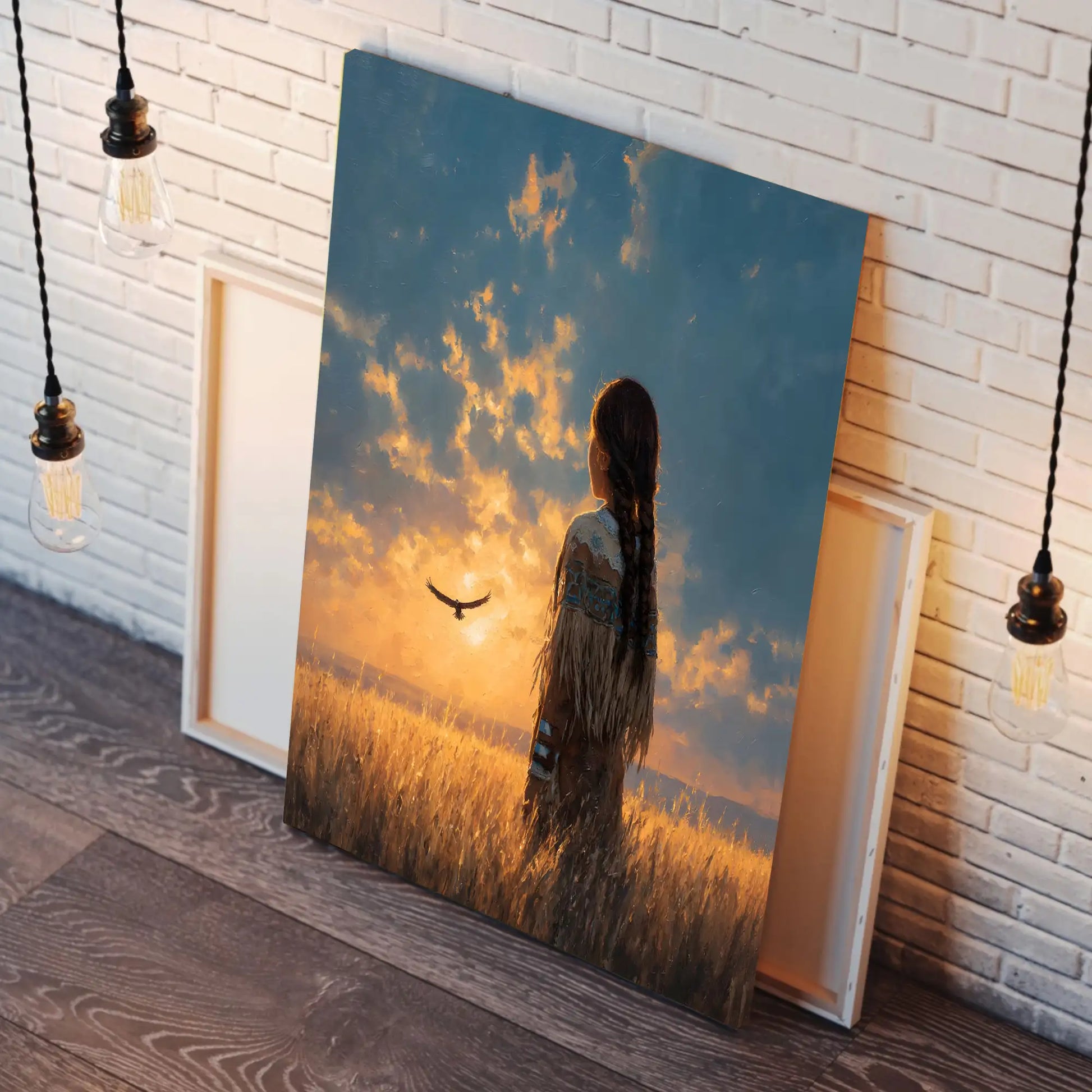This stunning wall art captures the spirit of the Great Plains, portraying a young girl standing in a golden field as the sun sets behind her. Her braided hair and traditional attire reflect the heritage of the Lakota people, known for their deep connection to nature and the sacred symbolism of the eagle. The soaring eagle represents freedom, vision, and a spiritual messenger between earth and sky. The warm glow of the sunset emphasizes harmony with the land and invites reflection. Perfect for home or office, this canvas brings meaning, serenity, and cultural depth to any space.