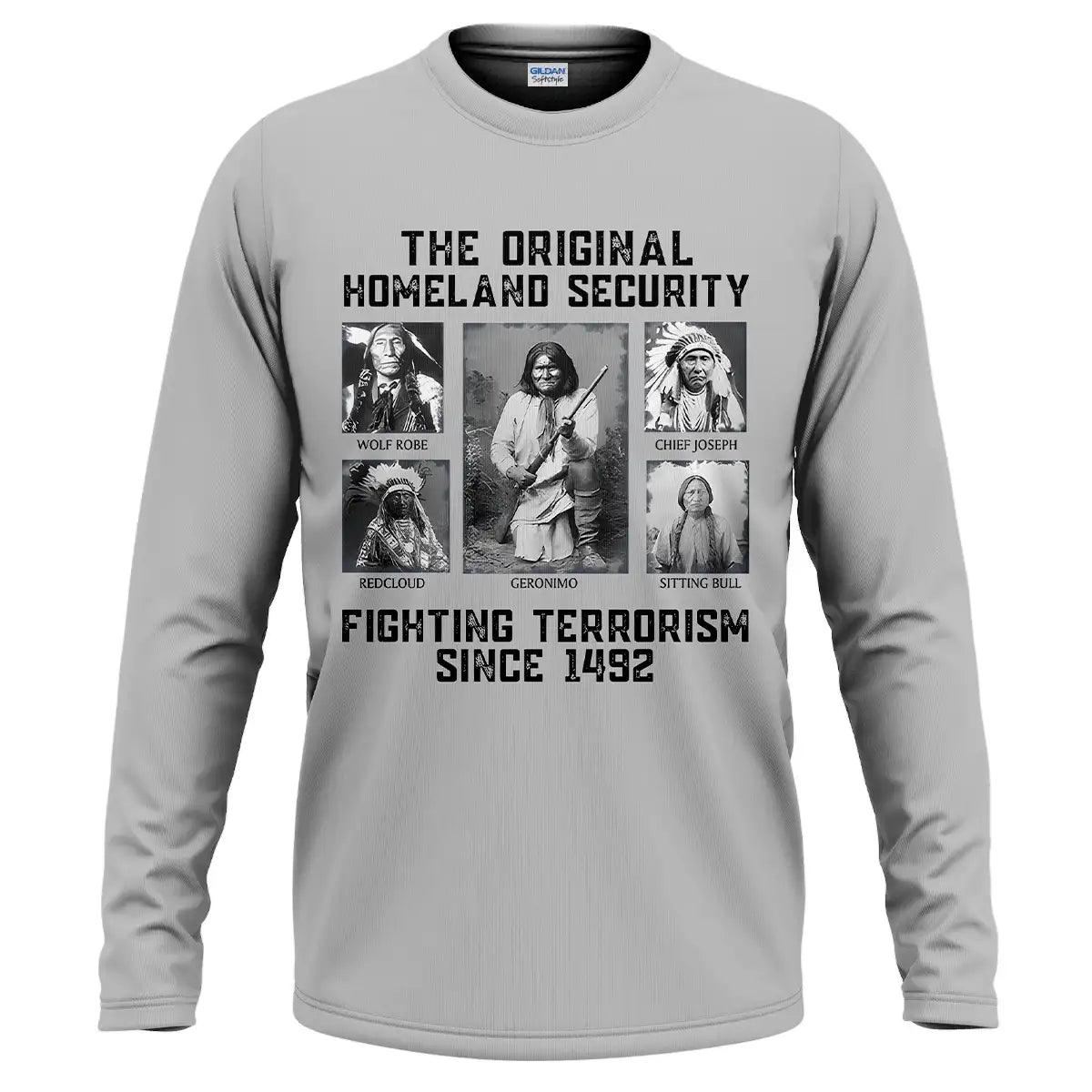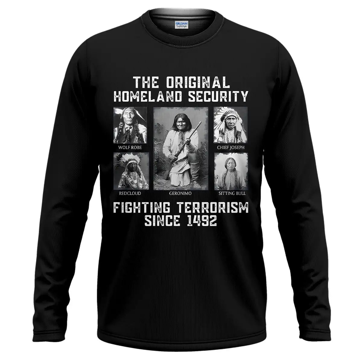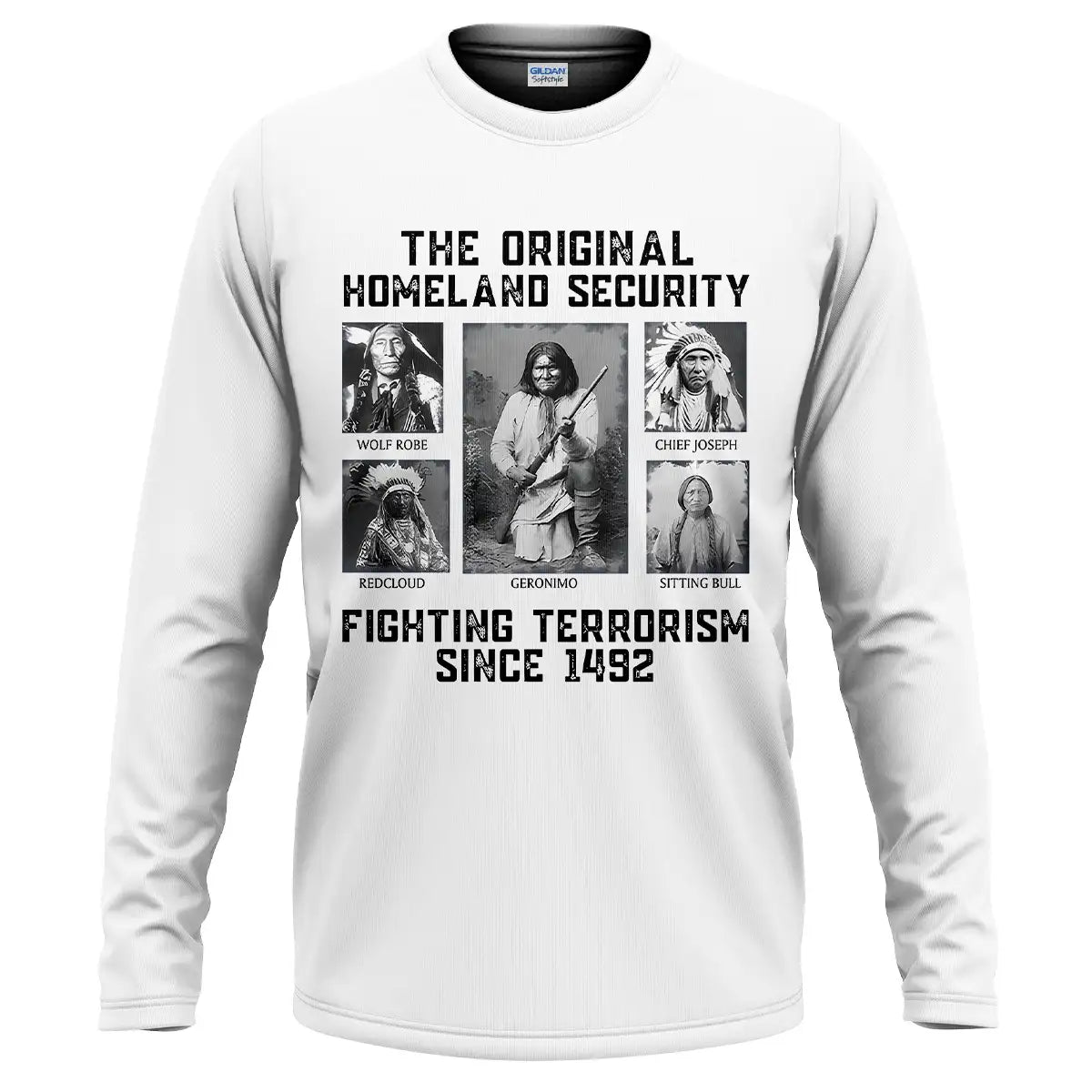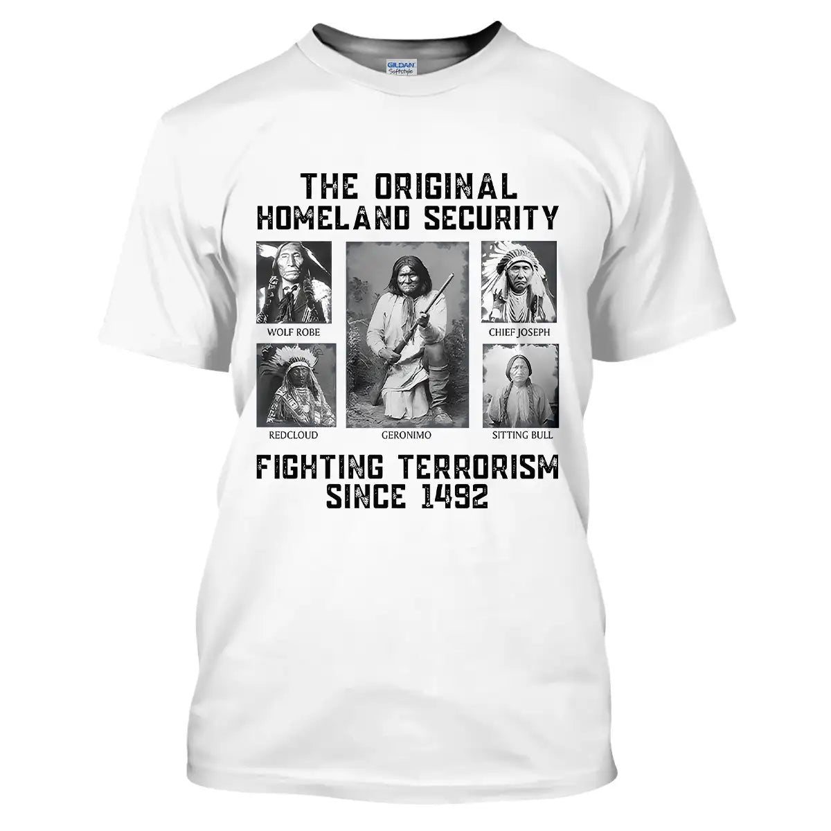 This bold t-shirt pays tribute to the strength and resilience of Native American leaders with the powerful quote “The Original Homeland Security Fighting Terrorism Since 1492”. Featuring historic portraits of Geronimo, Sitting Bull, Red Cloud, Wolf Robe, and Chief Joseph, the design highlights the enduring legacy of those who fought to protect their people and lands. Each image is framed in a monochrome style, giving the shirt a vintage and impactful look. Made from soft cotton fabric, it combines comfort with a meaningful message, making it ideal for those who respect heritage, history, and the fight for justice.