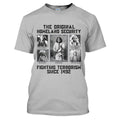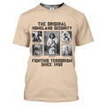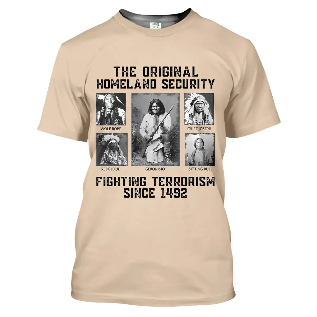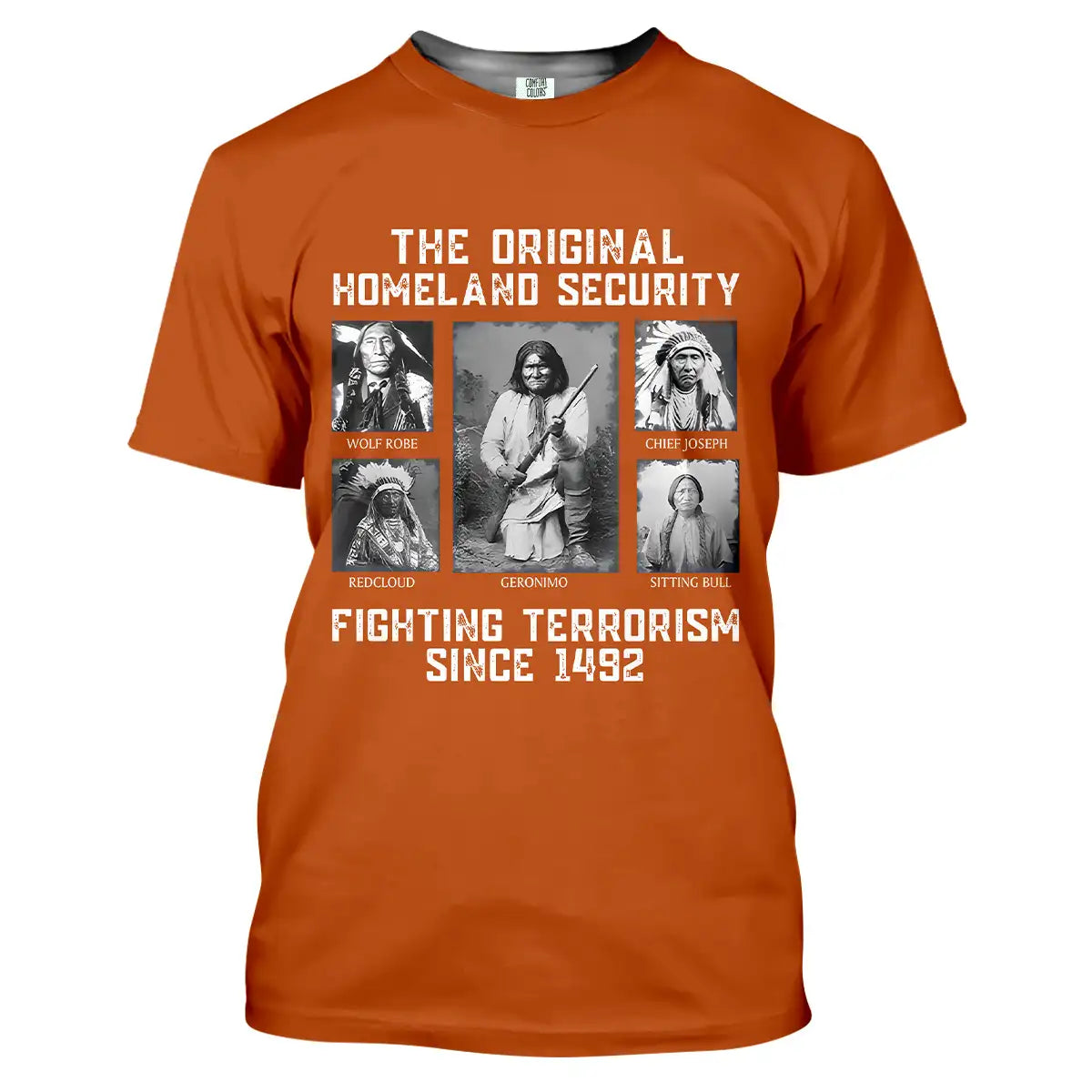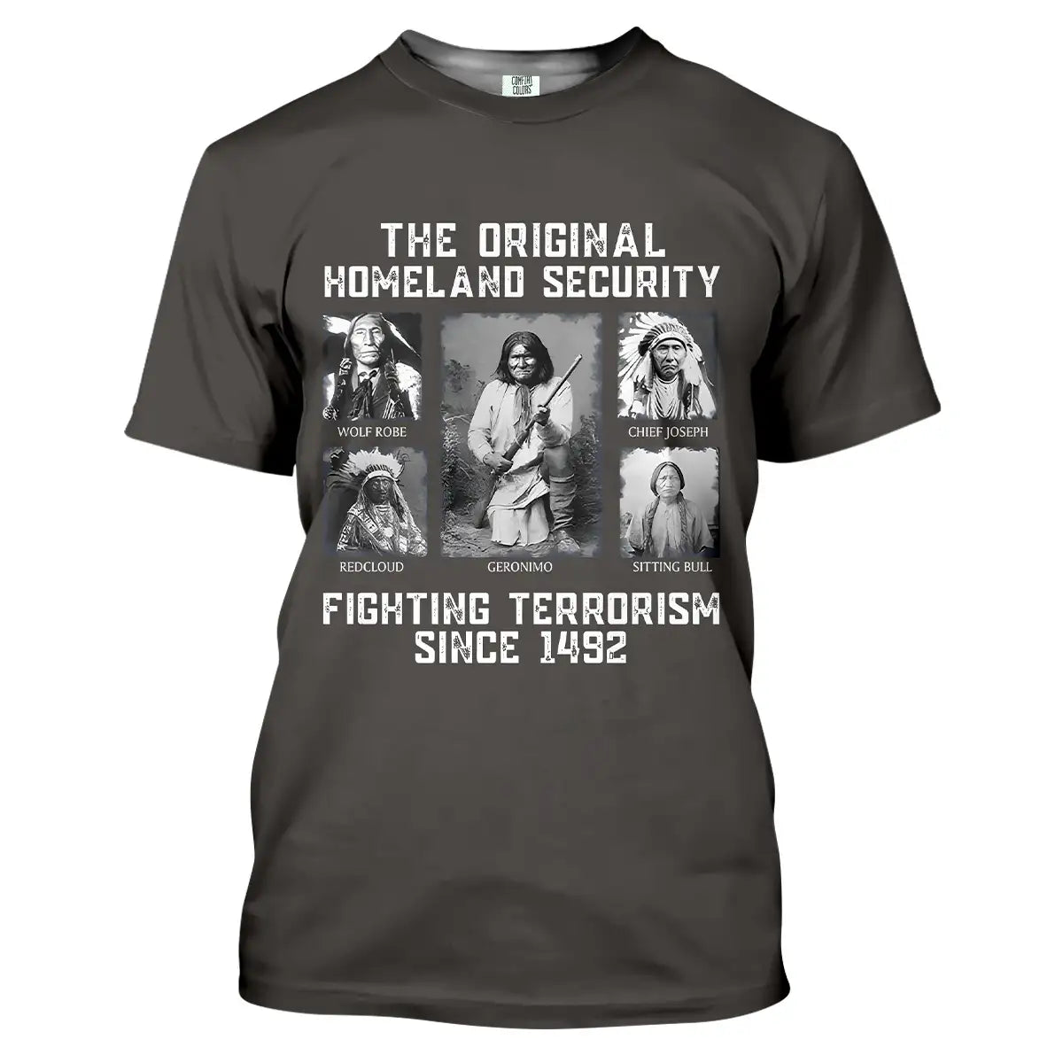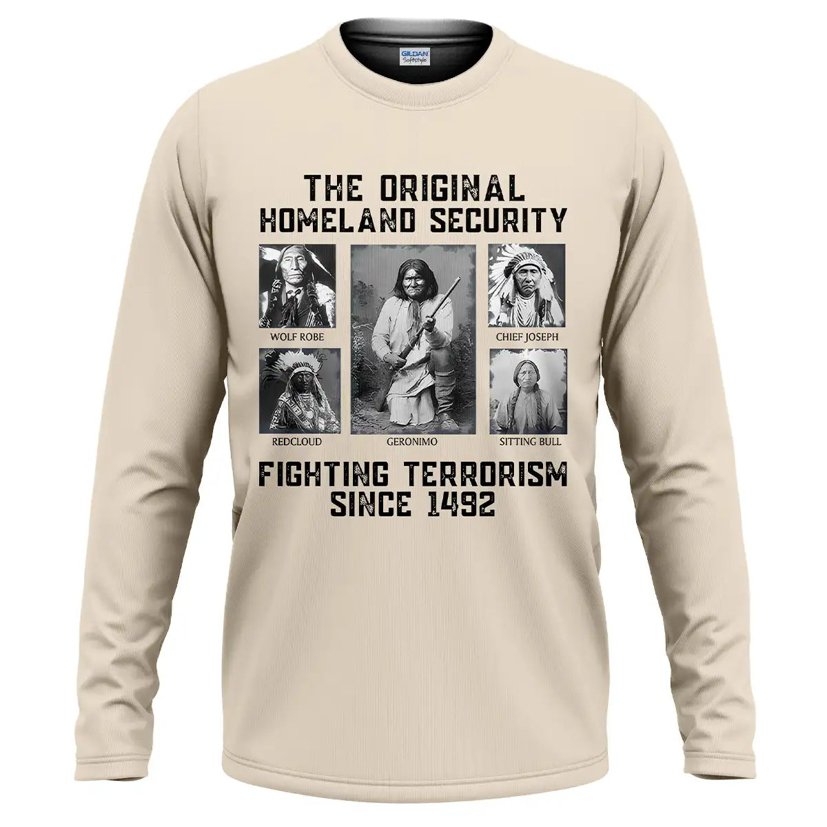 This bold t-shirt pays tribute to the strength and resilience of Native American leaders with the powerful quote “The Original Homeland Security Fighting Terrorism Since 1492”. Featuring historic portraits of Geronimo, Sitting Bull, Red Cloud, Wolf Robe, and Chief Joseph, the design highlights the enduring legacy of those who fought to protect their people and lands. Each image is framed in a monochrome style, giving the shirt a vintage and impactful look. Made from soft cotton fabric, it combines comfort with a meaningful message, making it ideal for those who respect heritage, history, and the fight for justice.