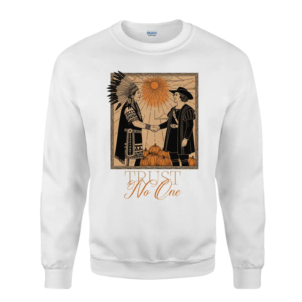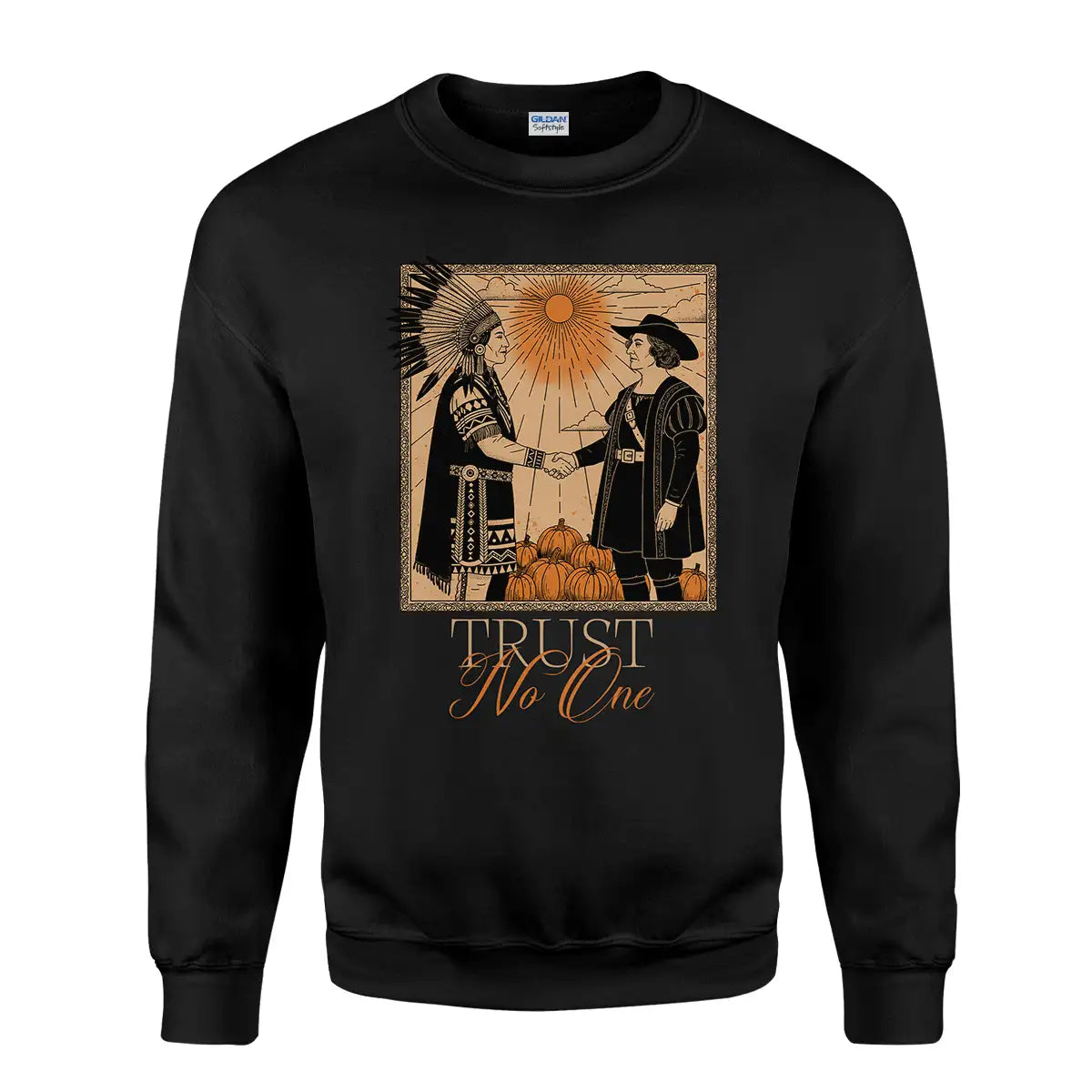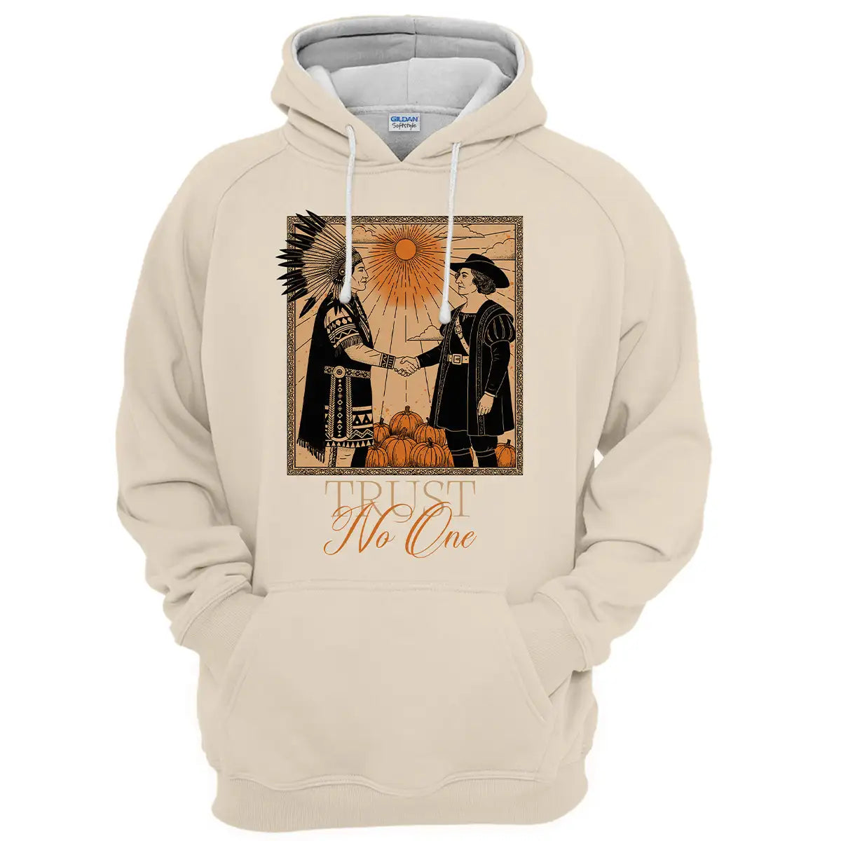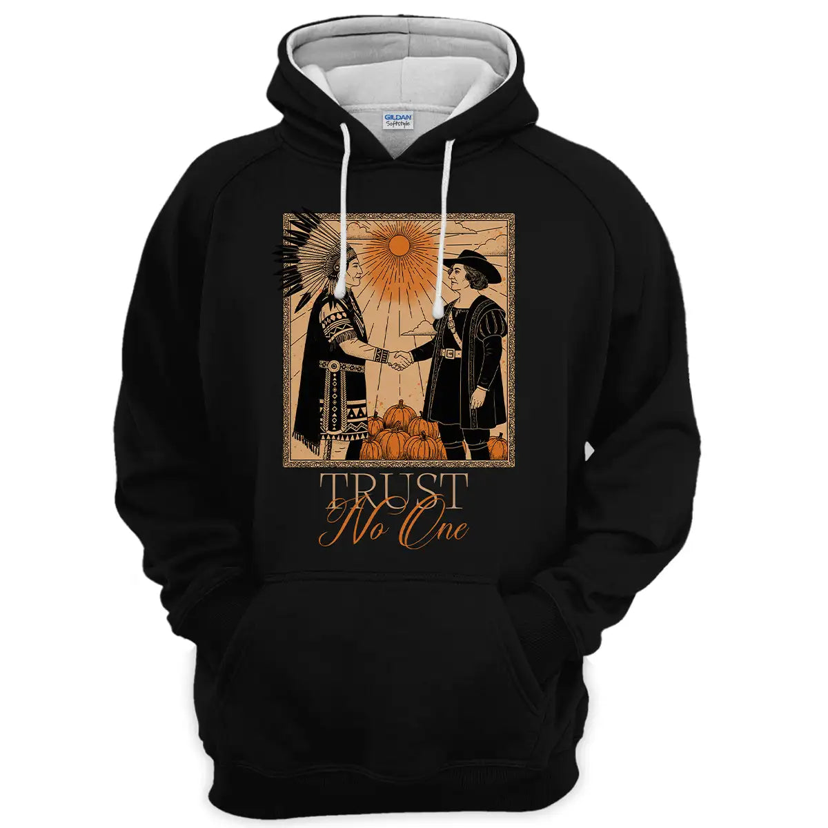 This hoodie captures a striking moment in history through a powerful visual—an Indigenous chief in full traditional regalia shaking hands with a European colonist under the blazing sun, surrounded by pumpkins. Beneath the image, the phrase Trust No One delivers a strong message about betrayal and resilience, designed by the history of Native American tribes during colonization. Designed in warm earth tones and vintage style, it honors the endurance and strength of Indigenous peoples while making a bold political and cultural statement. Crafted with premium materials, this hoodie offers comfort, durability, and a meaningful conversation starter wherever you wear it.