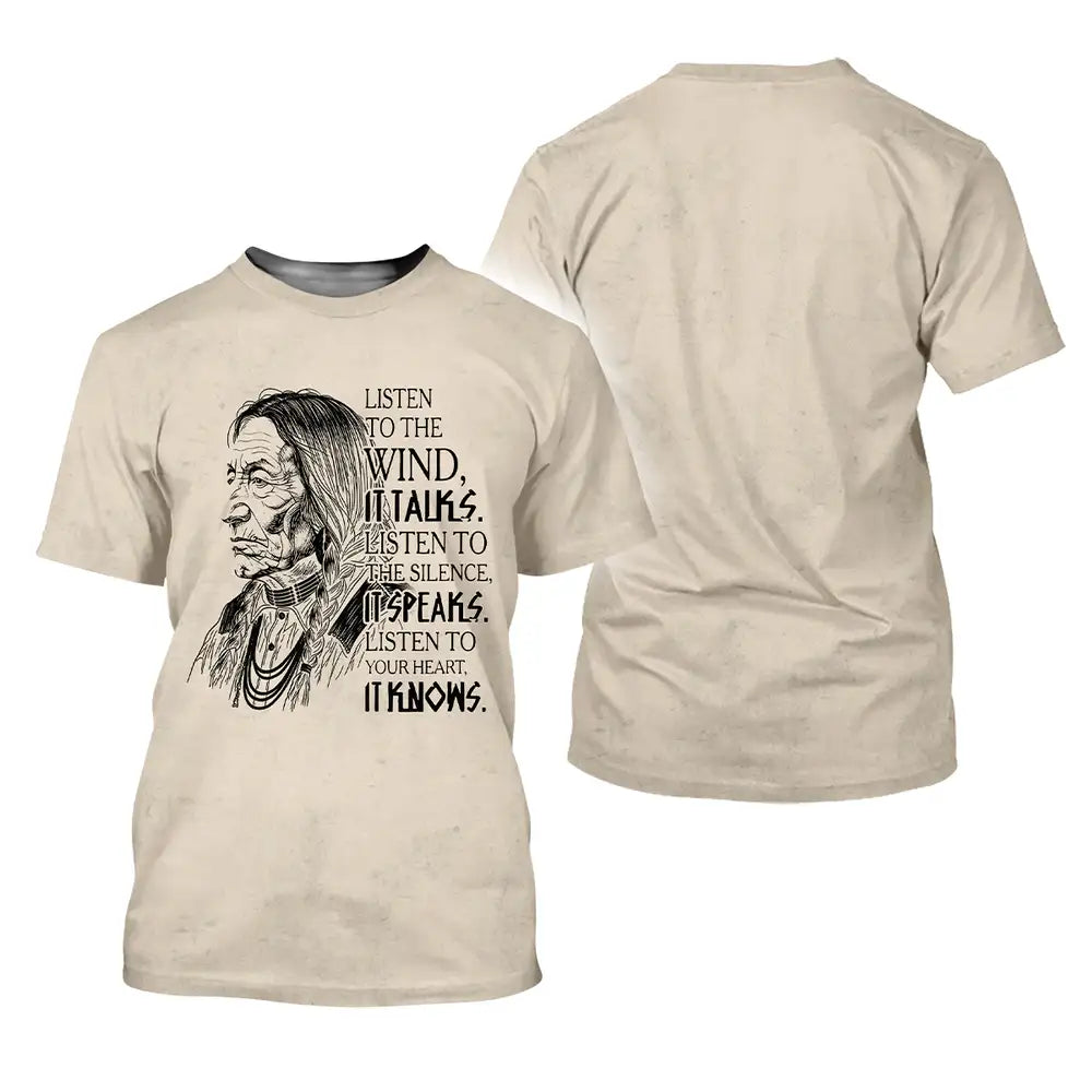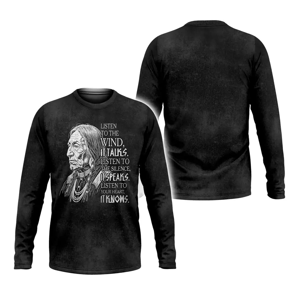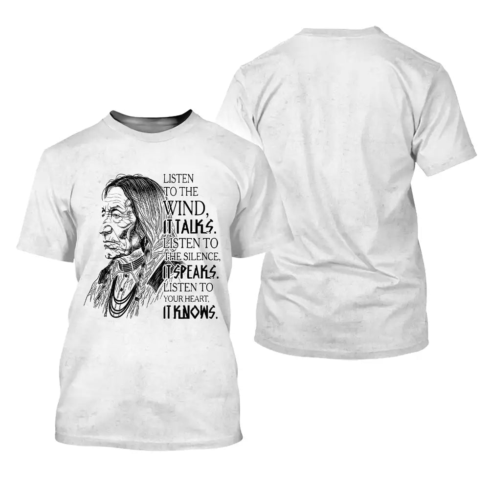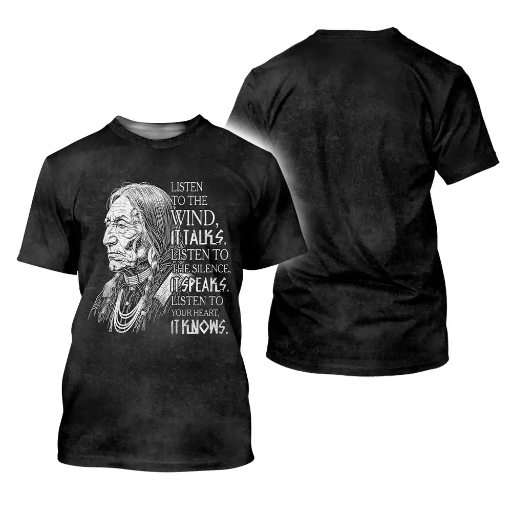This design is designed by Lakota teachings of the Great Plains, where the wind, silence, and heartbeat are guides to balance and respect. The hand drawn elder represents hard earned wisdom and the responsibility to listen before speaking. The quote invites a pause, asking you to hear the land, sense the quiet, and trust the truth within. Printed on a soft black unisex tee, it suits everyday wear, cultural gatherings, and thoughtful gifting. Wear it to carry a reminder of humility, courage, and connection to Earth, and let choices be led by steady breath and heart with calm grounded presence.