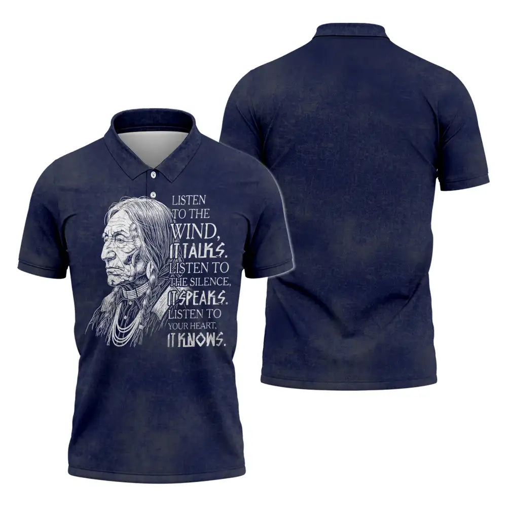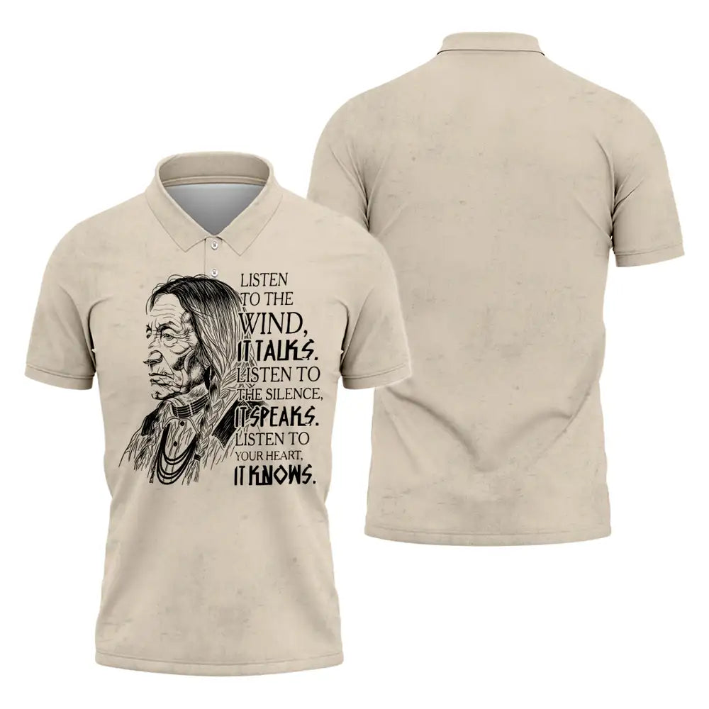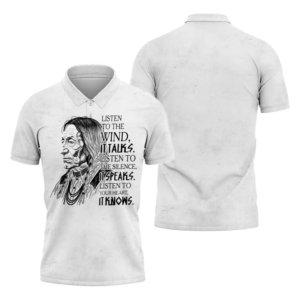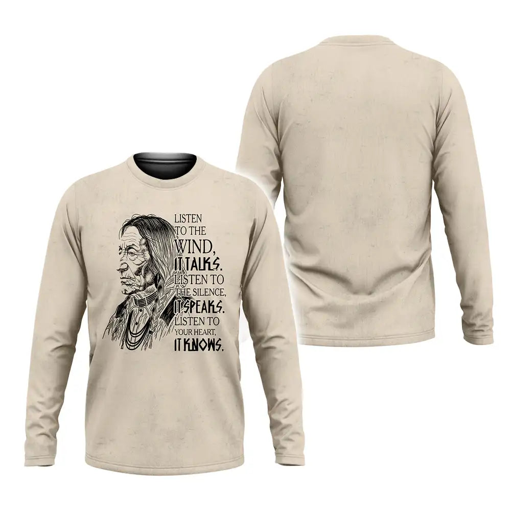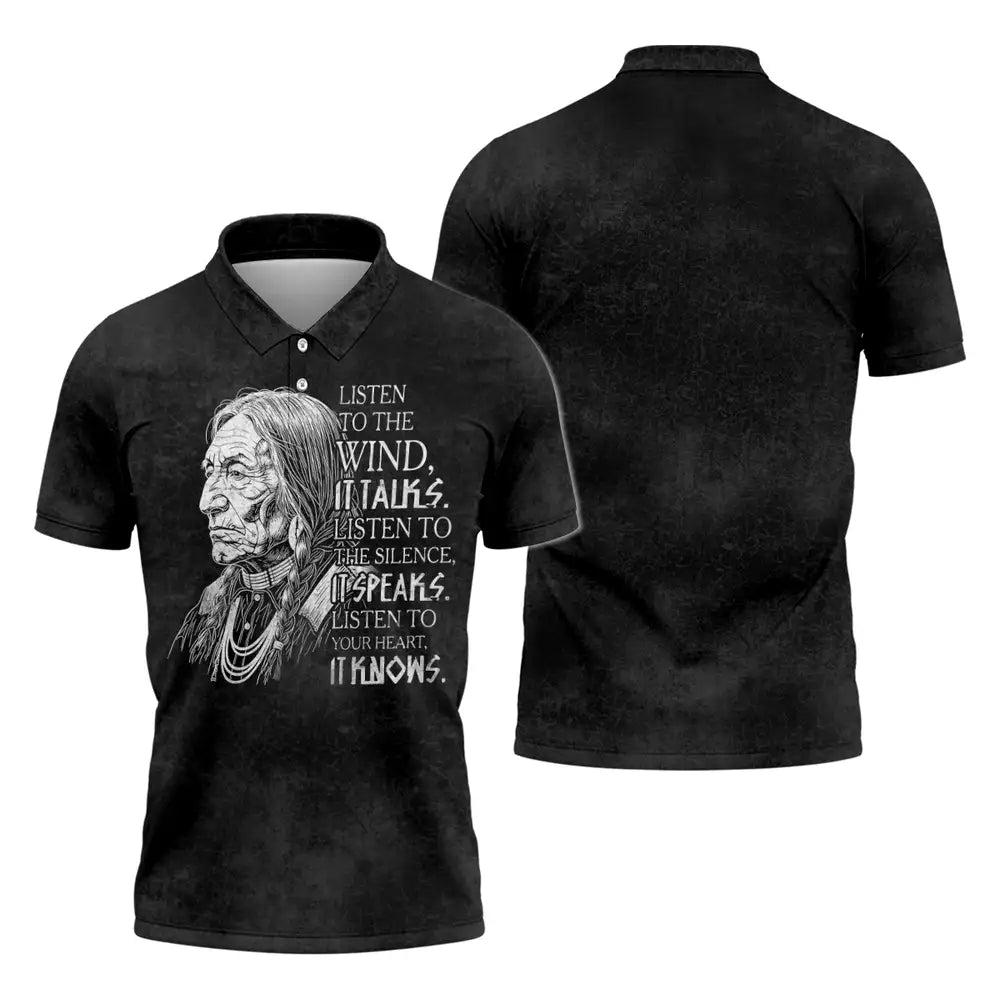 This design is designed by Lakota teachings of the Great Plains, where the wind, silence, and heartbeat are guides to balance and respect. The hand drawn elder represents hard earned wisdom and the responsibility to listen before speaking. The quote invites a pause, asking you to hear the land, sense the quiet, and trust the truth within. Printed on a soft black unisex tee, it suits everyday wear, cultural gatherings, and thoughtful gifting. Wear it to carry a reminder of humility, courage, and connection to Earth, and let choices be led by steady breath and heart with calm grounded presence.