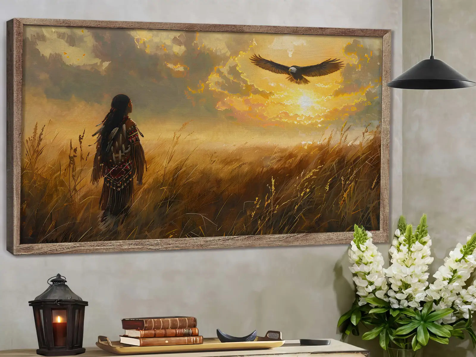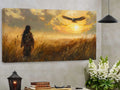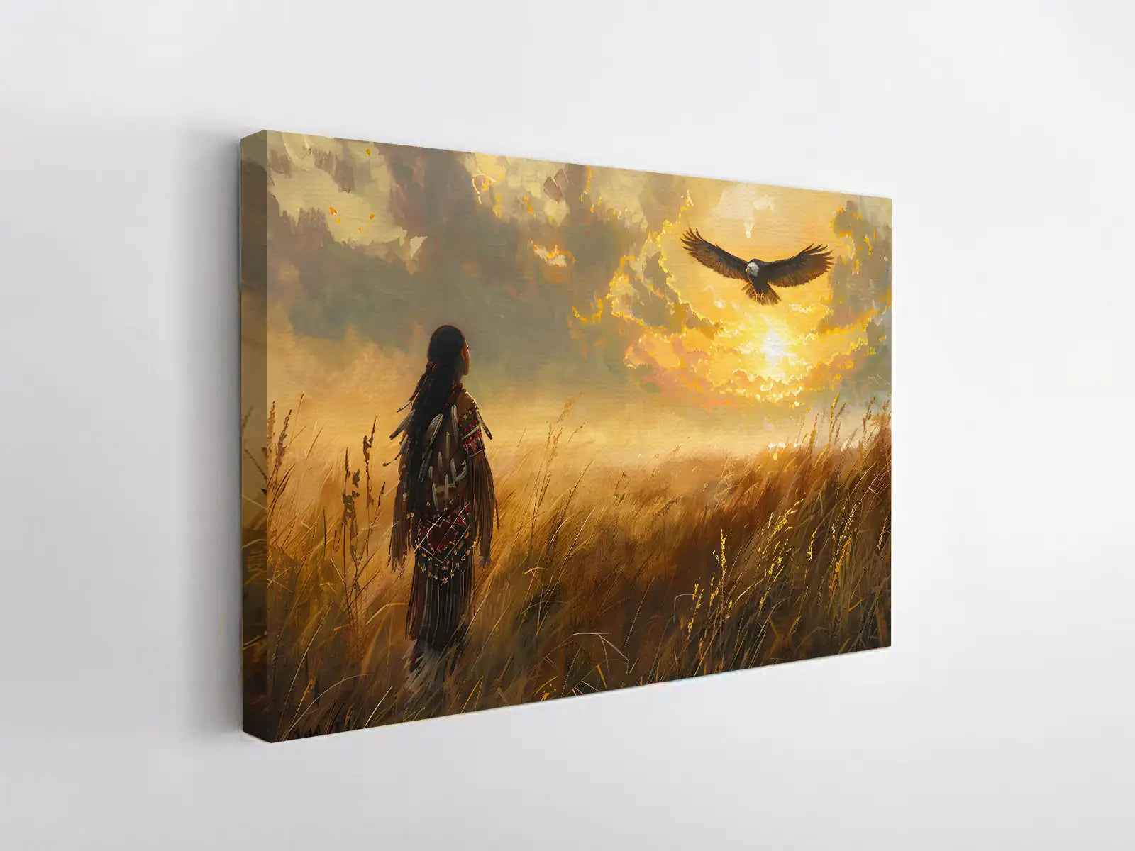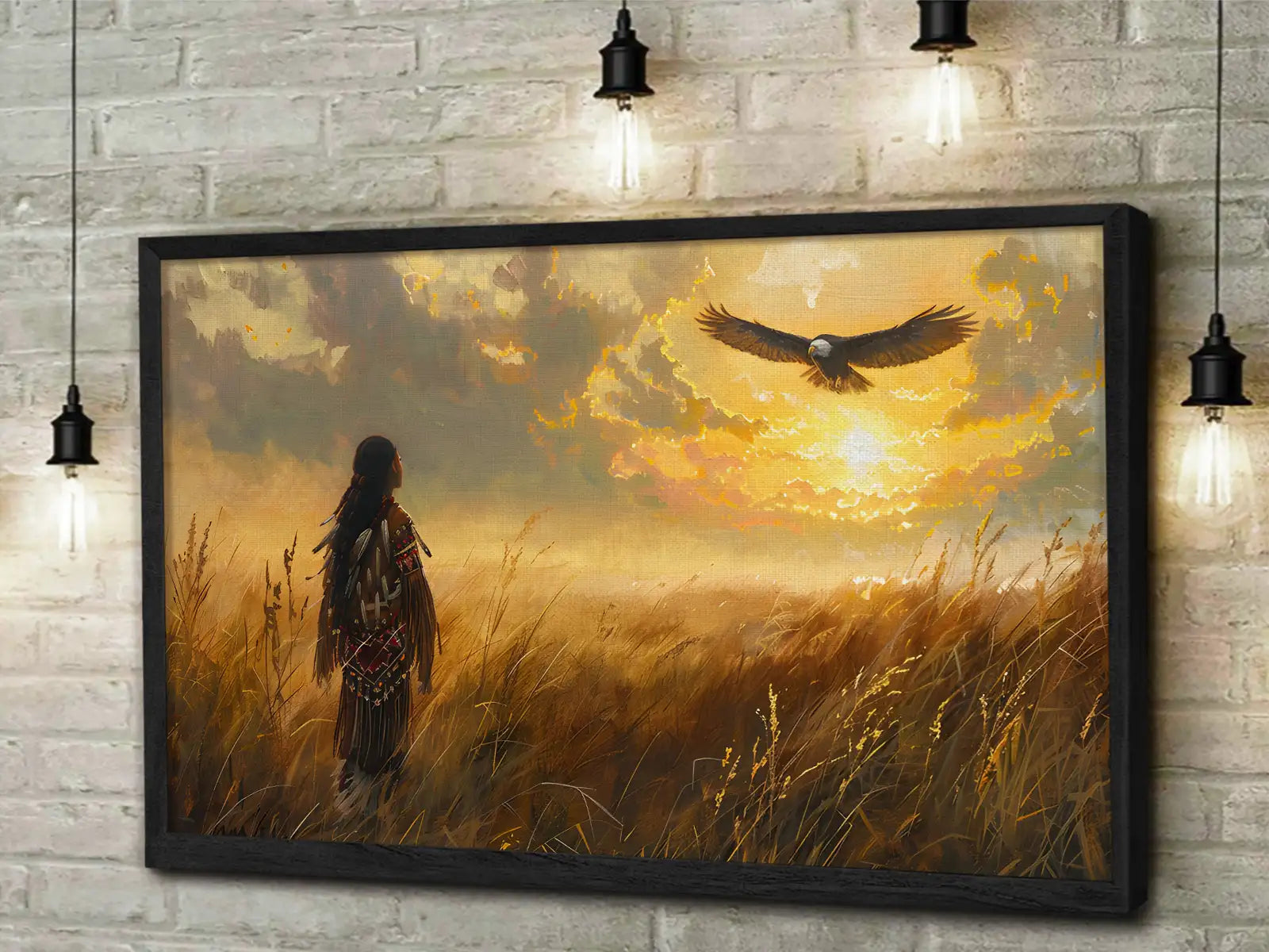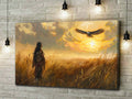 This stunning wall art portrays a Native American figure standing in a golden field, gazing at an eagle soaring across a radiant sunset sky. The imagery draws inspiration from Plains tribes, where the eagle represents freedom, vision, and a sacred messenger between earth and spirit. The warrior’s traditional attire reflects strength and cultural pride, while the glowing horizon creates a sense of hope and harmony with nature. With its warm tones and symbolic depth, this artwork captures both peace and power. Perfect for rustic homes, cabins, or anyone seeking meaningful decor with cultural resonance and timeless beauty.