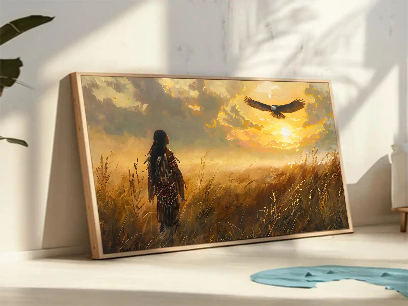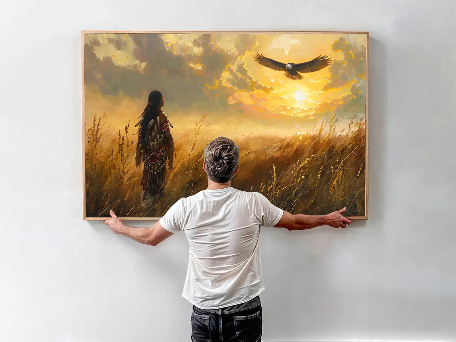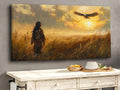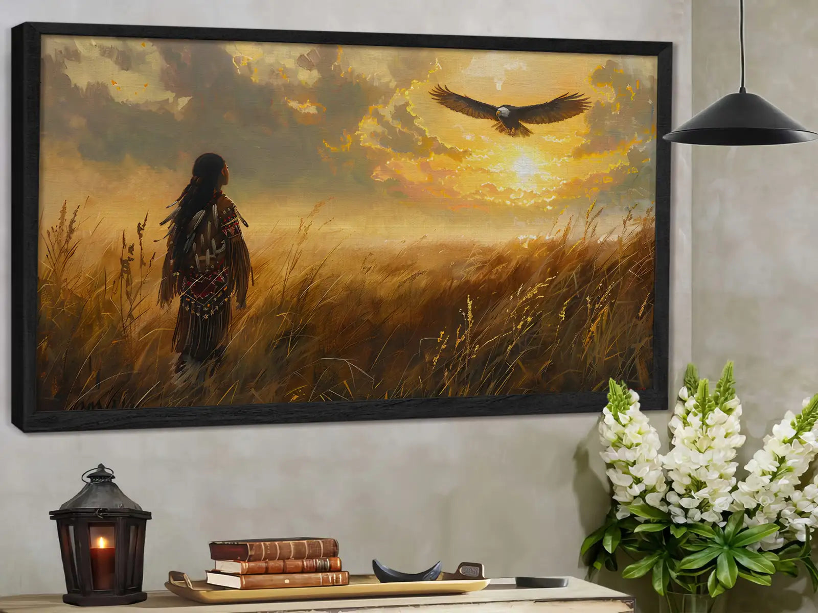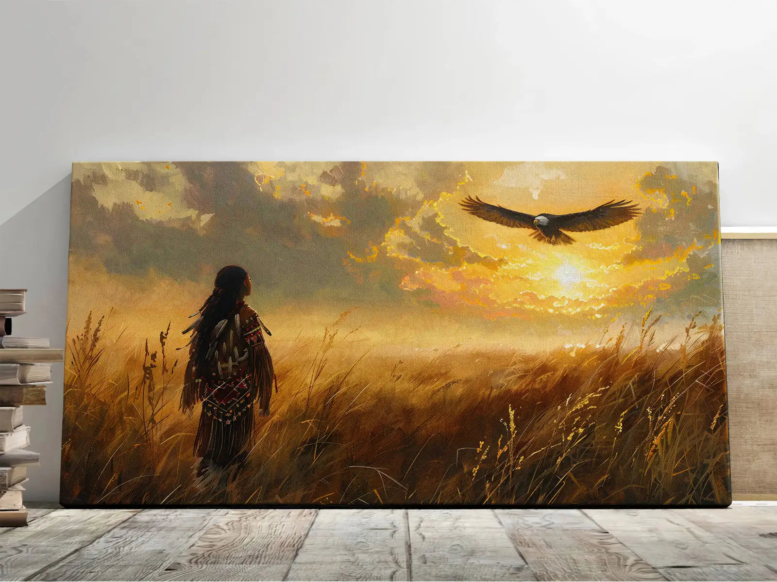 This stunning wall art portrays a Native American figure standing in a golden field, gazing at an eagle soaring across a radiant sunset sky. The imagery draws inspiration from Plains tribes, where the eagle represents freedom, vision, and a sacred messenger between earth and spirit. The warrior’s traditional attire reflects strength and cultural pride, while the glowing horizon creates a sense of hope and harmony with nature. With its warm tones and symbolic depth, this artwork captures both peace and power. Perfect for rustic homes, cabins, or anyone seeking meaningful decor with cultural resonance and timeless beauty.