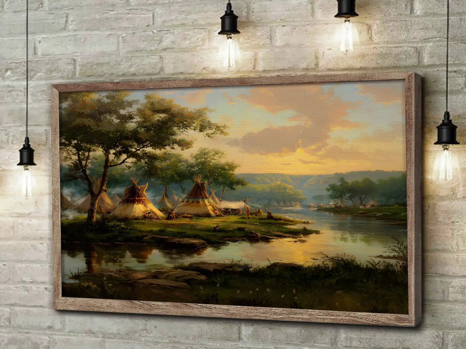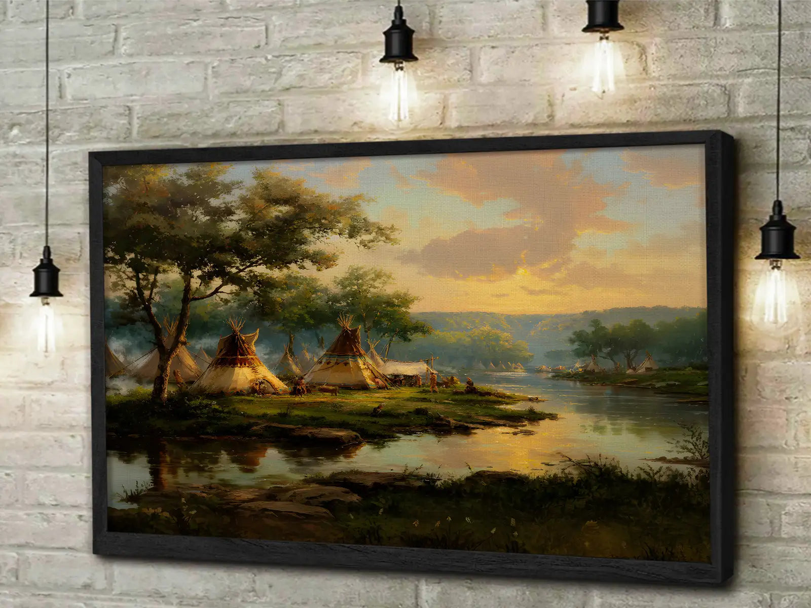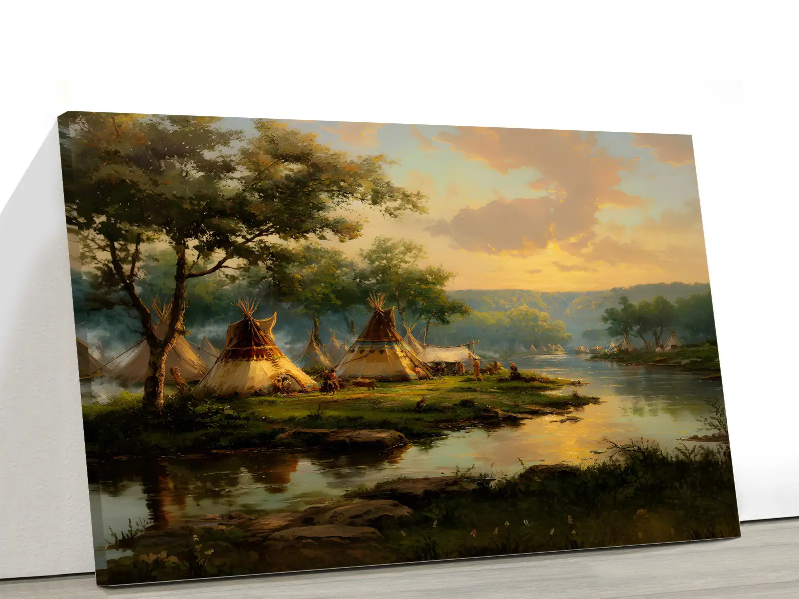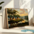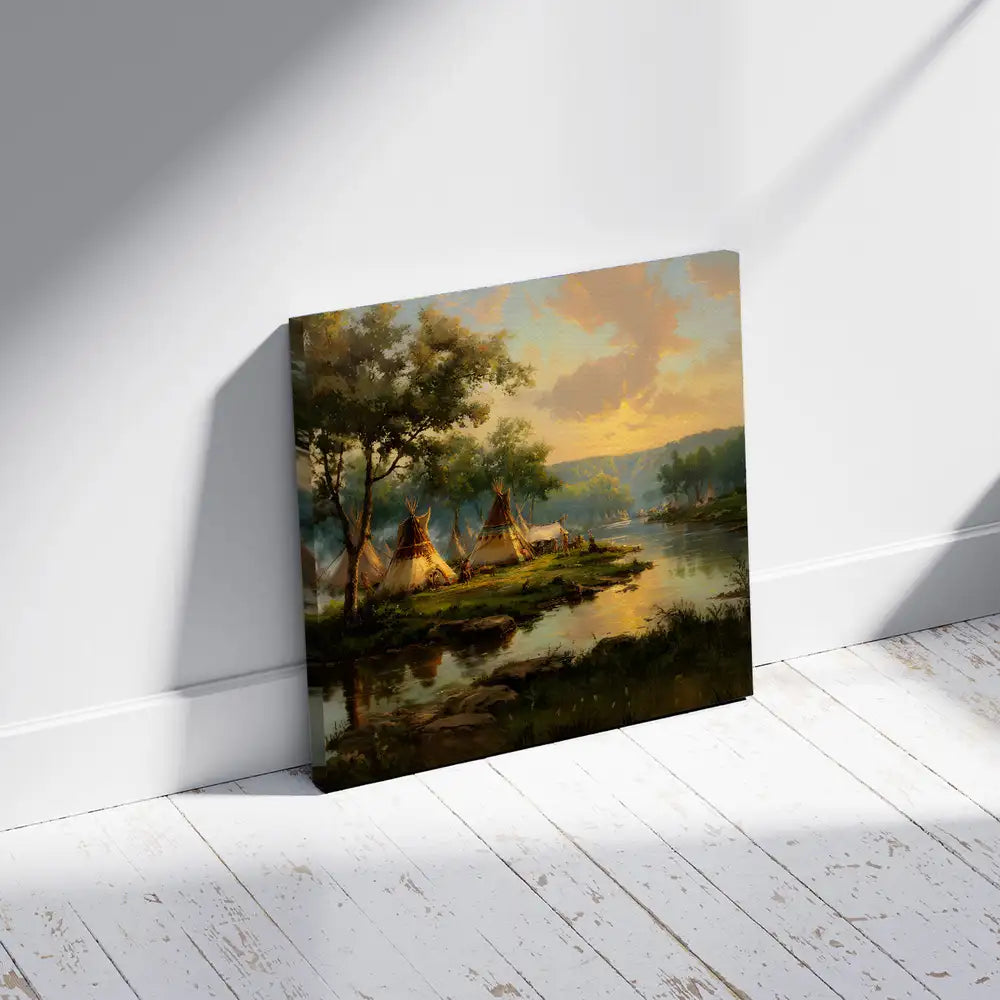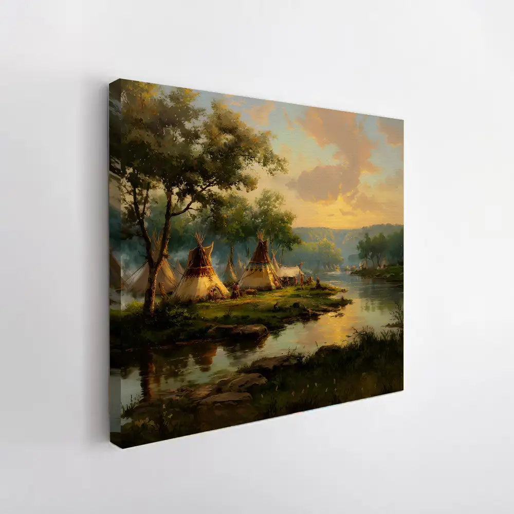 This Native American teepee village canvas wall art captures the peaceful beauty of life by the riverside at sunset. designed by the Plains tribes, the artwork reflects harmony with nature, community living, and the spiritual bond between people and the land. The warm tones of the sky blend with the calm waters, creating a scene that invites reflection and serenity. Perfect for adding a touch of cultural heritage and natural elegance to your home, this canvas serves as both an artistic statement and a meaningful reminder of tradition and unity.