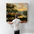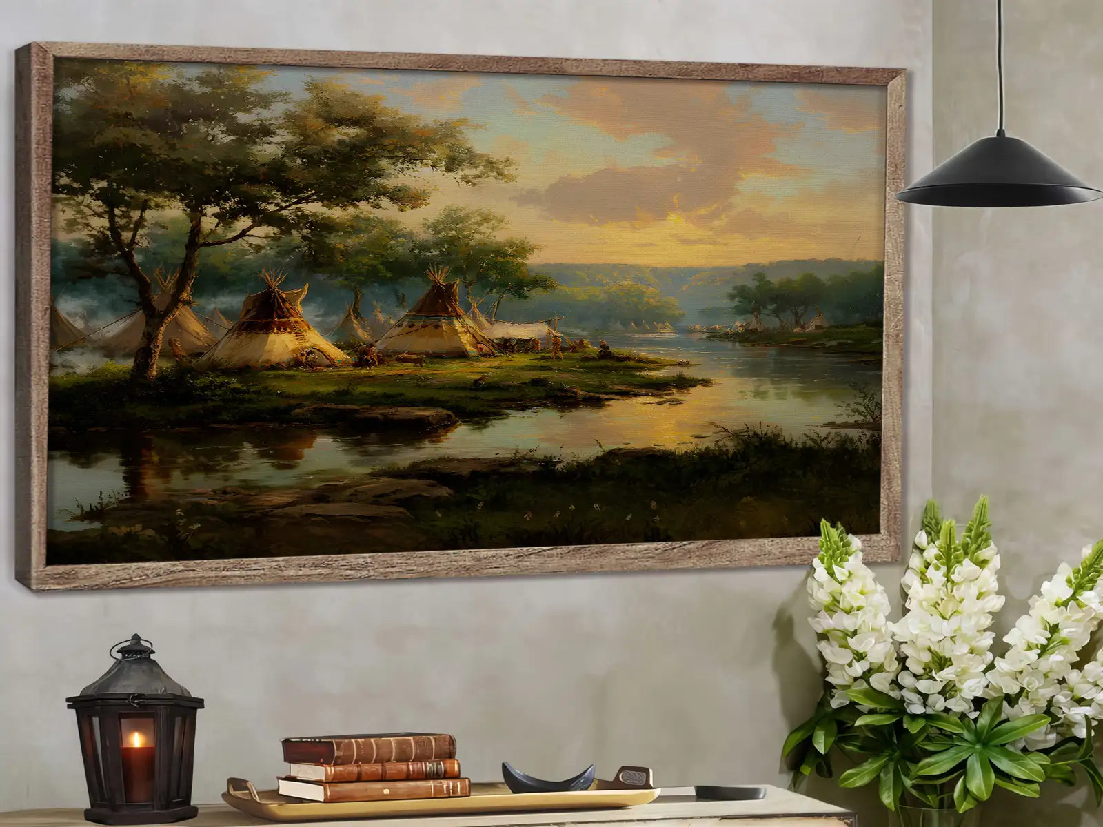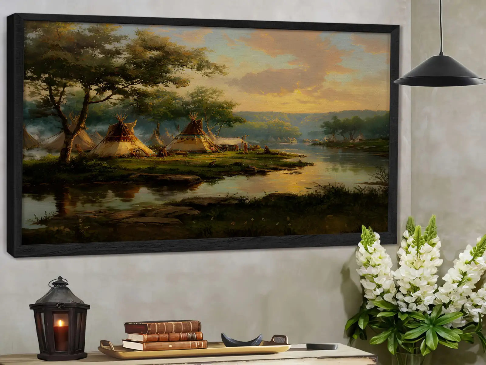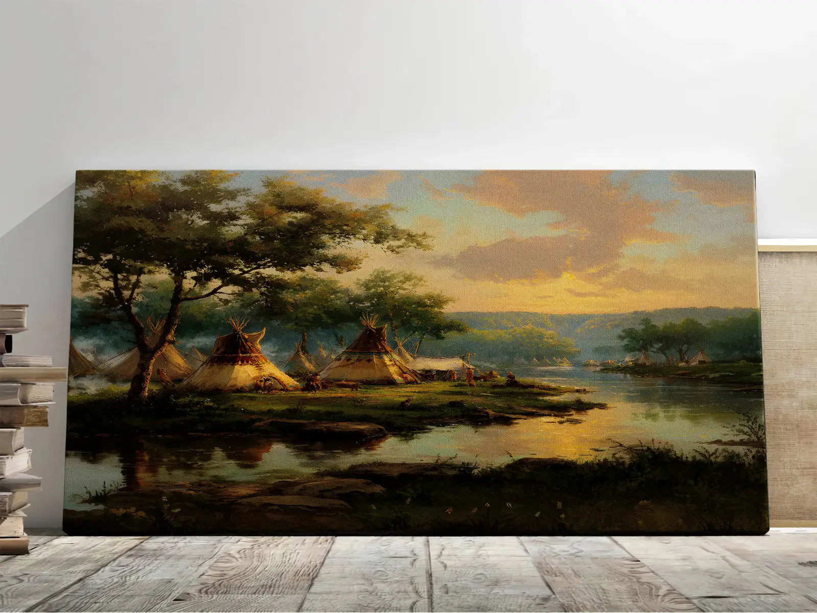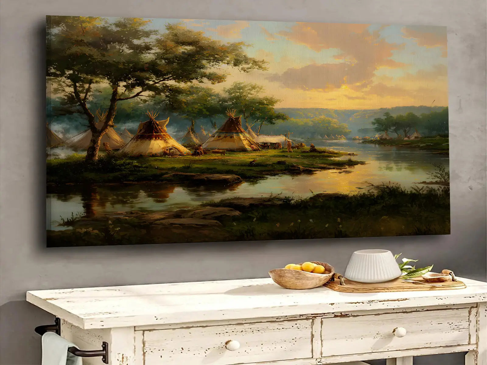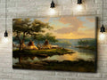 This Native American teepee village canvas wall art captures the peaceful beauty of life by the riverside at sunset. designed by the Plains tribes, the artwork reflects harmony with nature, community living, and the spiritual bond between people and the land. The warm tones of the sky blend with the calm waters, creating a scene that invites reflection and serenity. Perfect for adding a touch of cultural heritage and natural elegance to your home, this canvas serves as both an artistic statement and a meaningful reminder of tradition and unity.