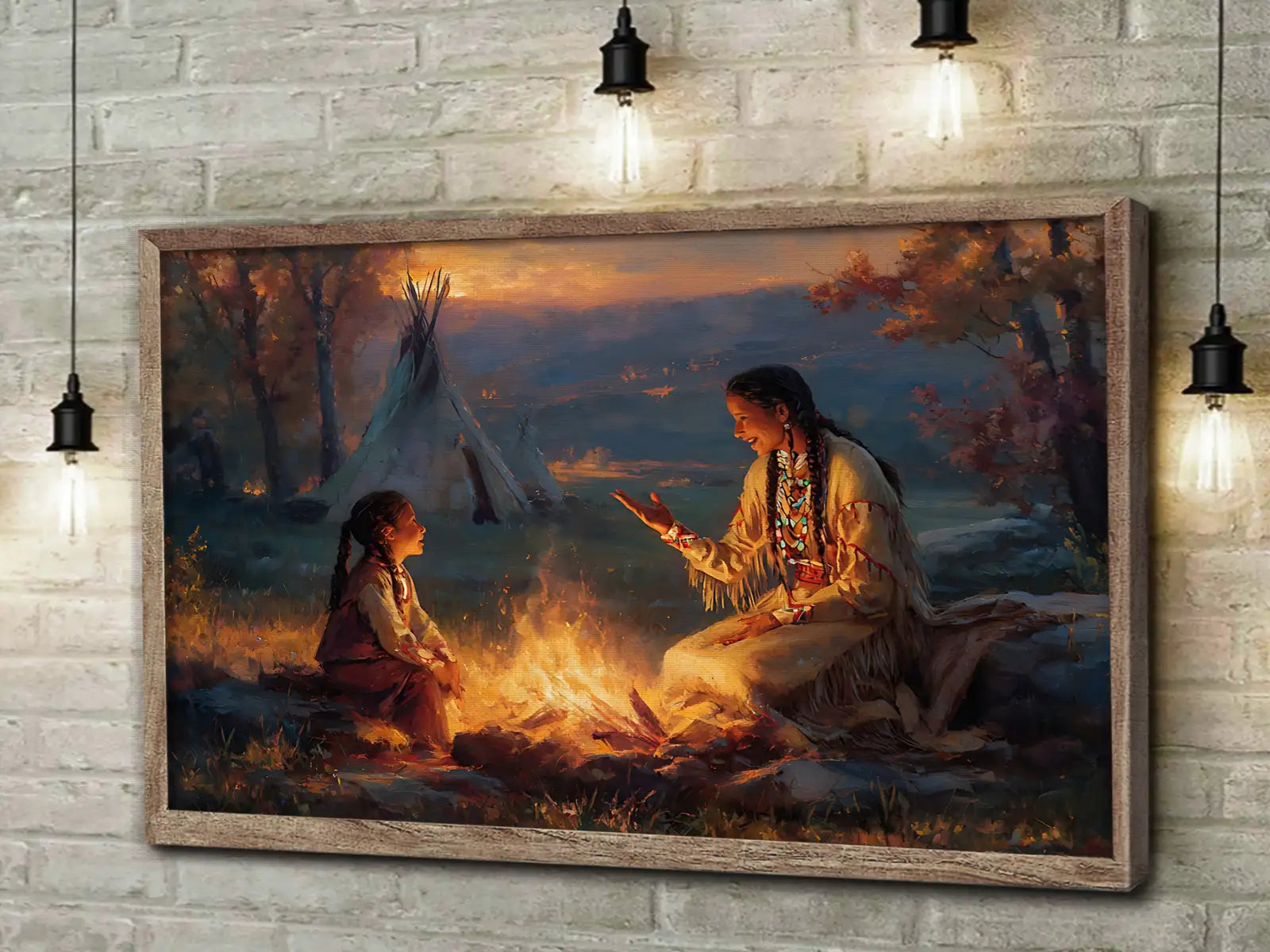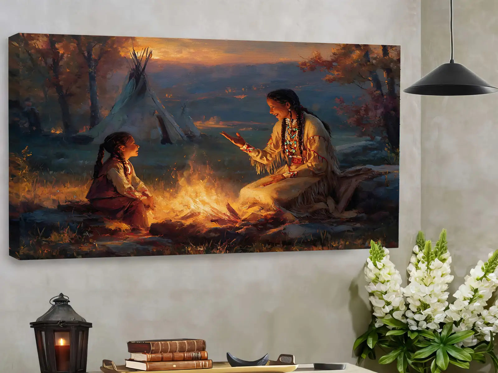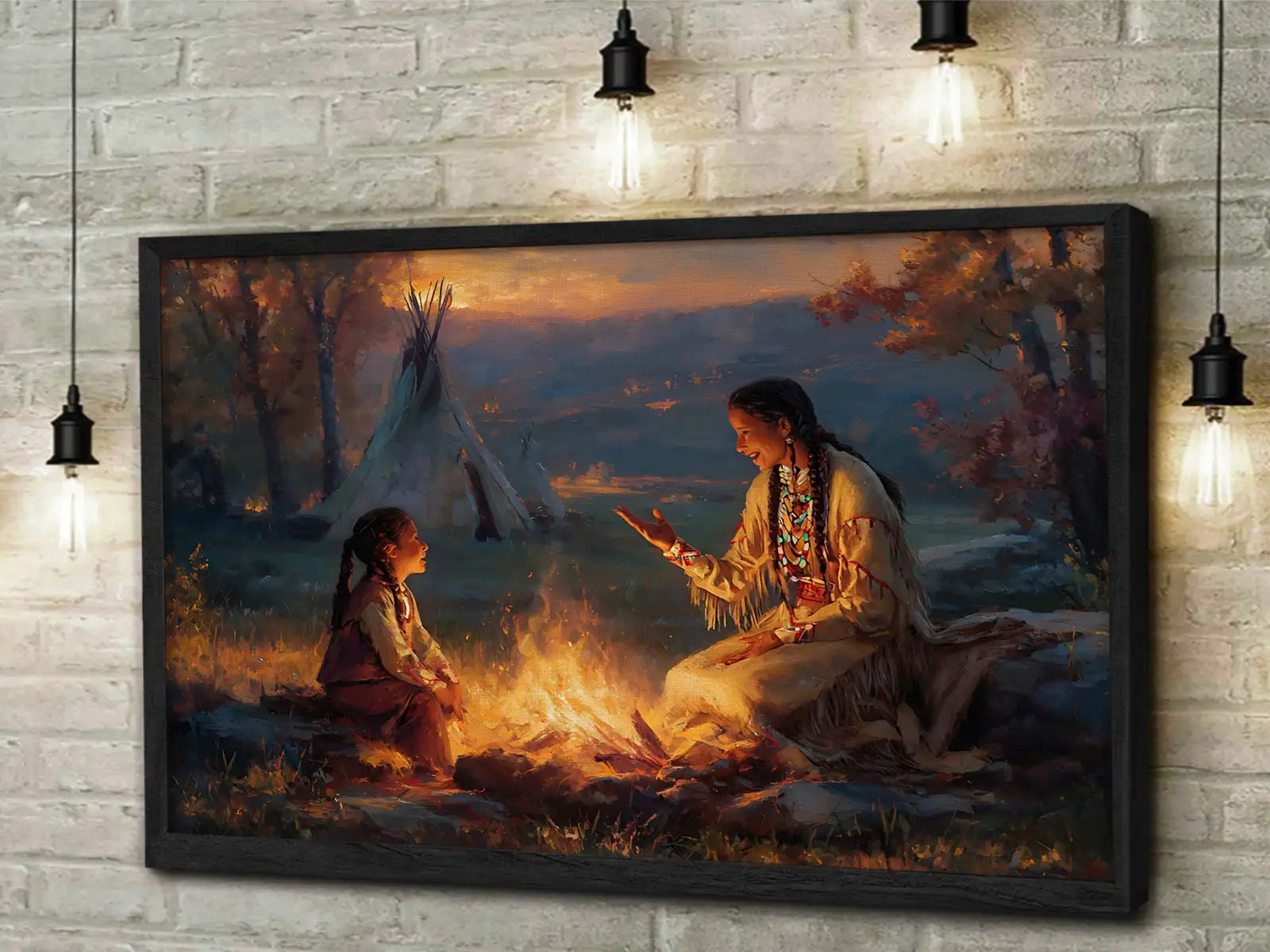 This beautiful wall art depicts a touching storytelling moment by the fire between a woman and a child, set against the backdrop of teepees and a peaceful night sky. Inspired by the traditions of Plains tribes, the artwork symbolizes the passing down of wisdom, family bonds, and the preservation of culture through generations. The warm glow of the fire highlights expressions of joy and curiosity, creating a scene that feels both intimate and timeless. With rich colors and emotional depth, this canvas is perfect for any home, bringing warmth, meaning, and cultural heritage into your living space.