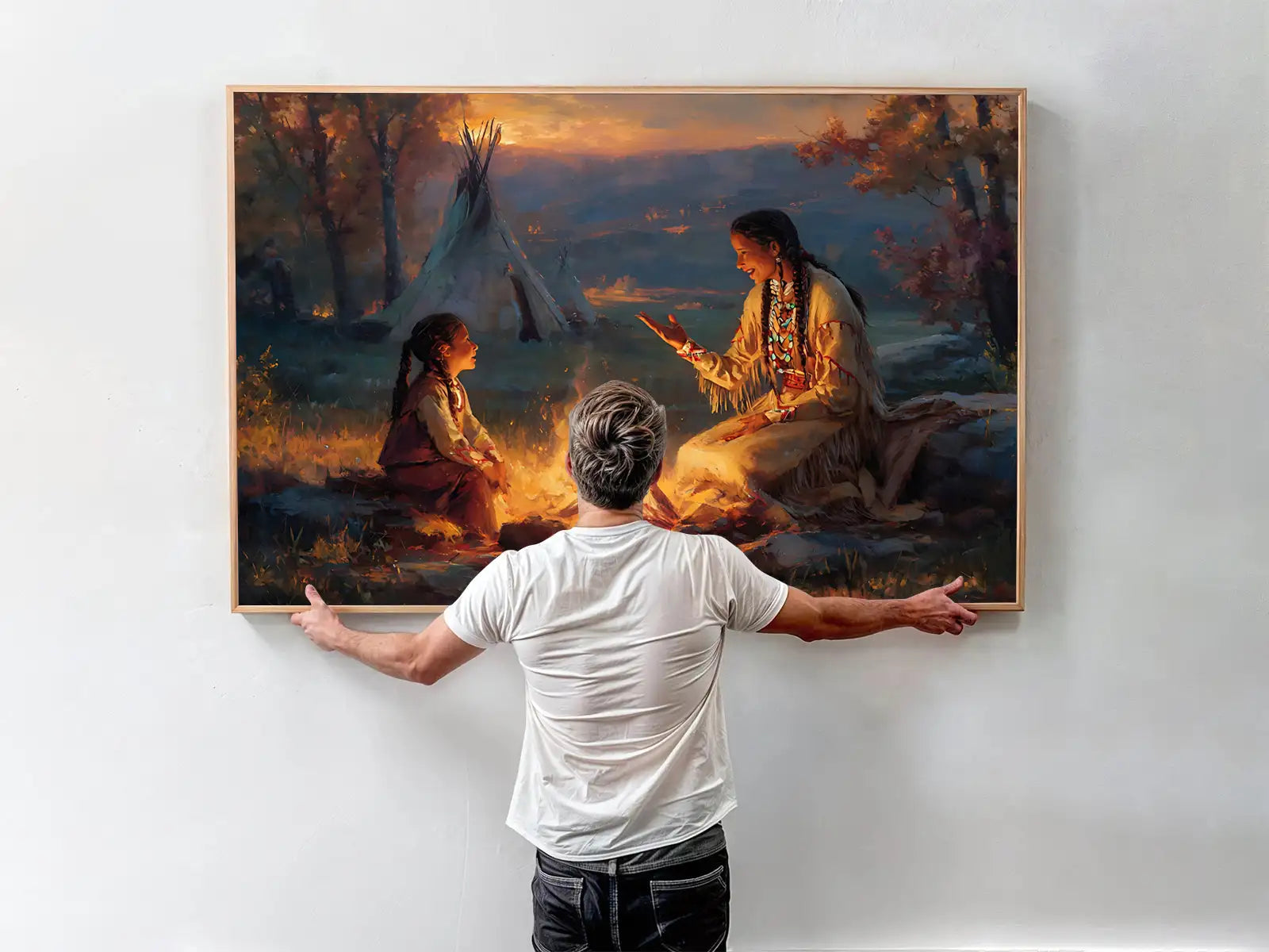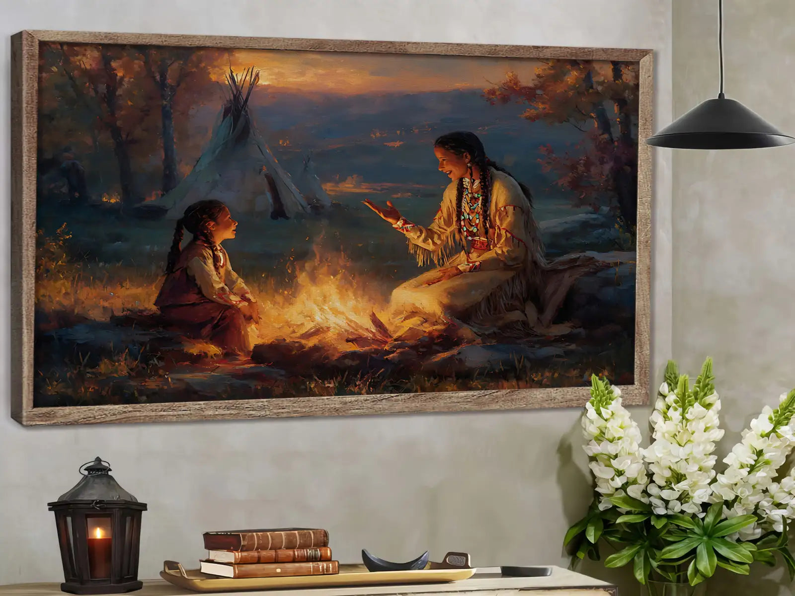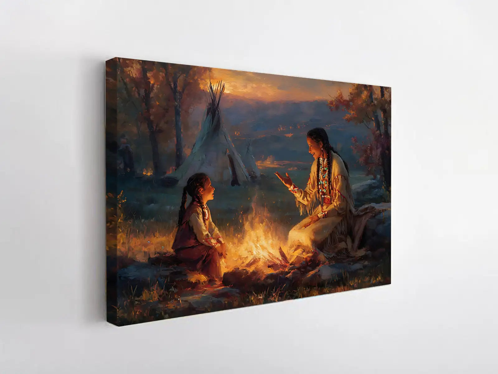 This beautiful wall art depicts a touching storytelling moment by the fire between a woman and a child, set against the backdrop of teepees and a peaceful night sky. Inspired by the traditions of Plains tribes, the artwork symbolizes the passing down of wisdom, family bonds, and the preservation of culture through generations. The warm glow of the fire highlights expressions of joy and curiosity, creating a scene that feels both intimate and timeless. With rich colors and emotional depth, this canvas is perfect for any home, bringing warmth, meaning, and cultural heritage into your living space.