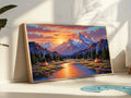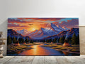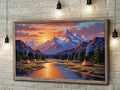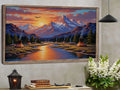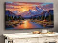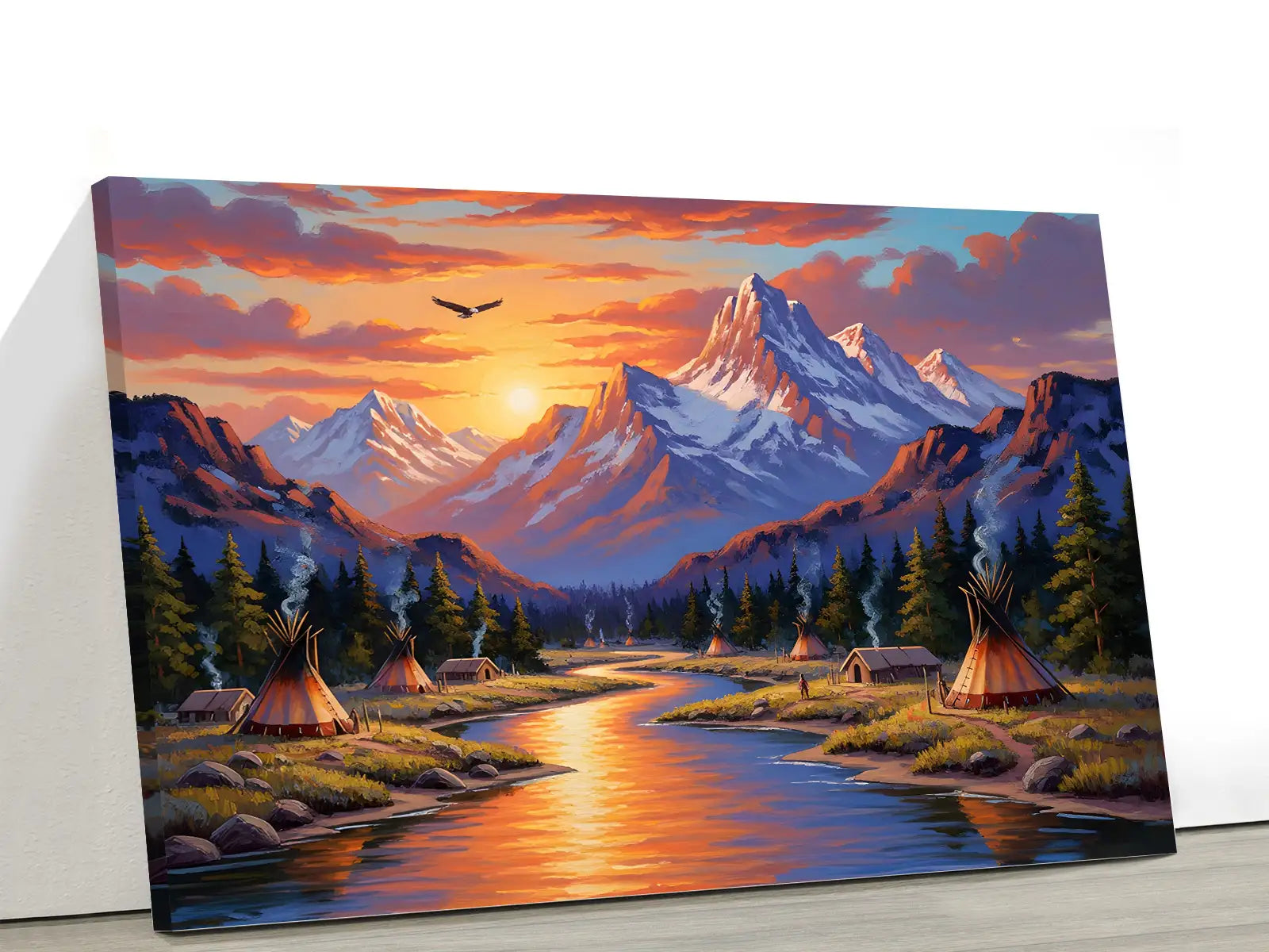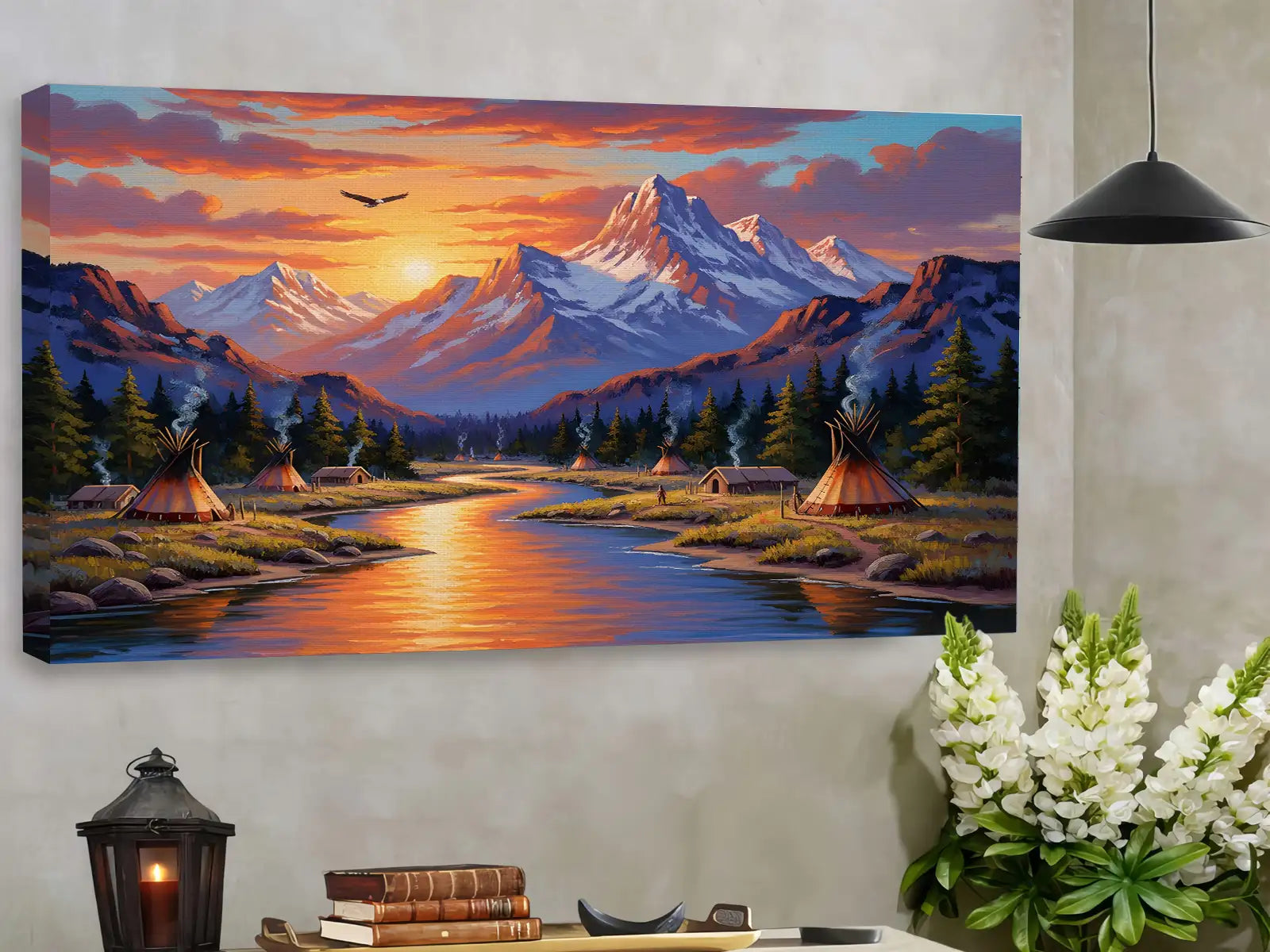 This stunning wall art captures a tranquil village scene set beside a flowing river under a glowing sunset. Teepees stand peacefully along the banks while smoke rises gently into the sky, framed by towering snow-capped mountains and evergreen forests. An eagle soars above, symbolizing freedom and spiritual vision. Inspired by the traditions of Plains tribes, the artwork embodies harmony, community, and respect for the natural world. With its vibrant colors and breathtaking scenery, this canvas adds cultural depth and serenity to any room. Perfect for living rooms, studies, or rustic interiors, it celebrates balance and timeless heritage.