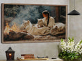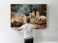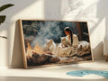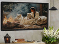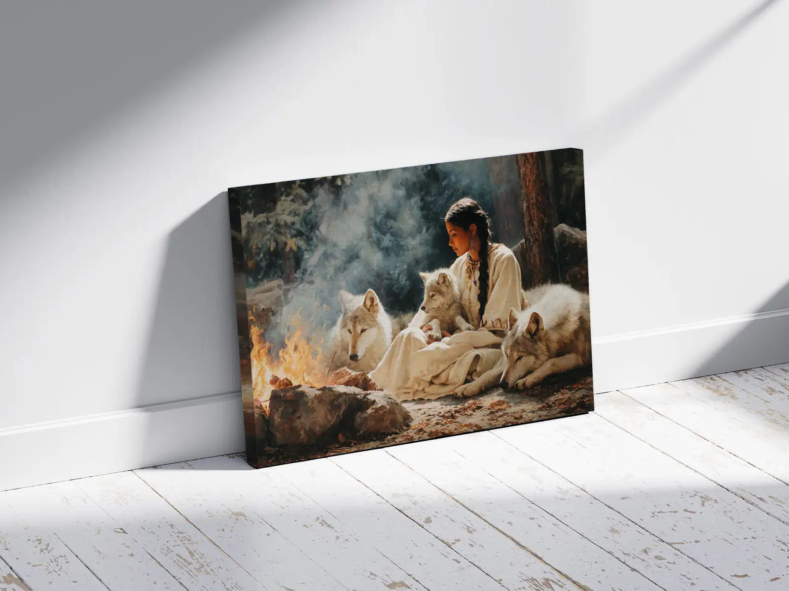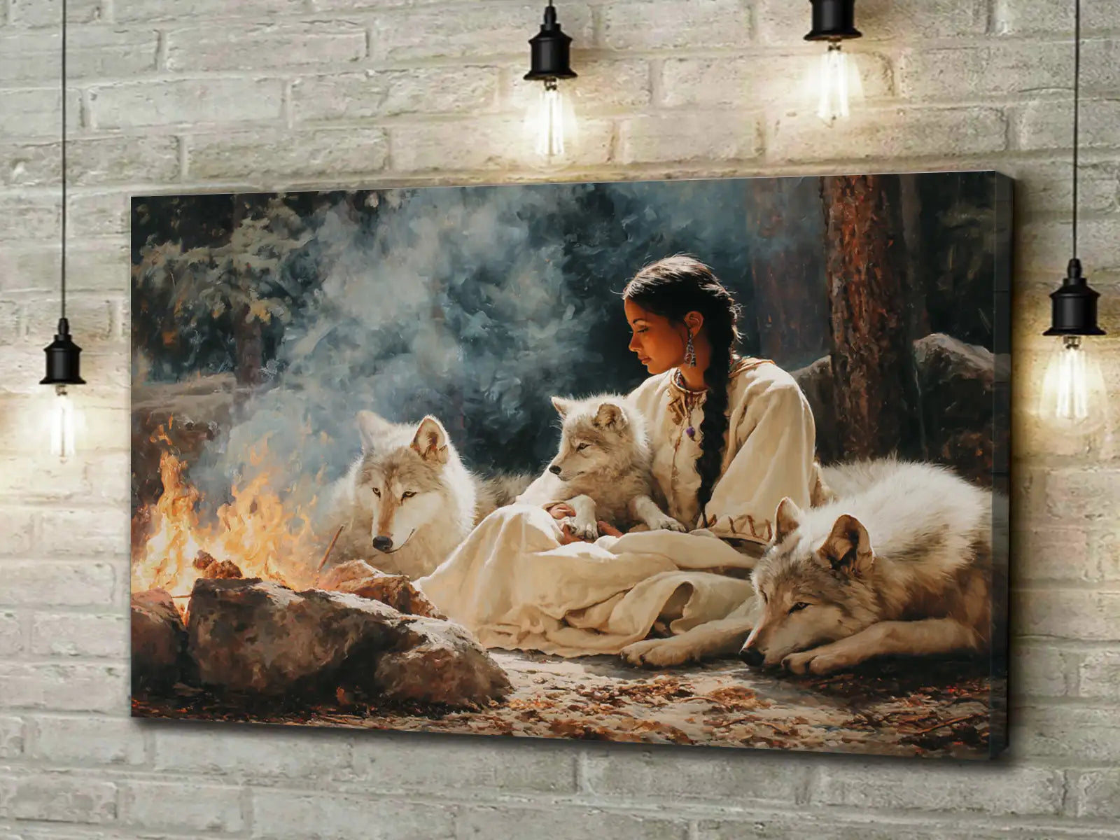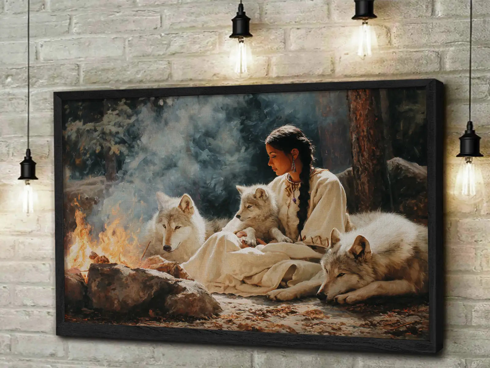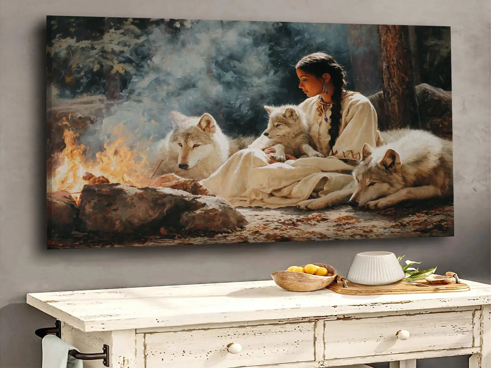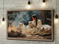 This captivating wall art portrays a tribal woman sitting by a fire surrounded by loyal wolves, inspired by the traditions of the Plains tribes. The artwork symbolizes harmony between humanity and nature, strength found in unity, and the sacred role of fire as a source of life and spirit. With every detail, from the calm gaze of the wolves to the serene presence of the woman, the painting invites reflection and respect for ancestral wisdom. Perfect as a centerpiece in any home, it embodies courage, connection, and the enduring bond between people, animals, and the natural world.