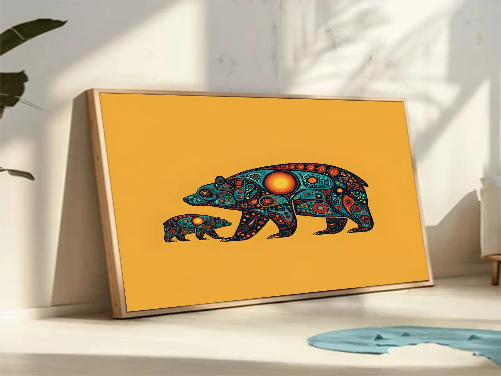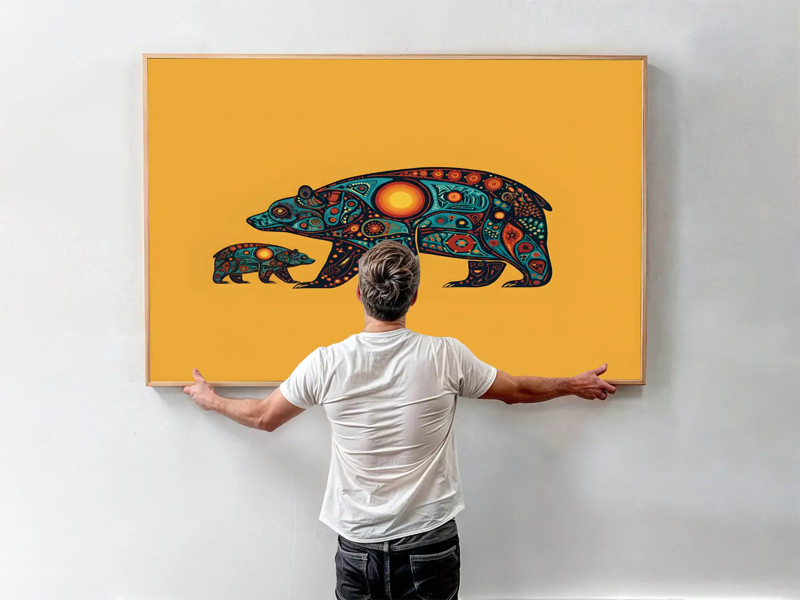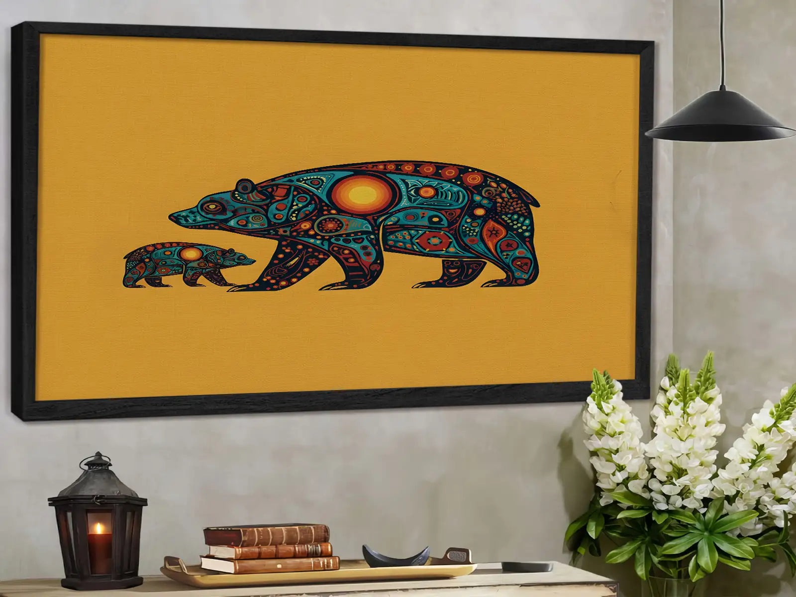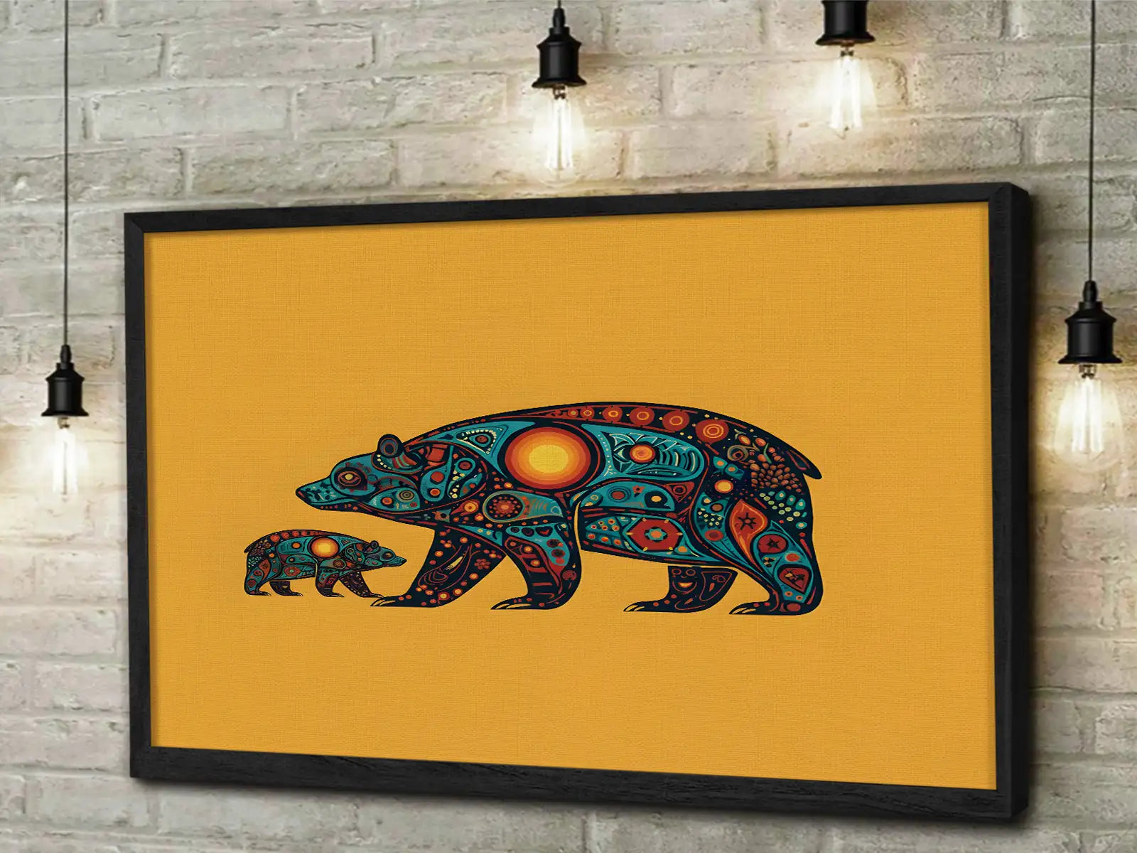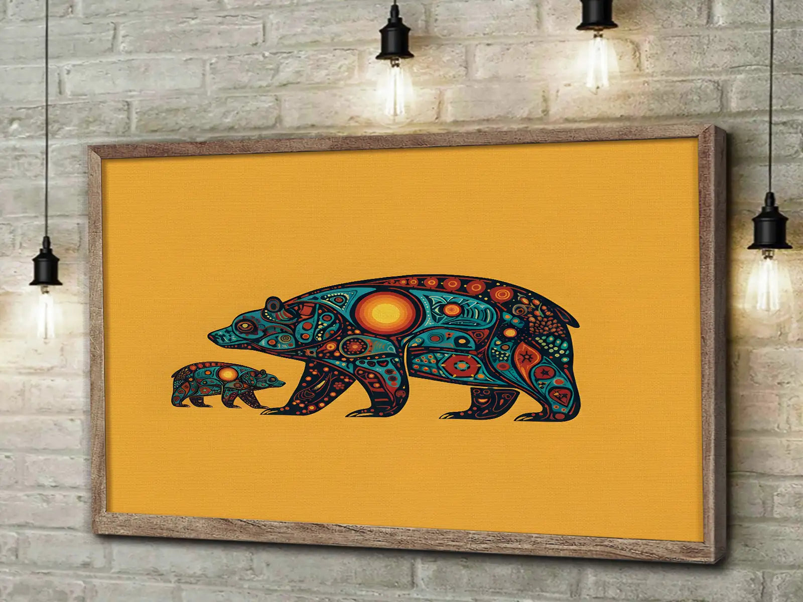 This striking wall art showcases a bear and cub rendered in the Woodland style, a tradition rooted in Anishinaabe visual storytelling. The vibrant patterns and radiant sun within the figures symbolize protection, family bonds, and the cycle of life. The bold use of turquoise, red, and orange creates a sense of vitality and spiritual energy, while the golden background enhances warmth and harmony. Known as the bear clan’s protector, the bear represents strength and healing. This artwork not only adds color and culture to any space but also carries deep meaning, making it a powerful centerpiece for home decor.