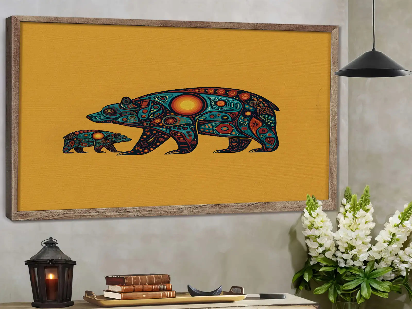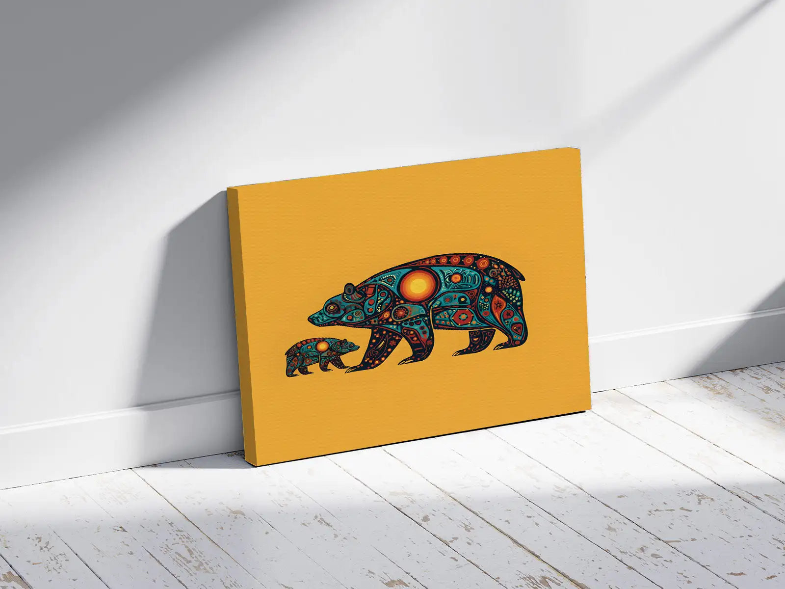 Woodland Style Bear Family Symbolic Canvas Decor, Native American Wall Art