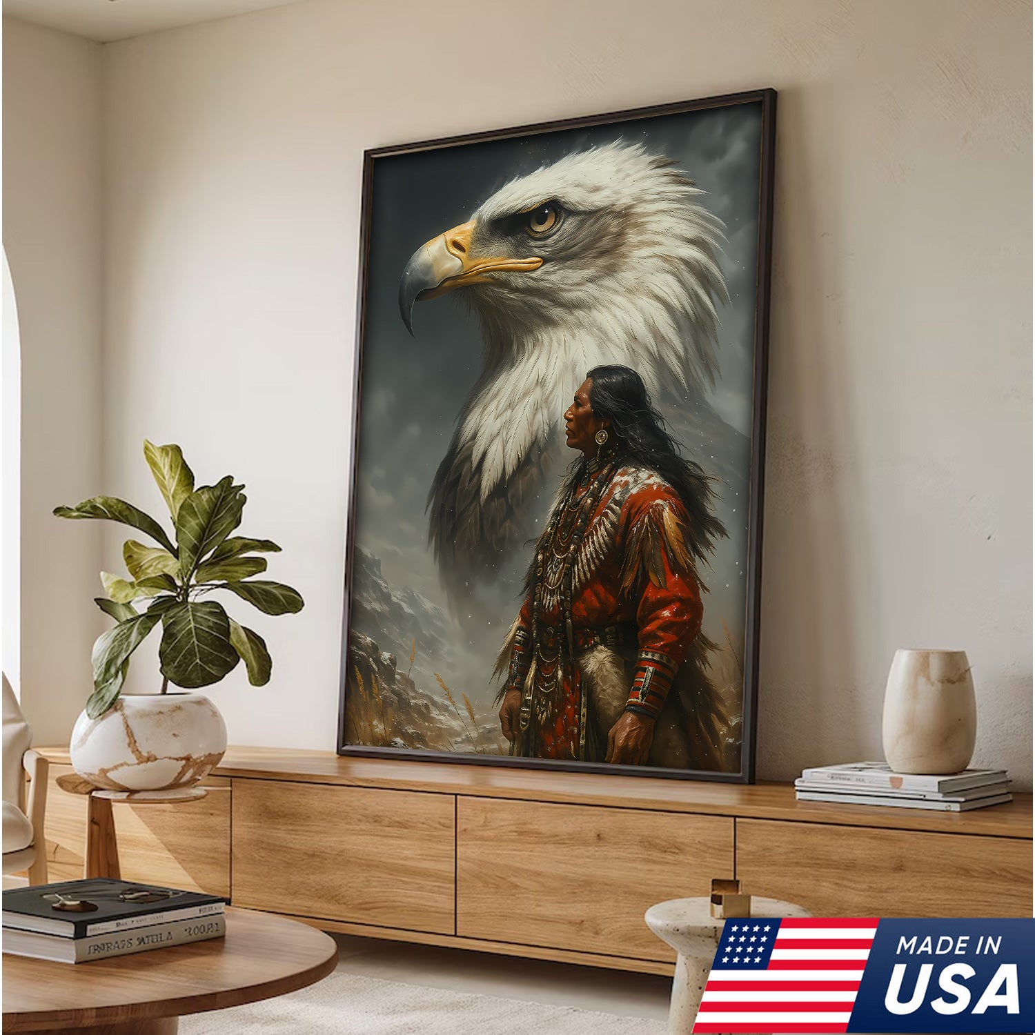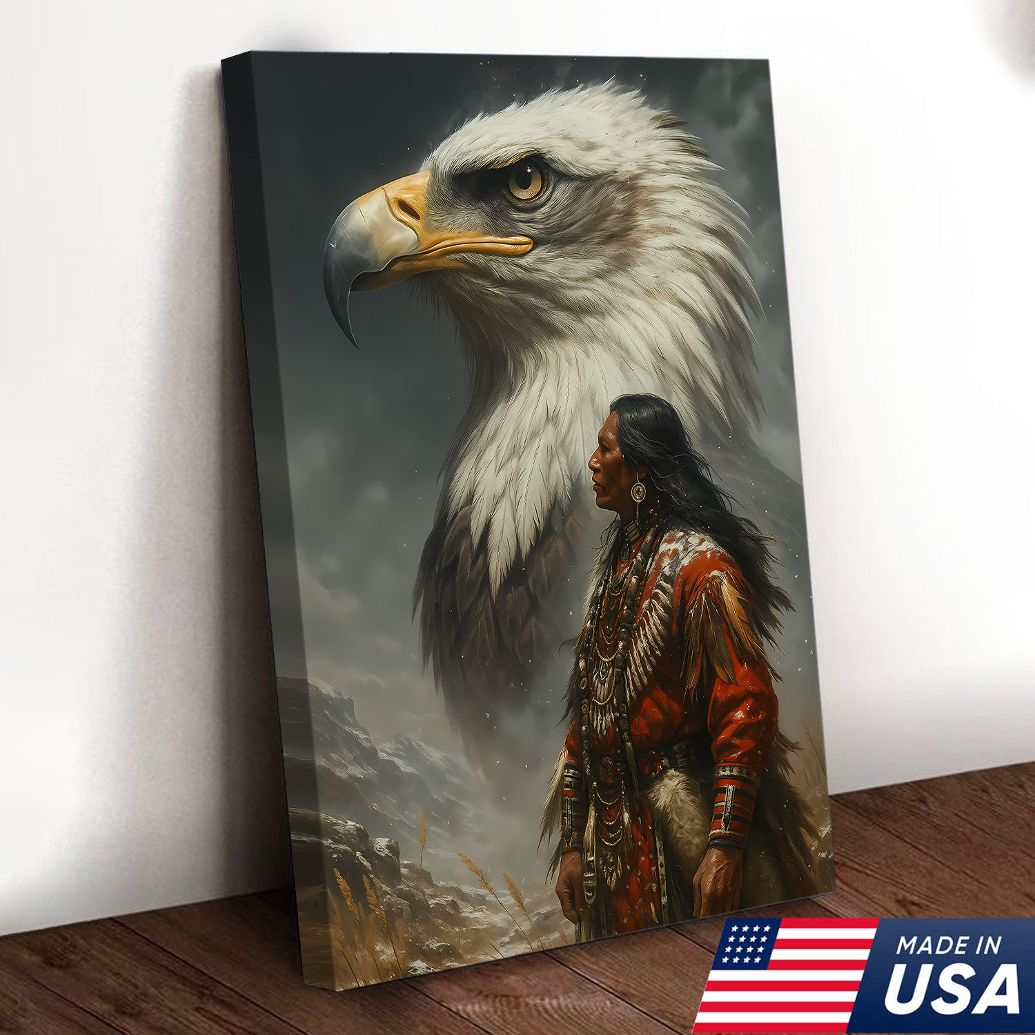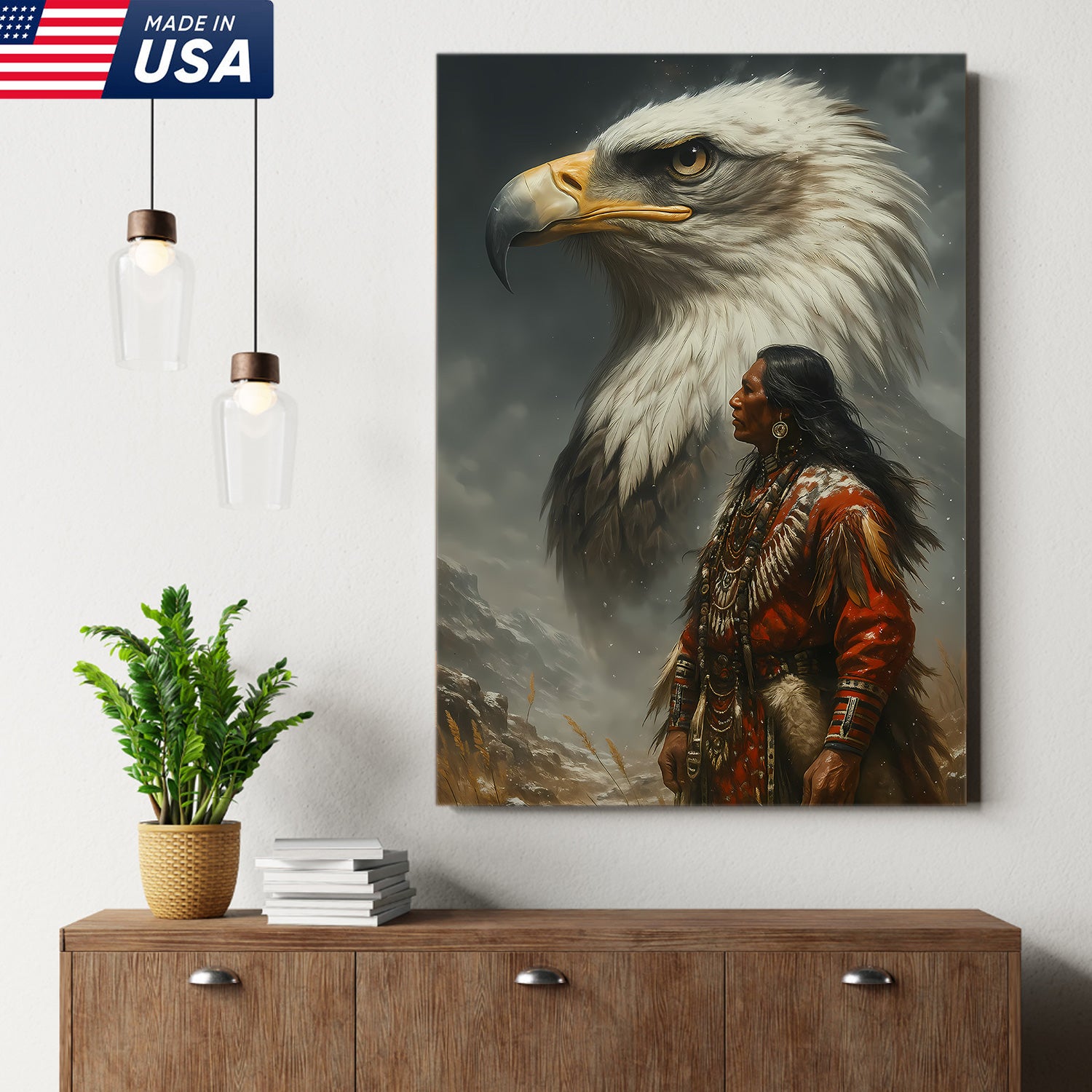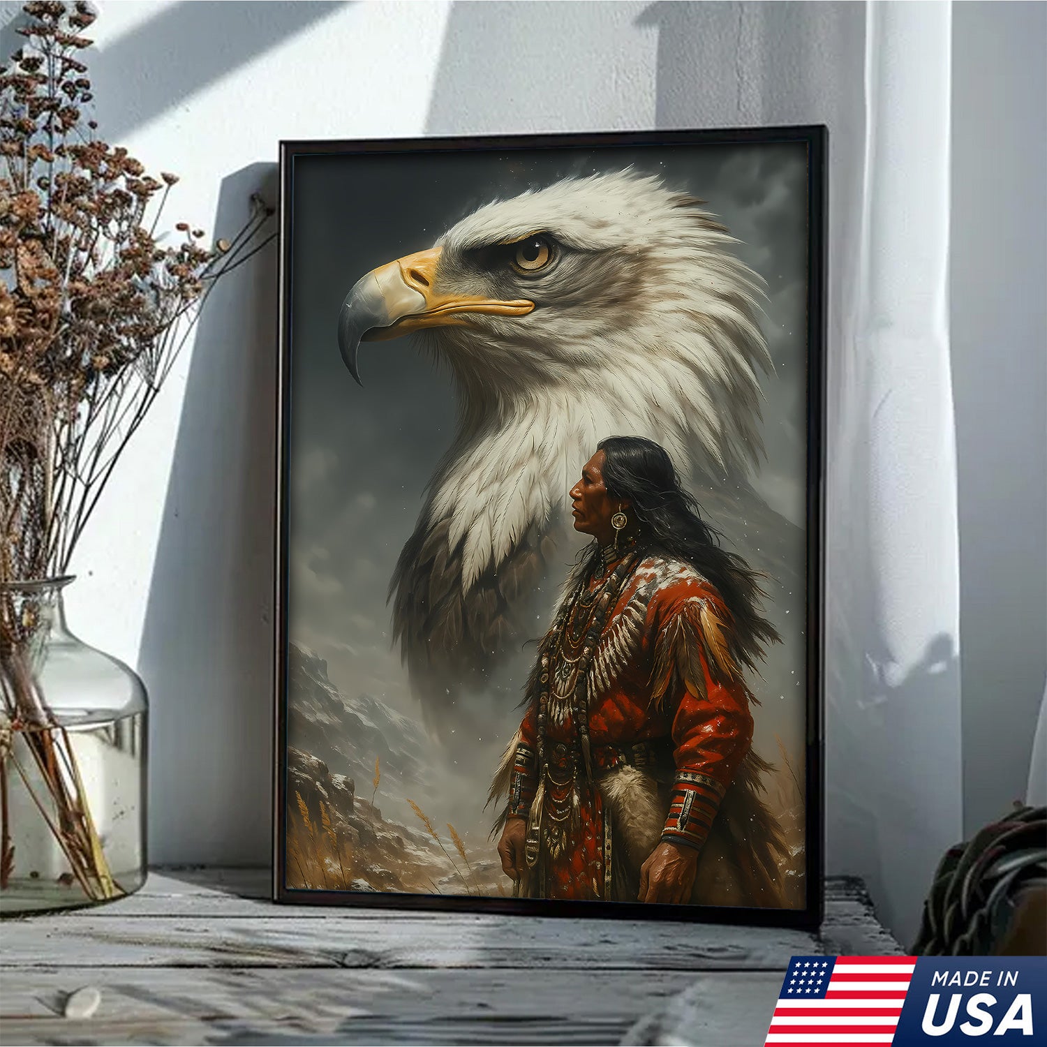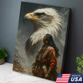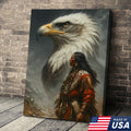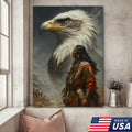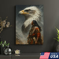 Native American Warrior & Bald Eagle Canvas Wall Art, Indigenous Spirit Animal Poster, Rustic Western Home Decor