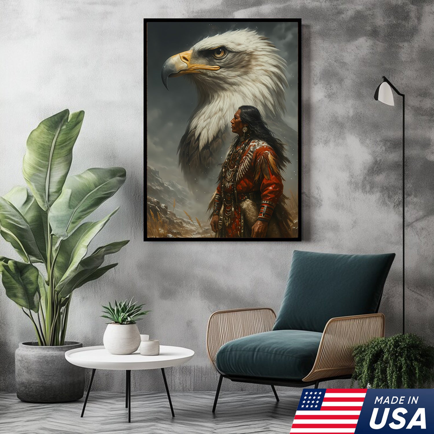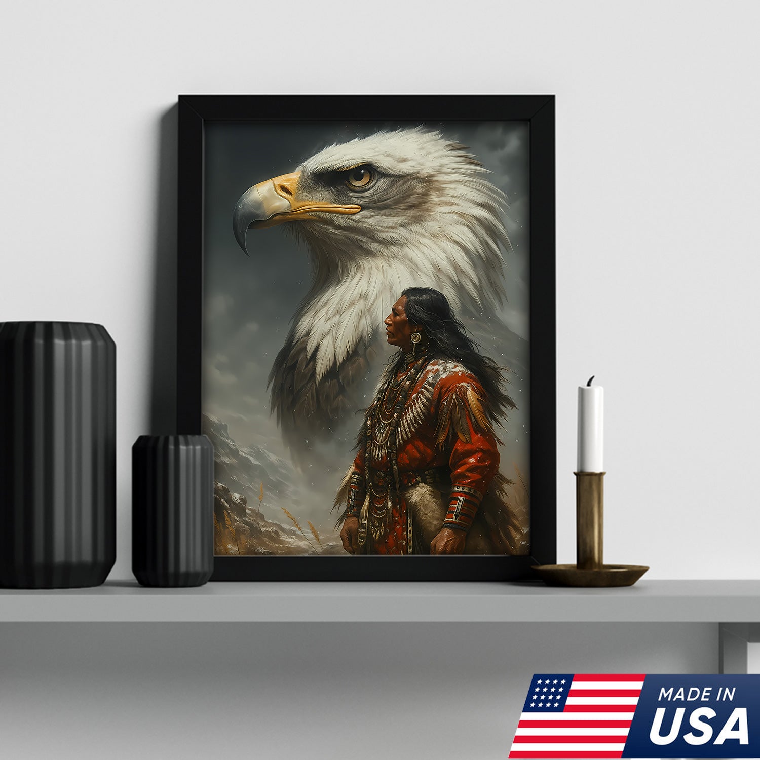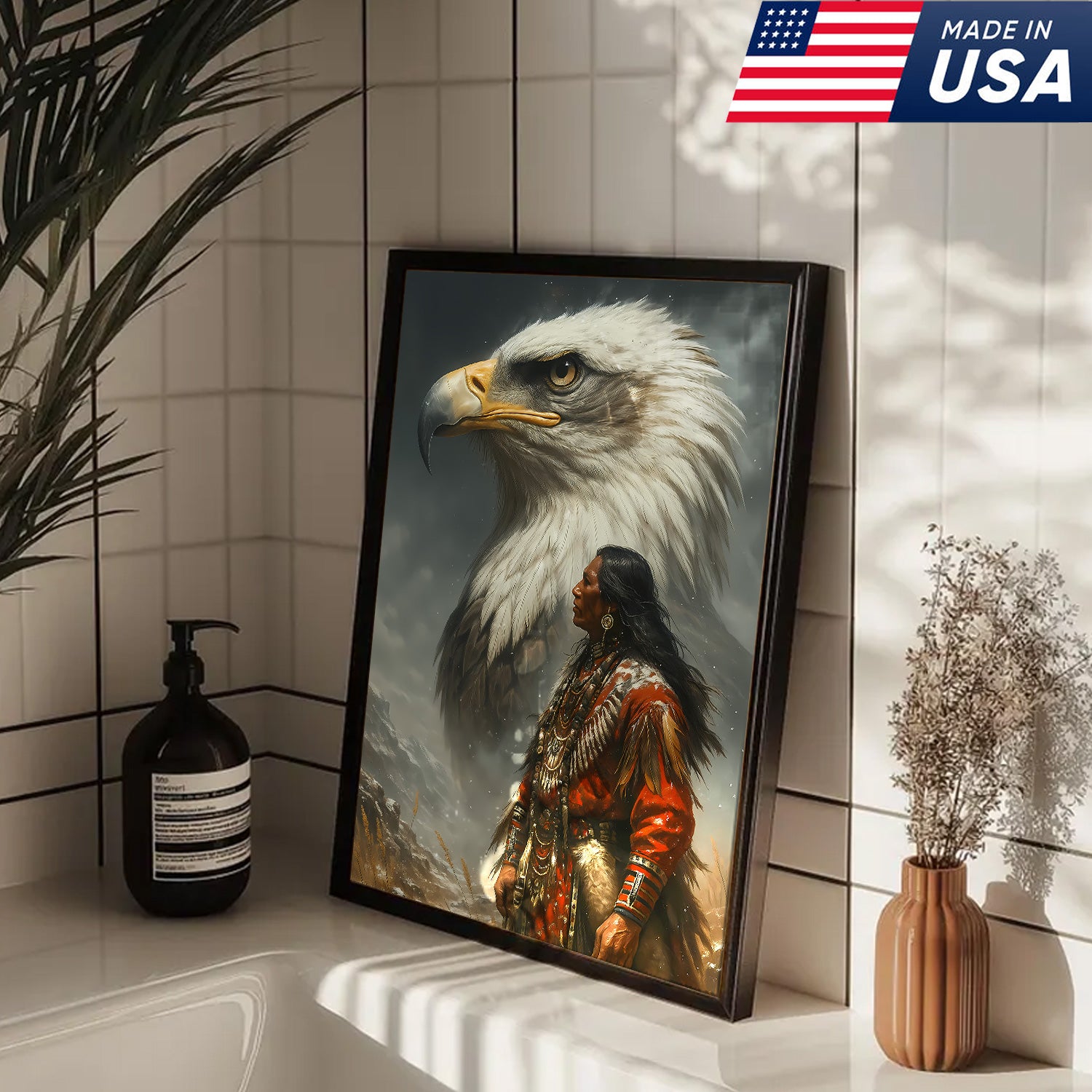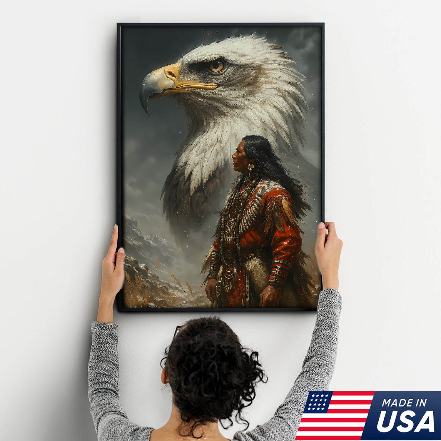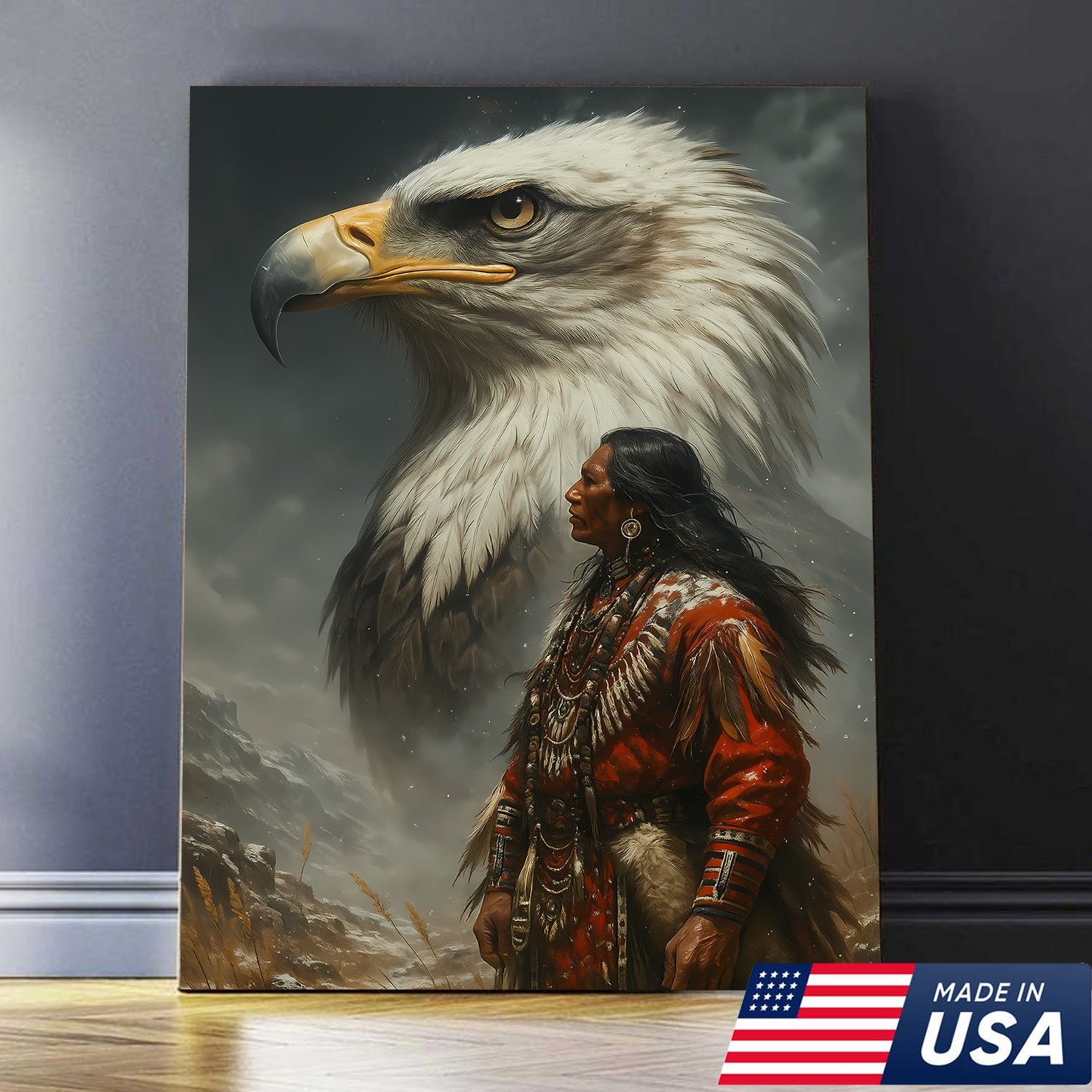 Native American Warrior & Bald Eagle Canvas Wall Art, Indigenous Spirit Animal Poster, Rustic Western Home Decor