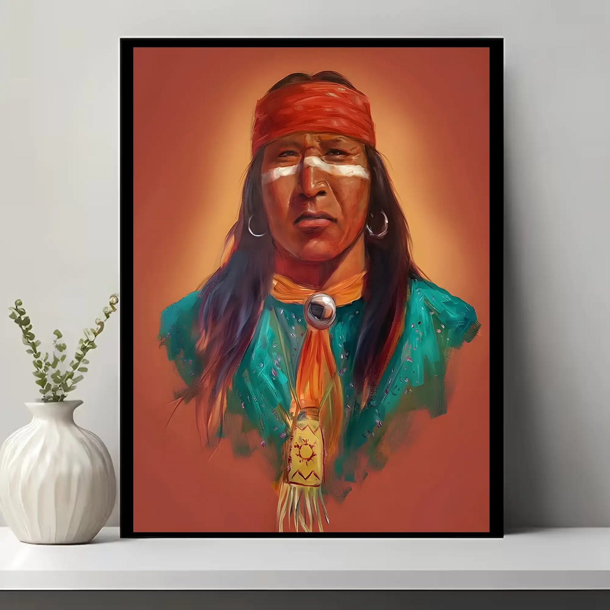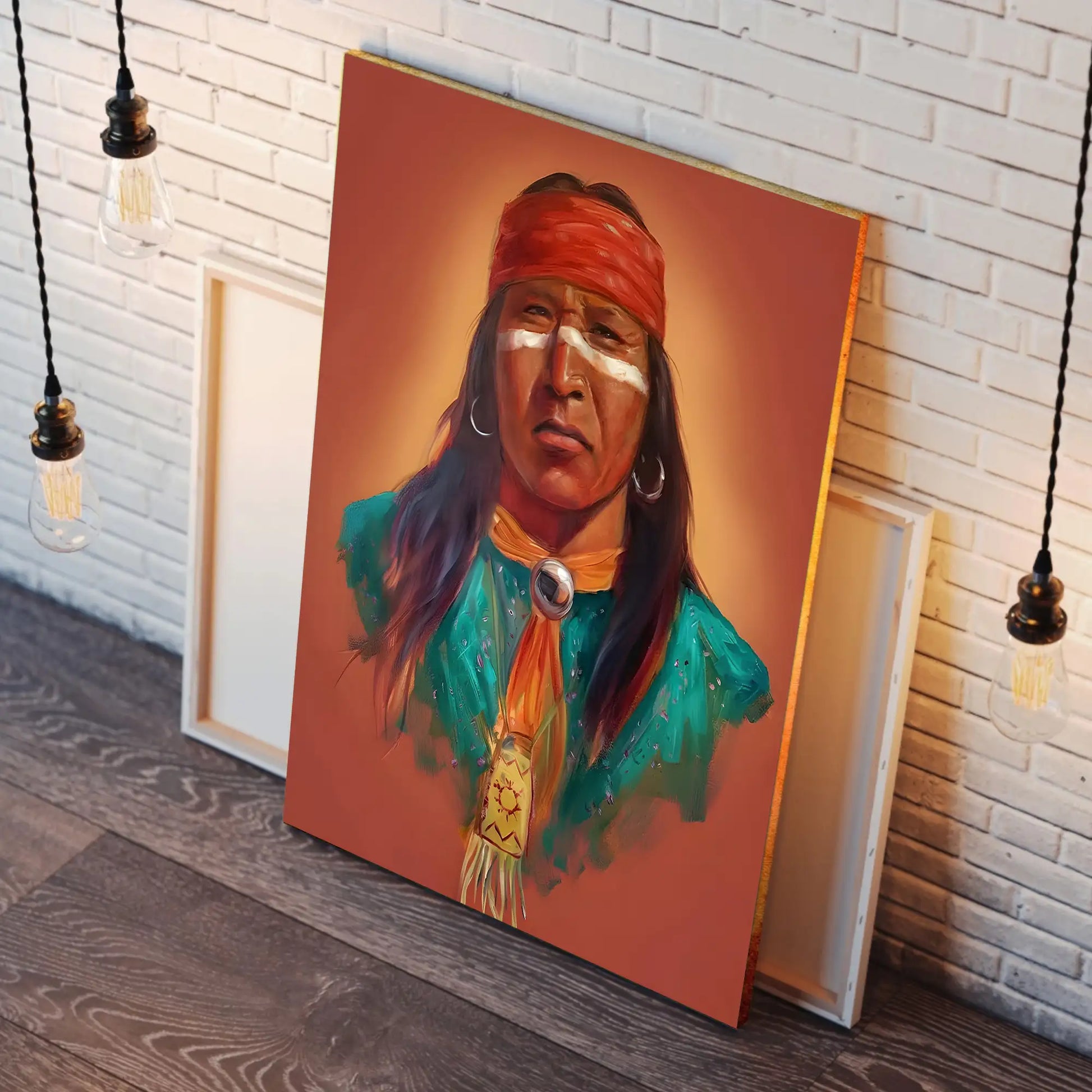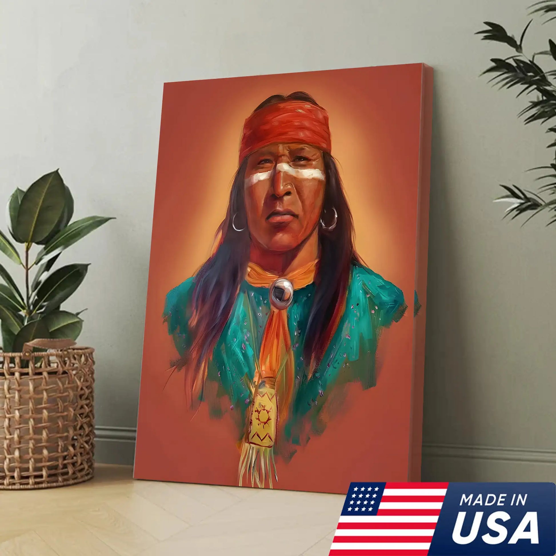 This striking wall art portrays a Native American chief, painted with bold colors that reflect strength, wisdom, and resilience. His steady gaze, framed by traditional attire with feathers, jewelry, and ceremonial paint, carries the spirit of leadership and cultural pride. The rich orange background symbolizes fire, life, and endurance, enhancing the intensity of the portrait. This canvas captures not only the appearance but also the essence of a warrior’s soul, honoring the traditions and stories of the tribe. Perfect for adding depth, meaning, and heritage to living spaces, offices, or art collections that celebrate identity and strength.