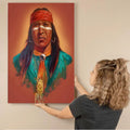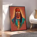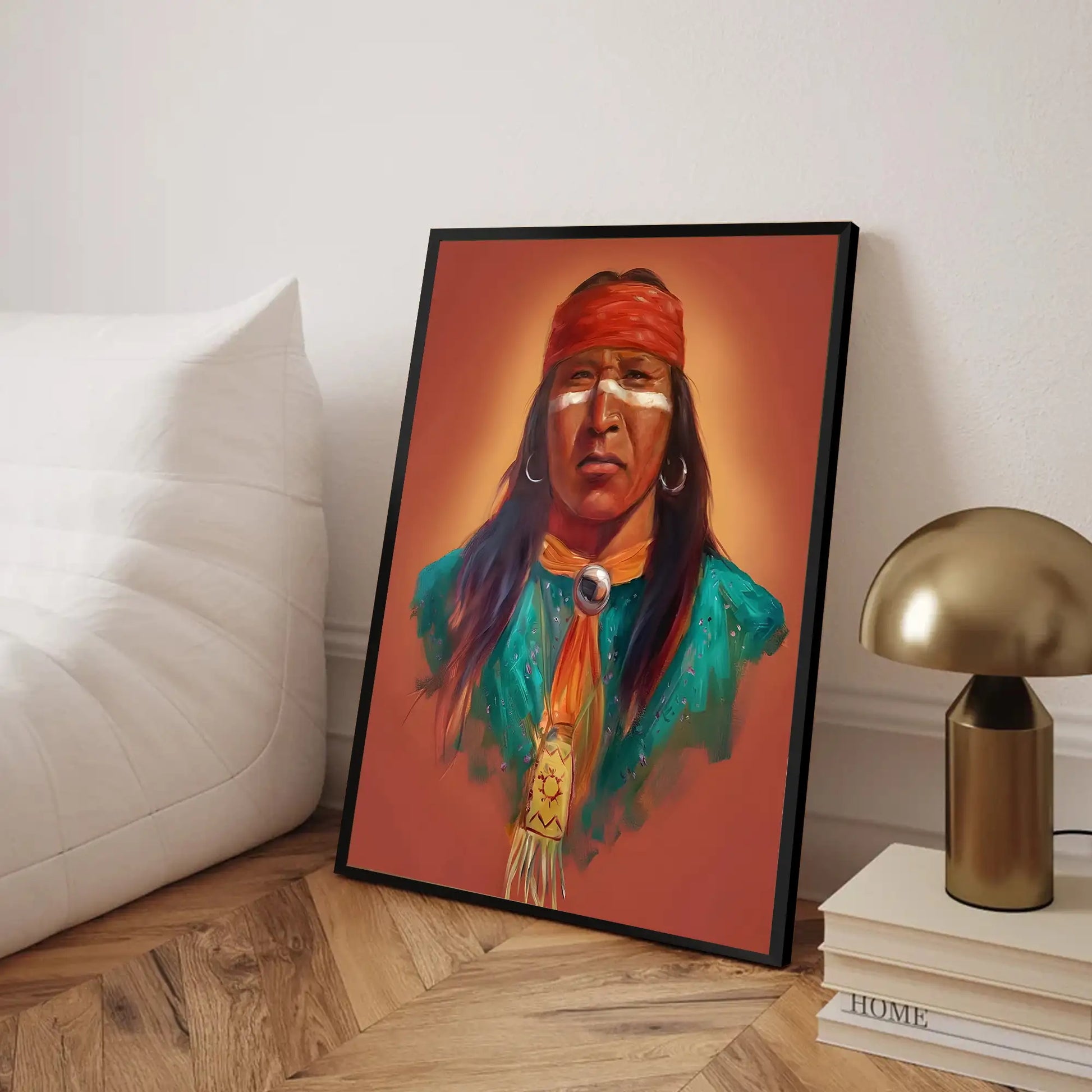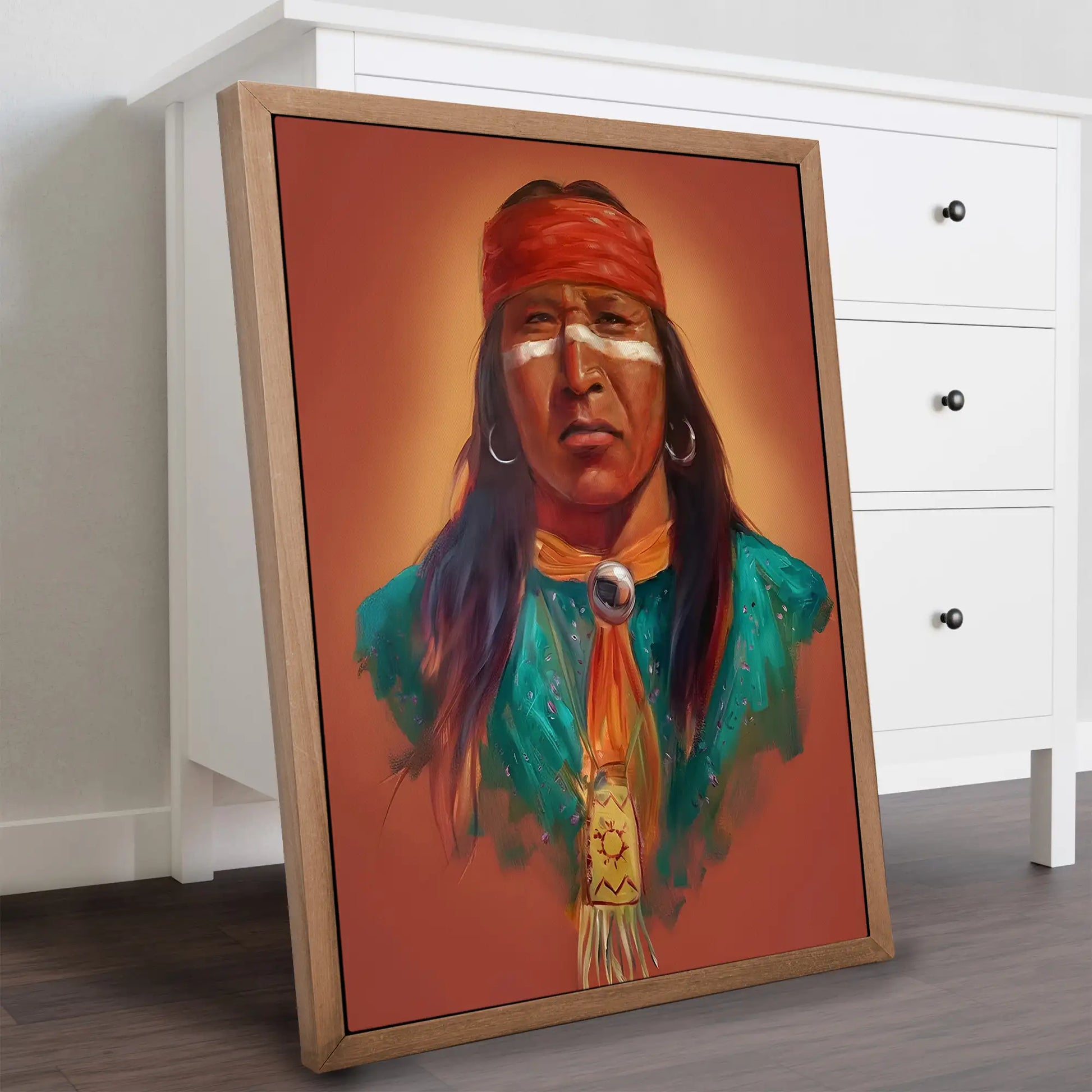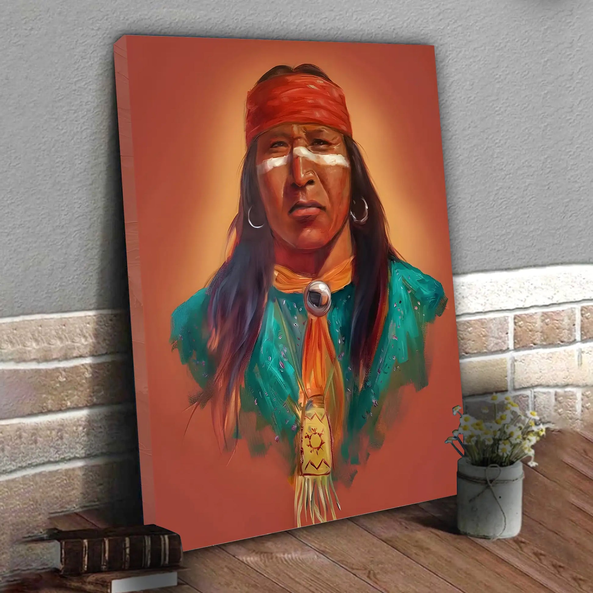 This striking wall art portrays a Native American chief, painted with bold colors that reflect strength, wisdom, and resilience. His steady gaze, framed by traditional attire with feathers, jewelry, and ceremonial paint, carries the spirit of leadership and cultural pride. The rich orange background symbolizes fire, life, and endurance, enhancing the intensity of the portrait. This canvas captures not only the appearance but also the essence of a warrior’s soul, honoring the traditions and stories of the tribe. Perfect for adding depth, meaning, and heritage to living spaces, offices, or art collections that celebrate identity and strength.
