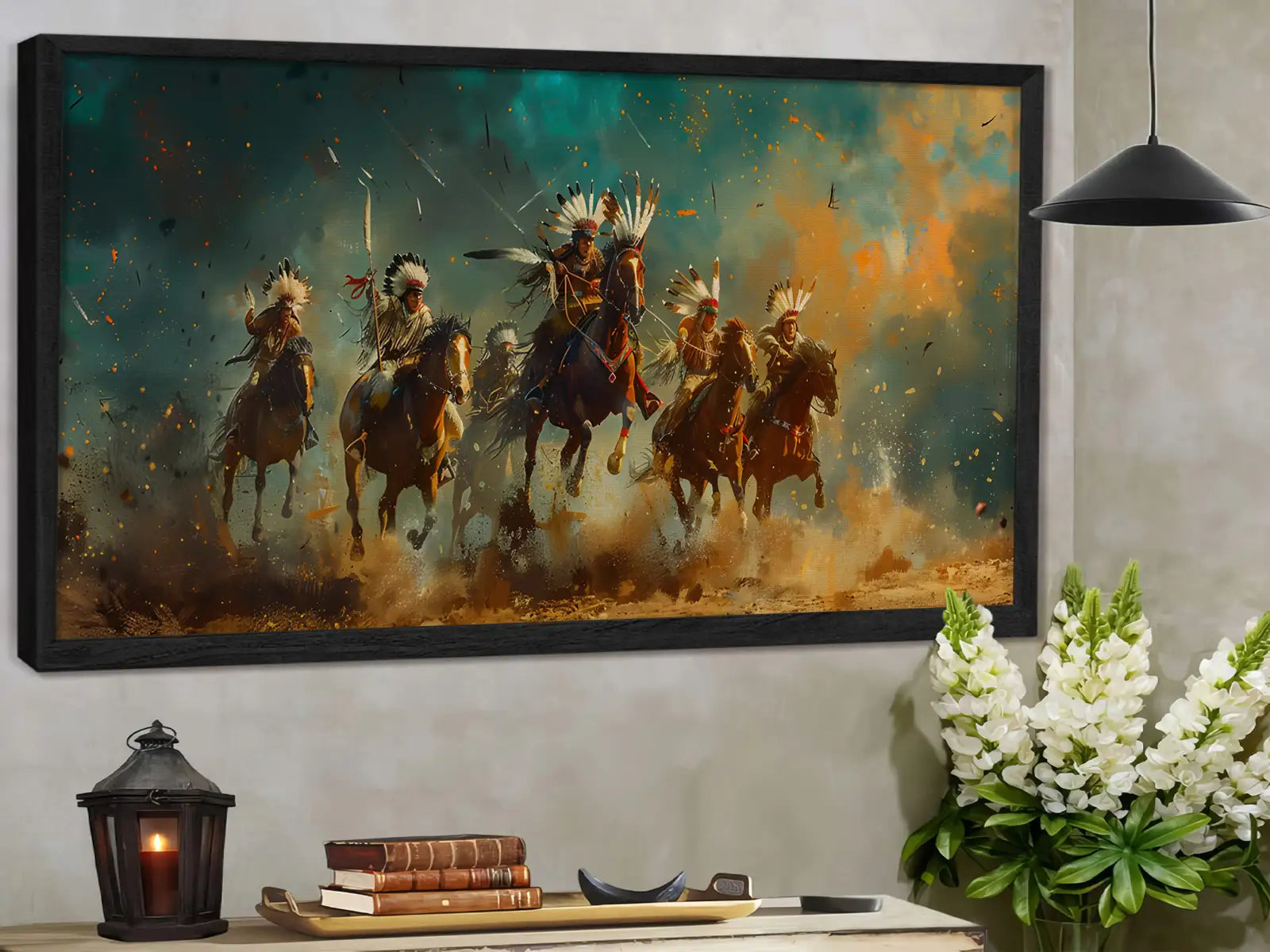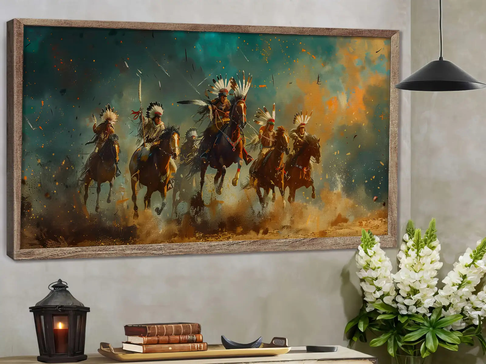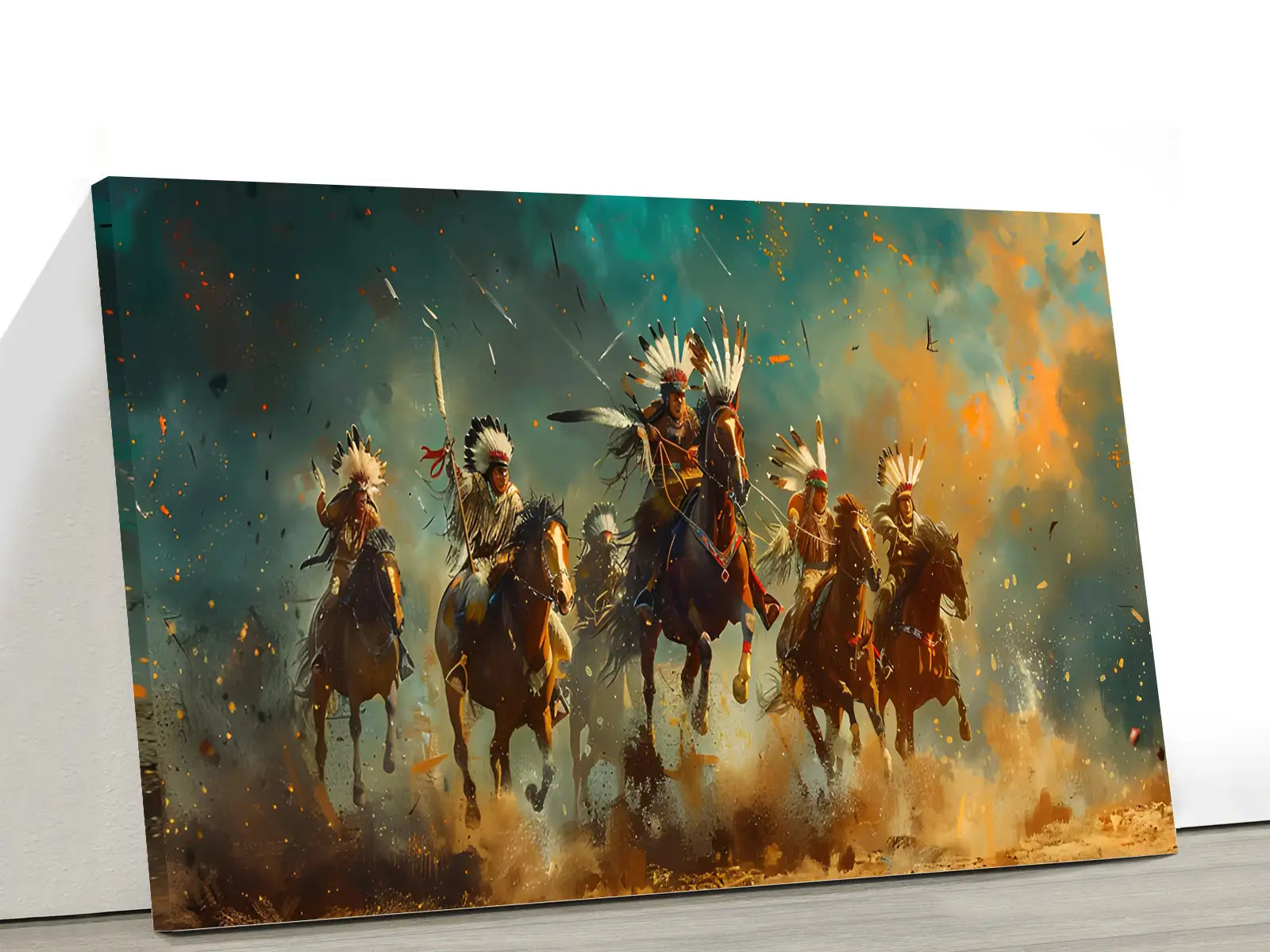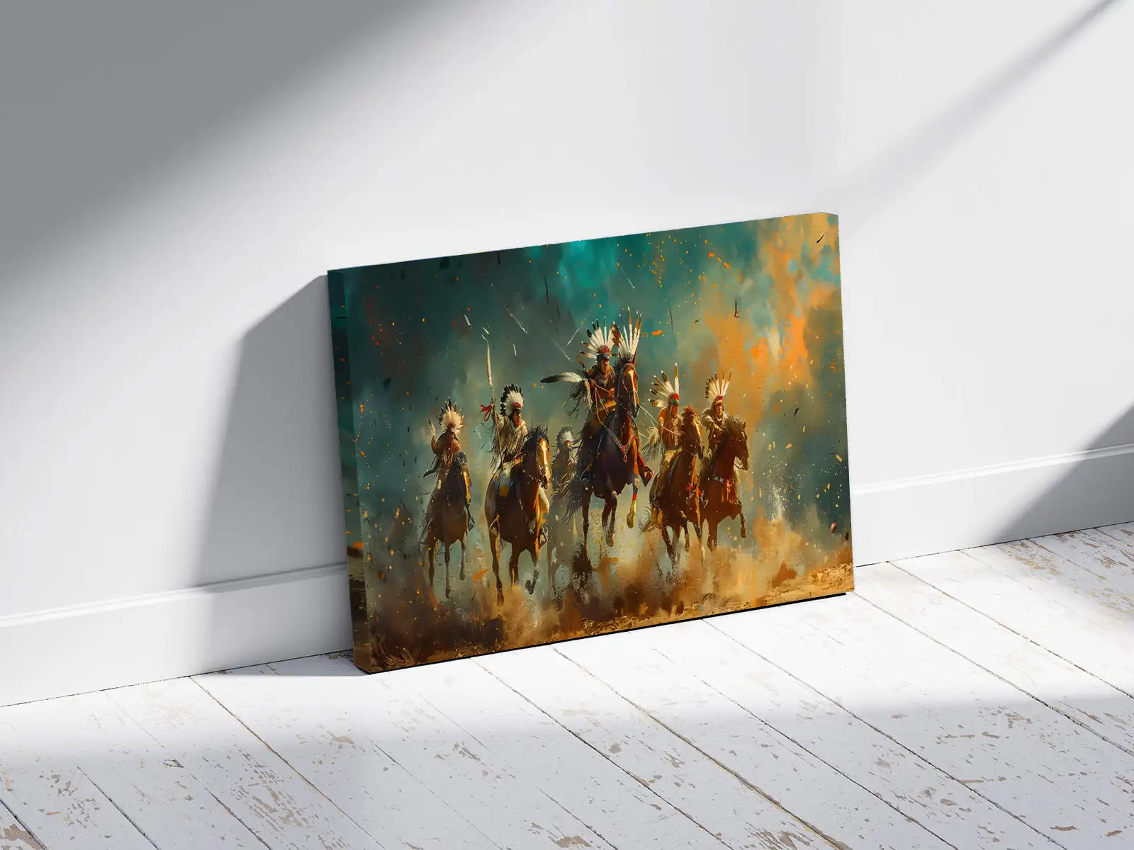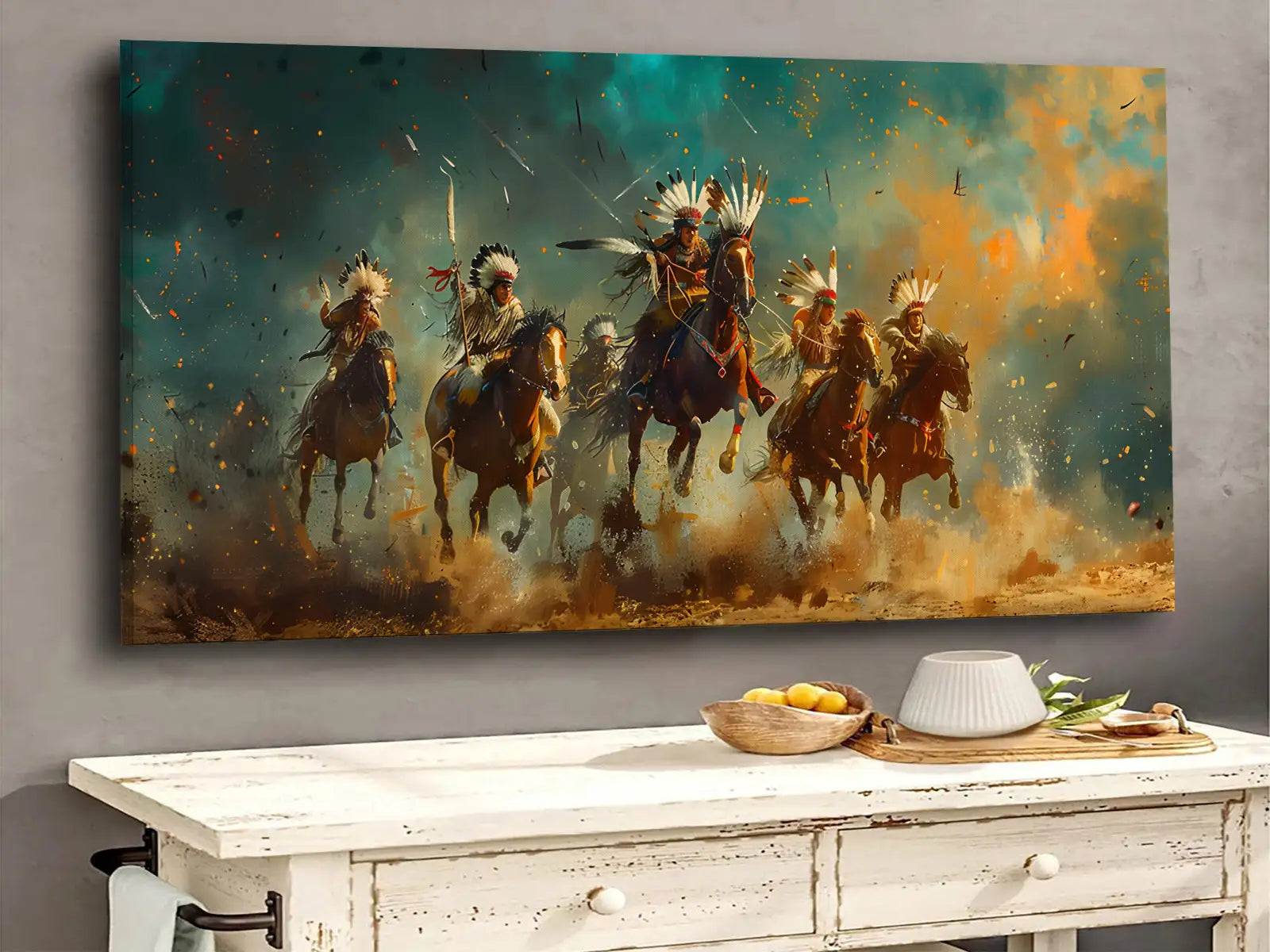 This powerful wall art depicts a group of Native American warriors riding horses across the plains, their headdresses flowing as they charge forward with strength and unity. The scene draws inspiration from Plains tribes such as the Lakota and Cheyenne, where horses symbolized freedom, speed, and spiritual connection. Warriors on horseback were not only defenders of their people but also symbols of courage and pride. The dramatic sky and fiery tones bring intensity and motion to the design, making it an inspiring piece. Perfect for rustic homes, western bars, or cultural collections, this canvas embodies bravery and tradition.