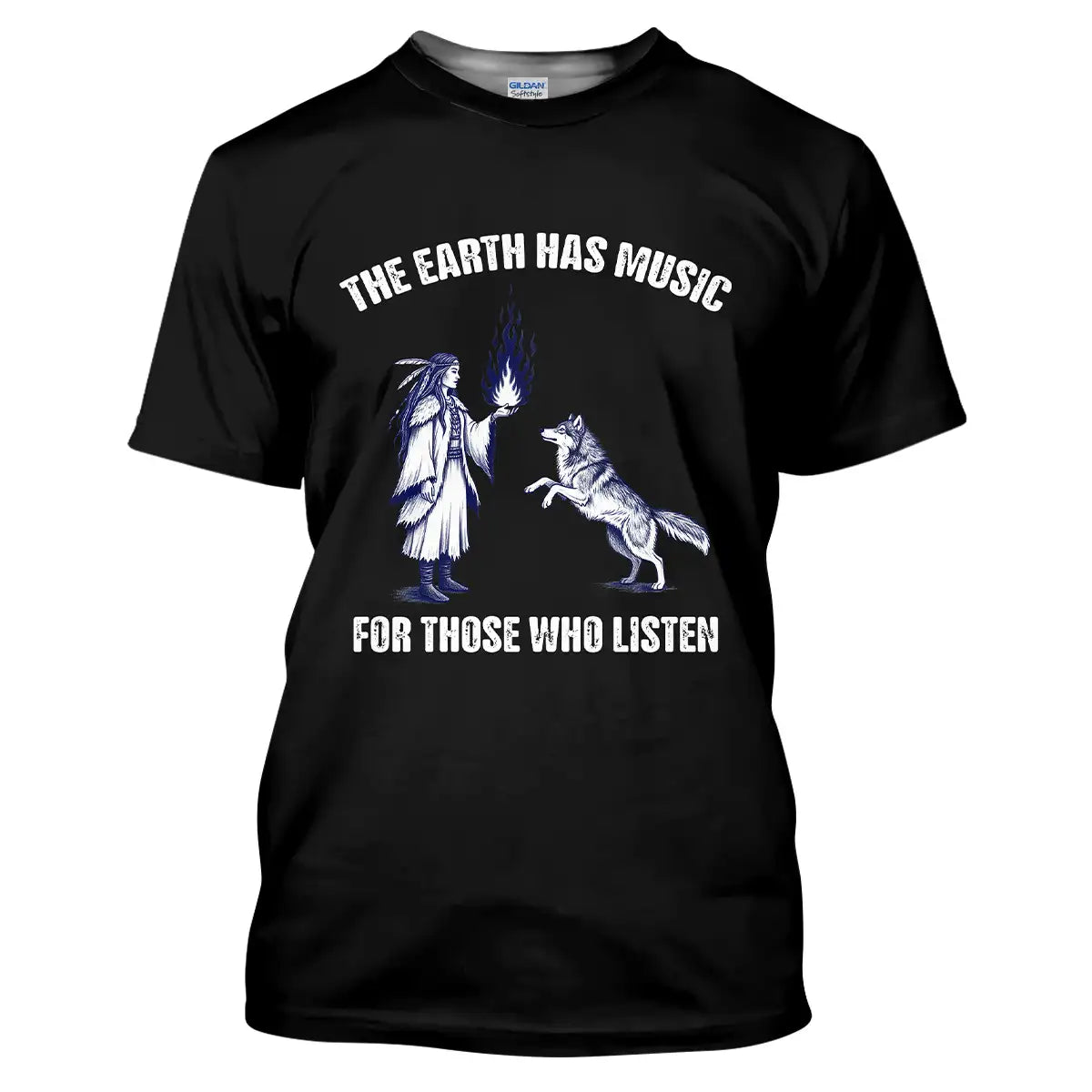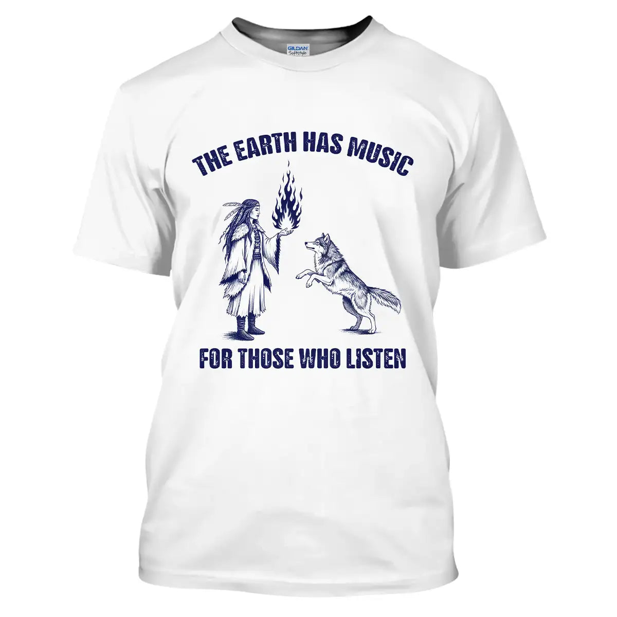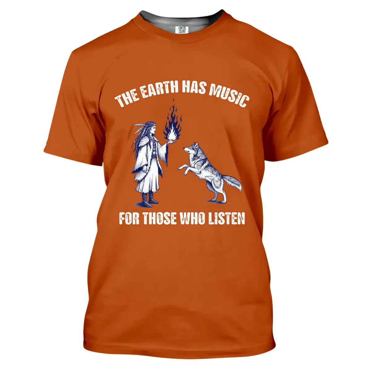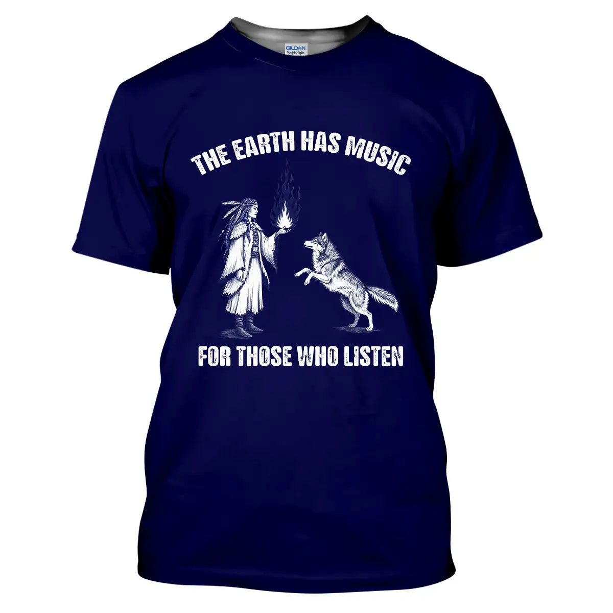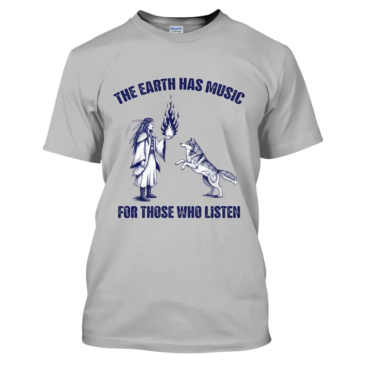 Designed by the deep connection between Native American tribes and the natural world, this T-shirt carries the quote The Earth Has Music For Those Who Listen, a reminder to embrace the beauty and harmony of nature. The design features a Native American figure and a wolf, symbols of loyalty, wisdom, and inner strength. Crafted to celebrate culture and spirituality, this shirt is more than clothing—it is an expression of respect for the Earth and its creatures. Perfect for free spirits, nature enthusiasts, and those who find peace in tradition, this unique piece blends comfort, meaning, and timeless tribal art.