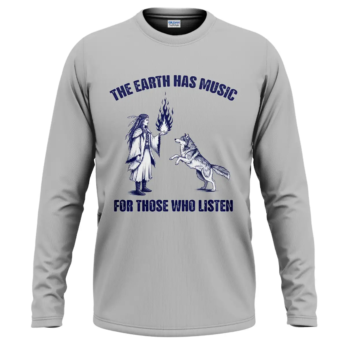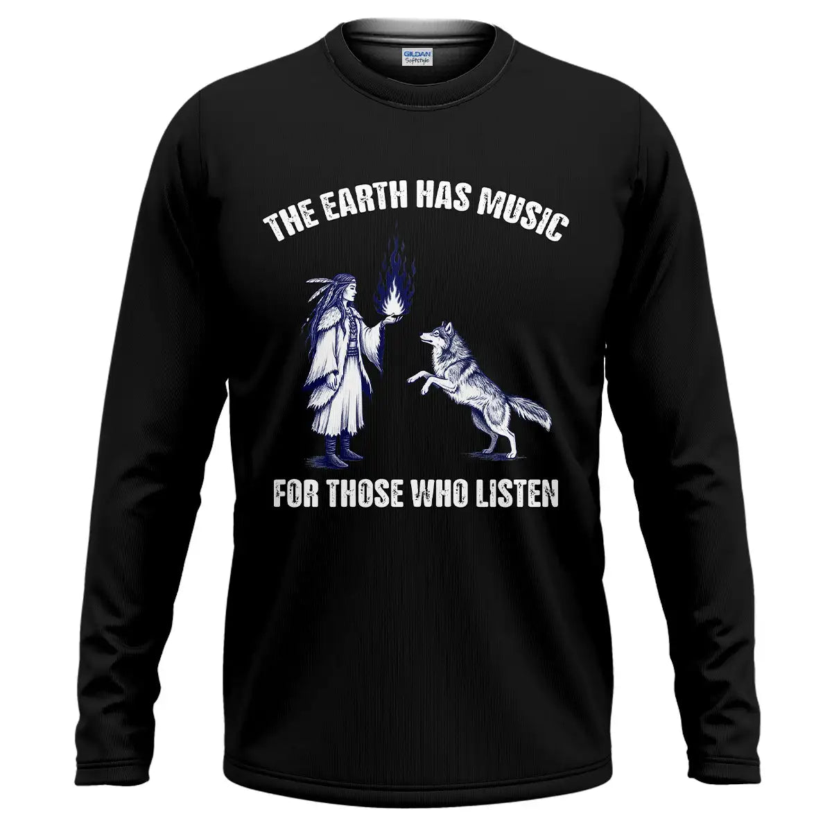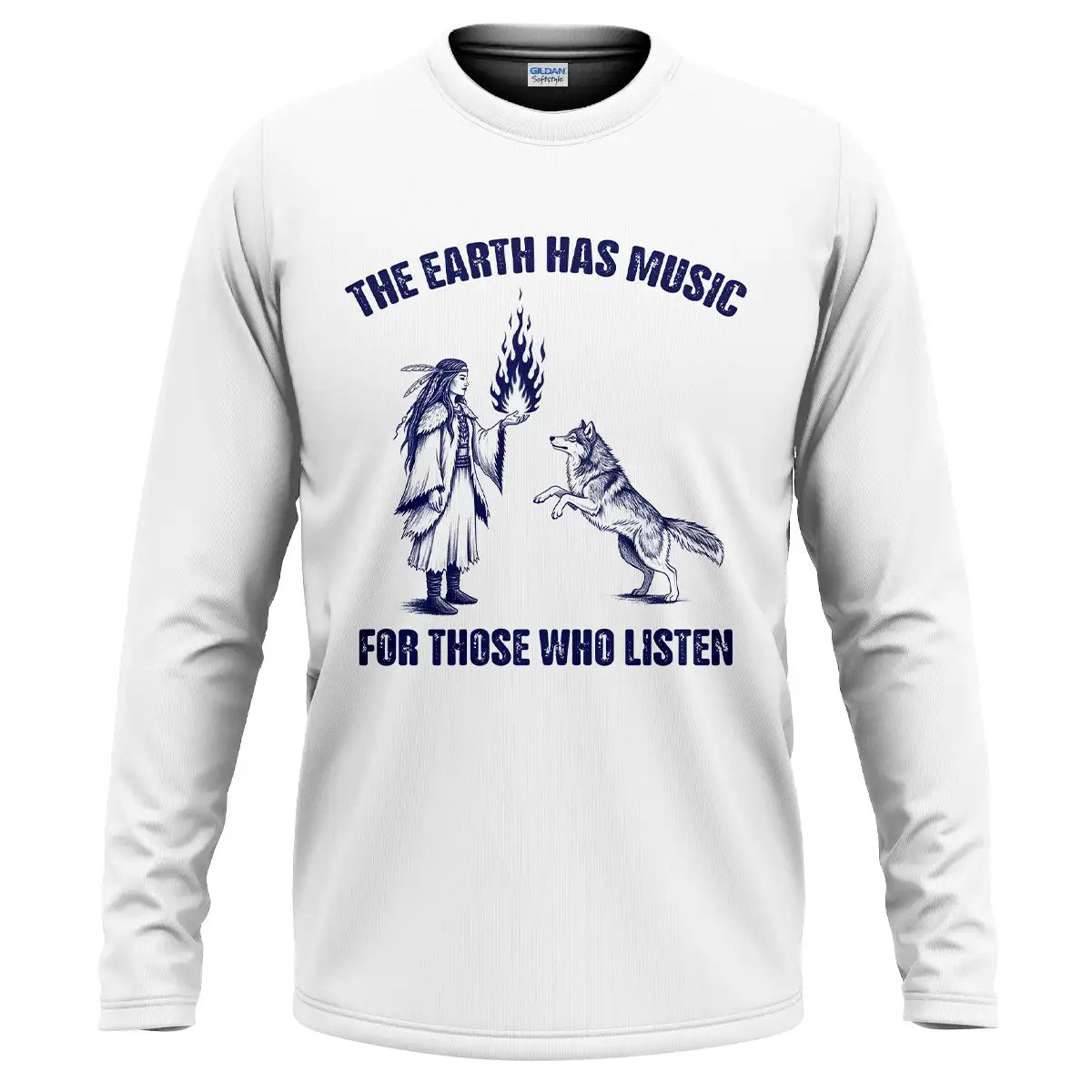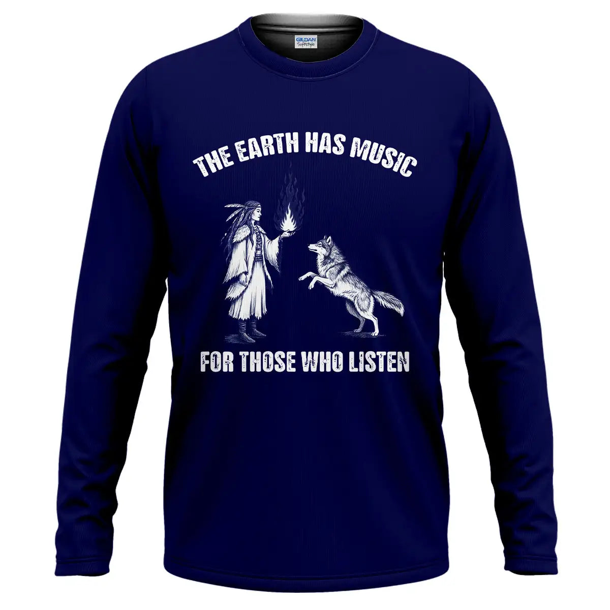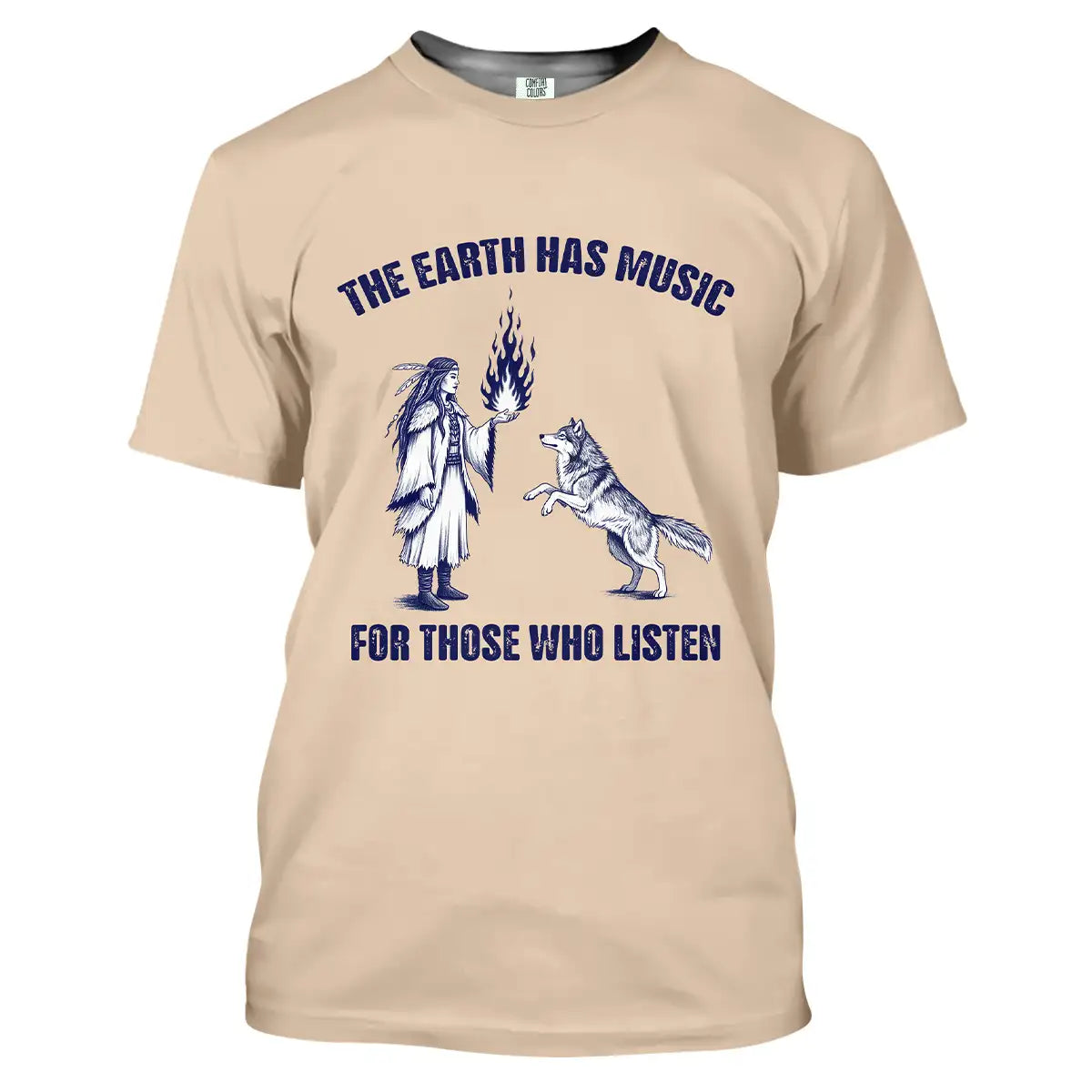 Designed by the deep connection between Native American tribes and the natural world, this T-shirt carries the quote The Earth Has Music For Those Who Listen, a reminder to embrace the beauty and harmony of nature. The design features a Native American figure and a wolf, symbols of loyalty, wisdom, and inner strength. Crafted to celebrate culture and spirituality, this shirt is more than clothing—it is an expression of respect for the Earth and its creatures. Perfect for free spirits, nature enthusiasts, and those who find peace in tradition, this unique piece blends comfort, meaning, and timeless tribal art.