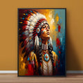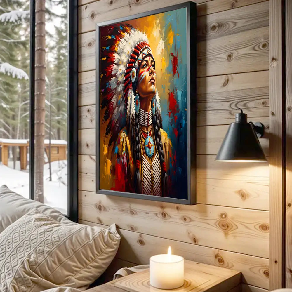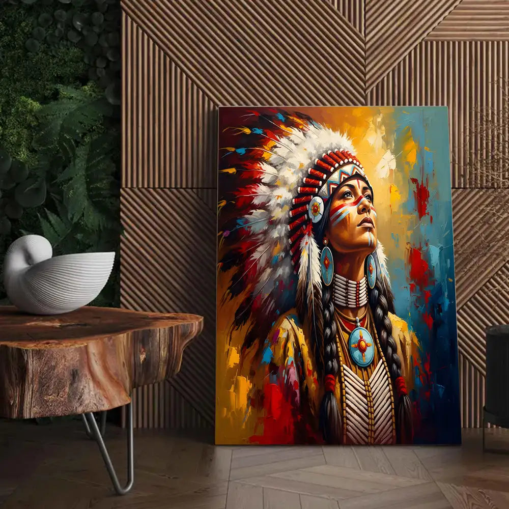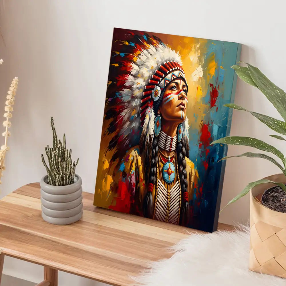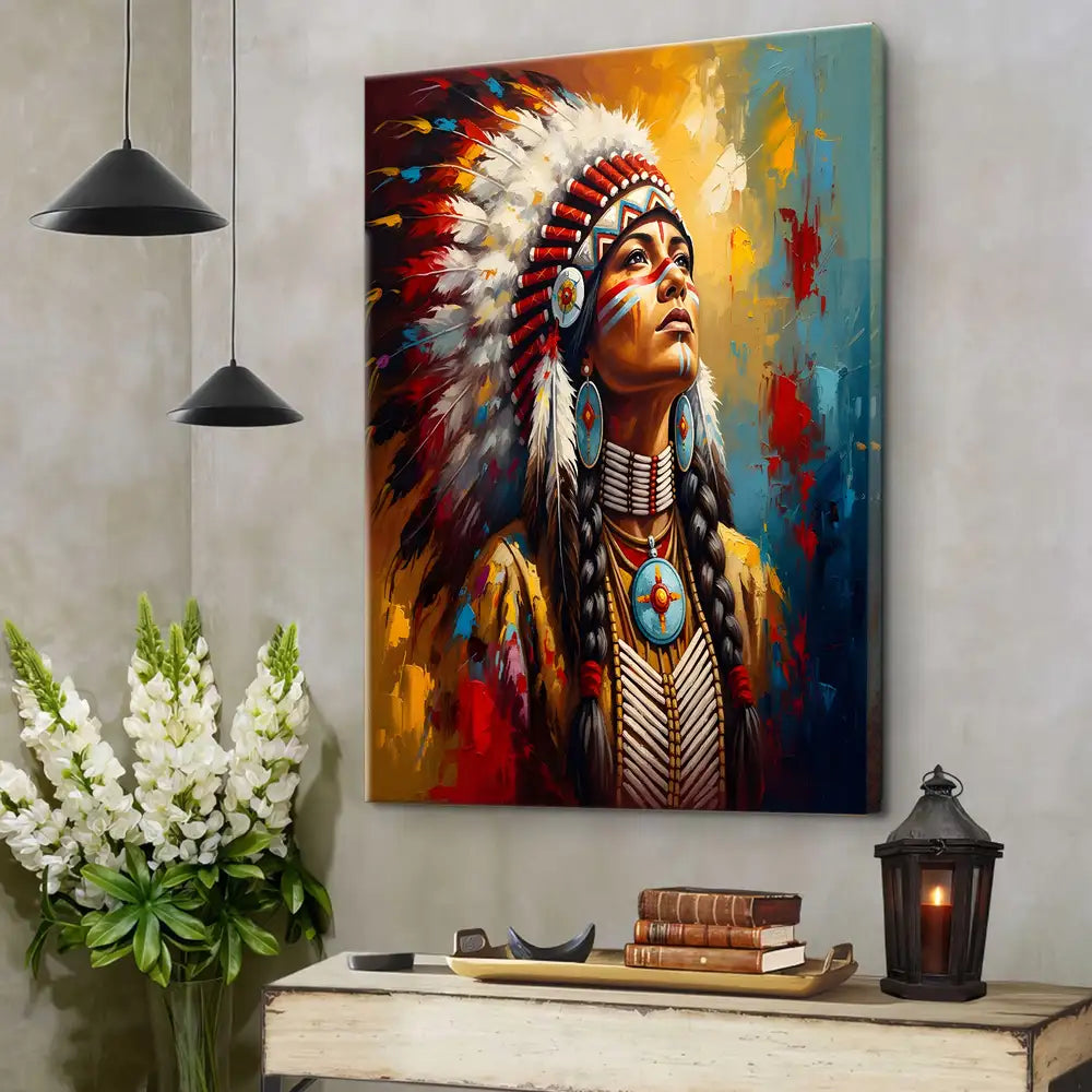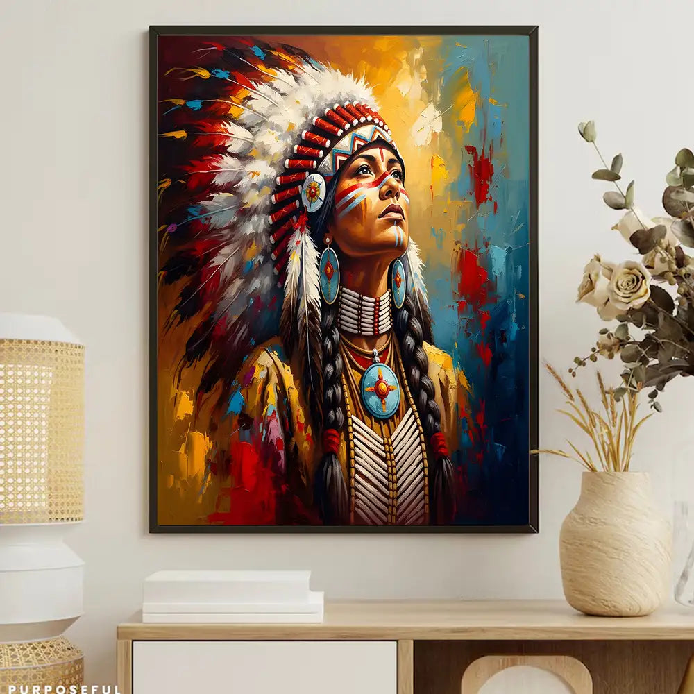 This striking Native American canvas art captures the strength and spirit of a tribal woman chief wearing a traditional feathered headdress. designed by the Plains tribes, the artwork symbolizes courage, wisdom, and leadership. The vibrant colors and bold brushstrokes create a powerful and emotional presence, making it a captivating centerpiece for any space. Perfect for those who appreciate Native culture and artistic expression, this wall art brings heritage and inspiration into your home while honoring the beauty and strength of Native traditions.