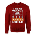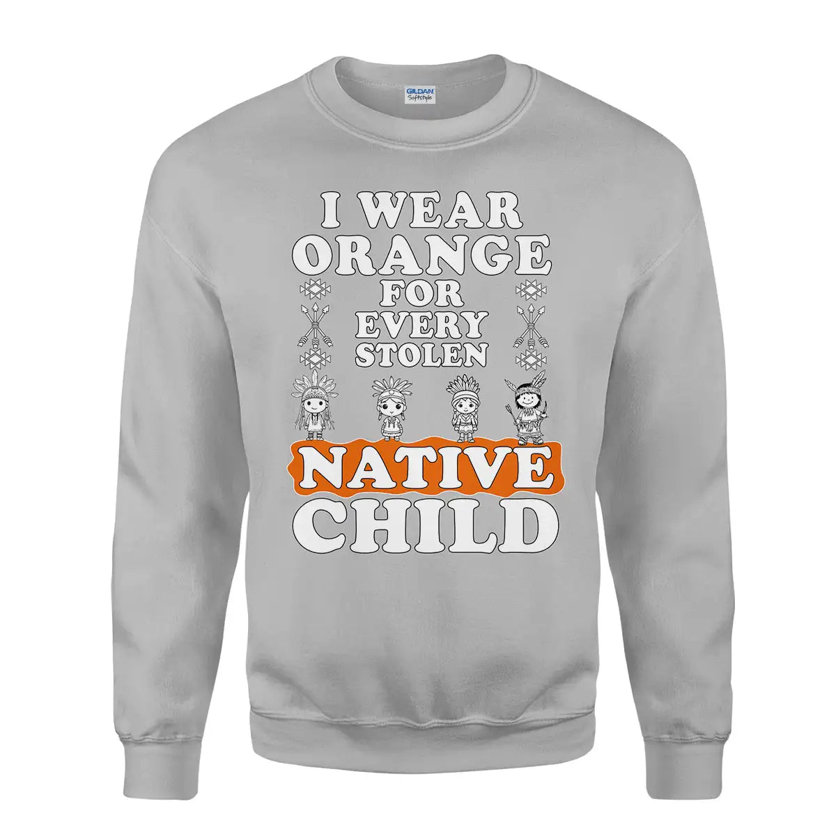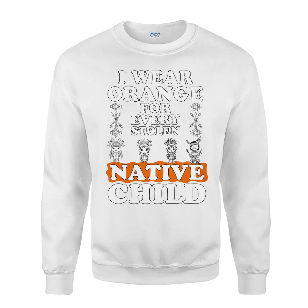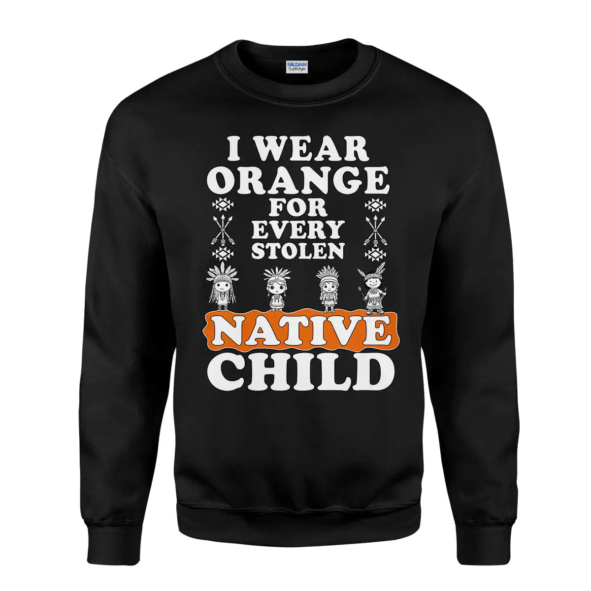 Drawn from Plains and Great Lakes communities, this design carries remembrance and care. Bright white lettering on deep black centers the pledge I wear orange for every stolen Native child. Small child figures and floral motifs echo beadwork and ribbon patterns seen at gatherings, walks, and classrooms. Many customers want apparel that feels respectful, meaningful, and comfortable rather than loud slogans. This crewneck is made soft and warm with durable print so the message lasts. Wear it to start gentle conversation, lift survivors, and keep memory close. Every purchase helps keep attention on safety, language, and home for children everywhere.