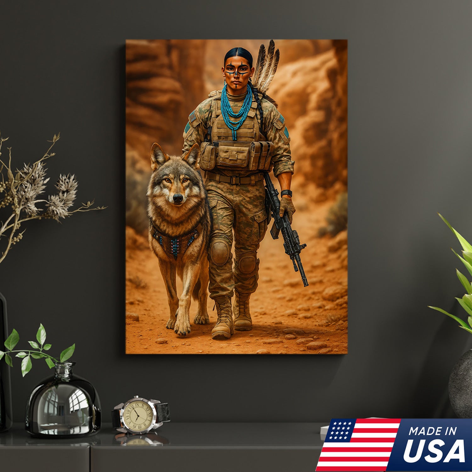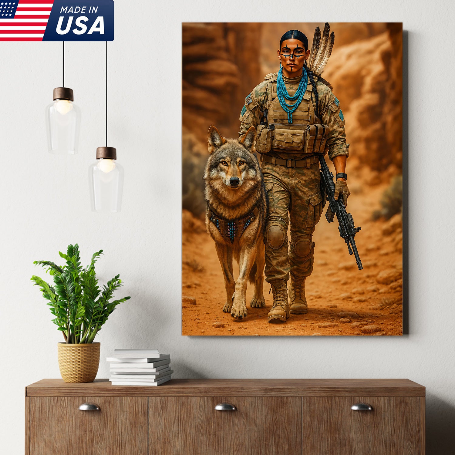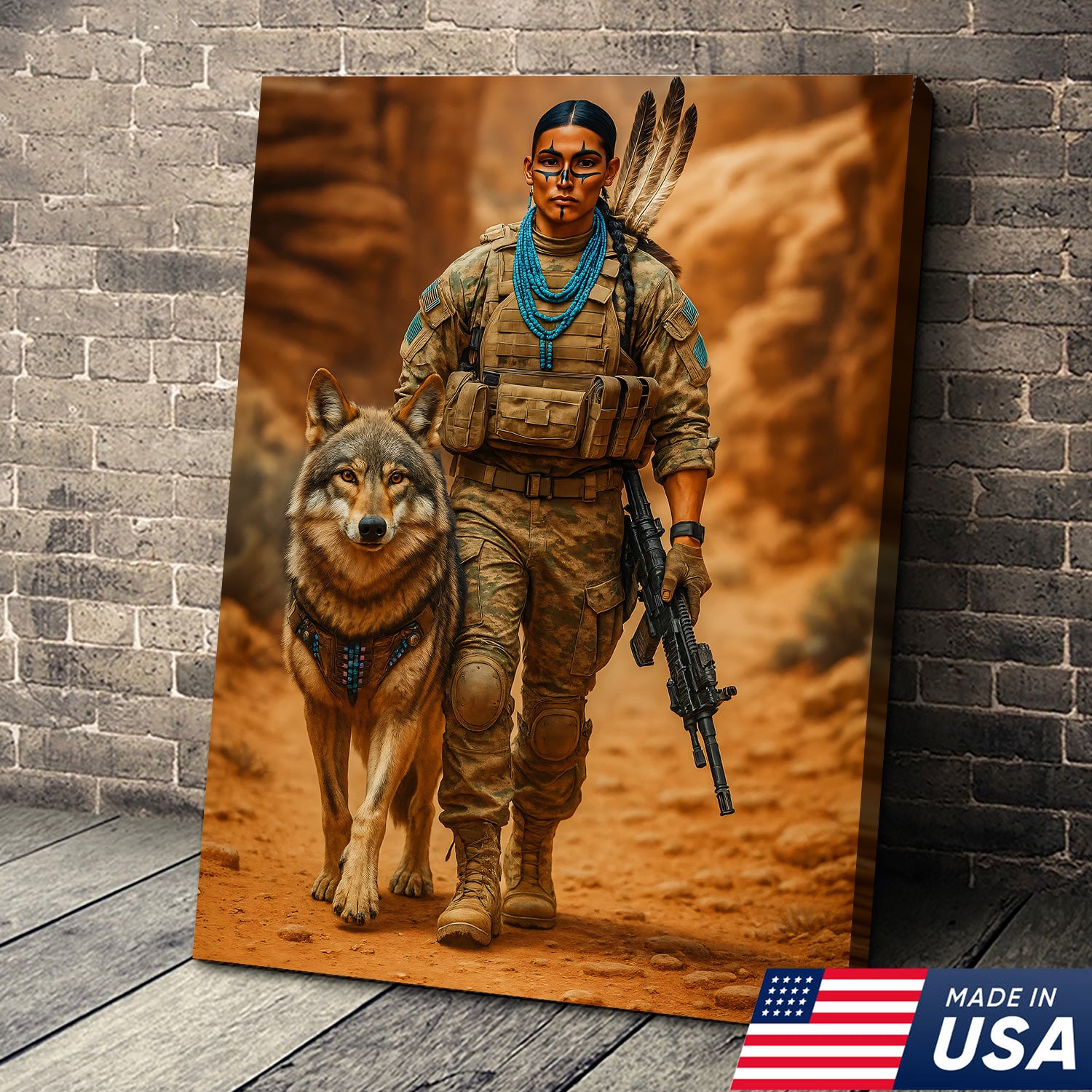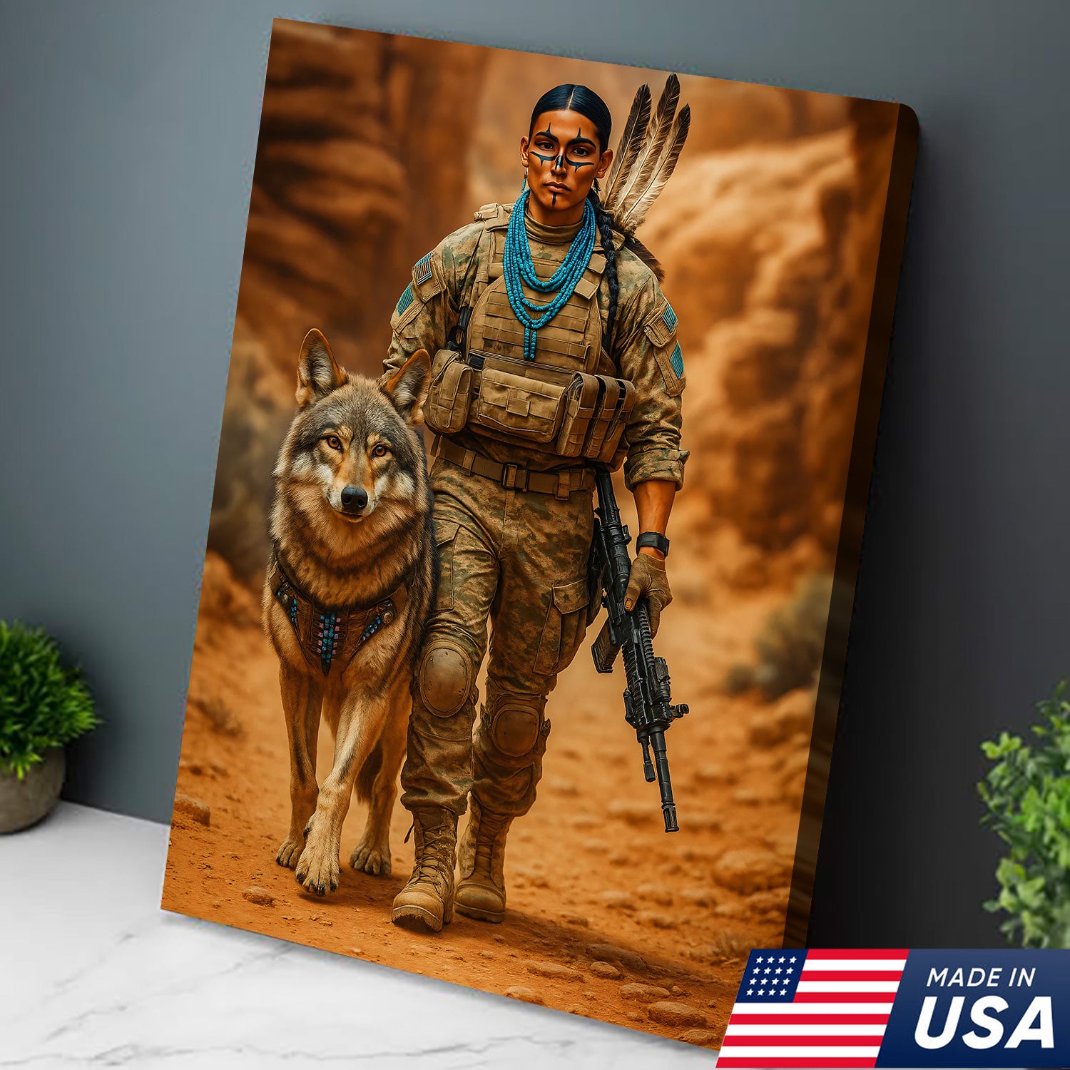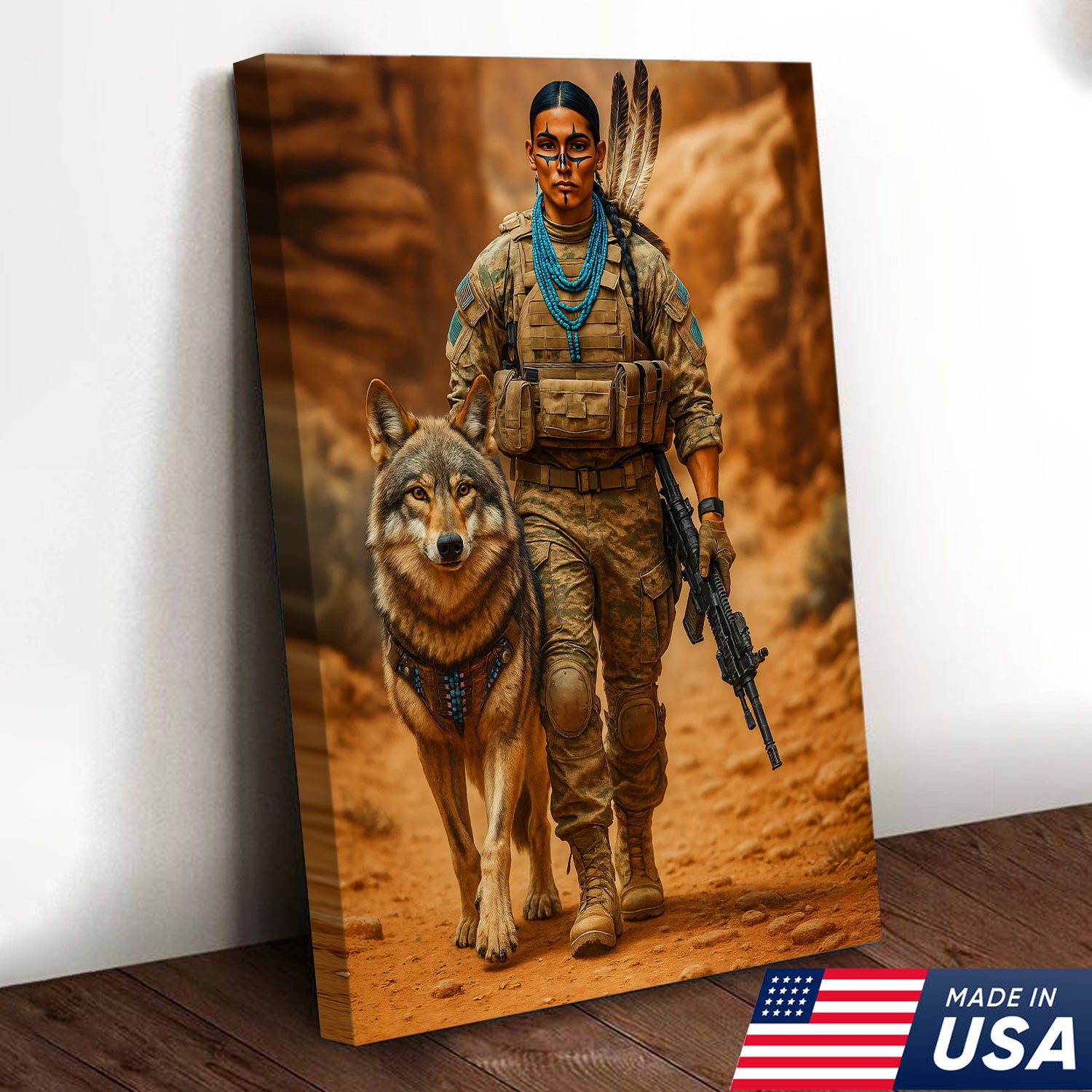 Native Warrior and Wolf Desert Canvas Wall Art, Southwestern Tribal Soldier Spirit Animal Print, Wolf Lover Rustic Wall Decor