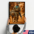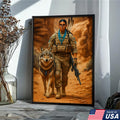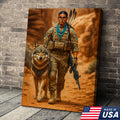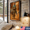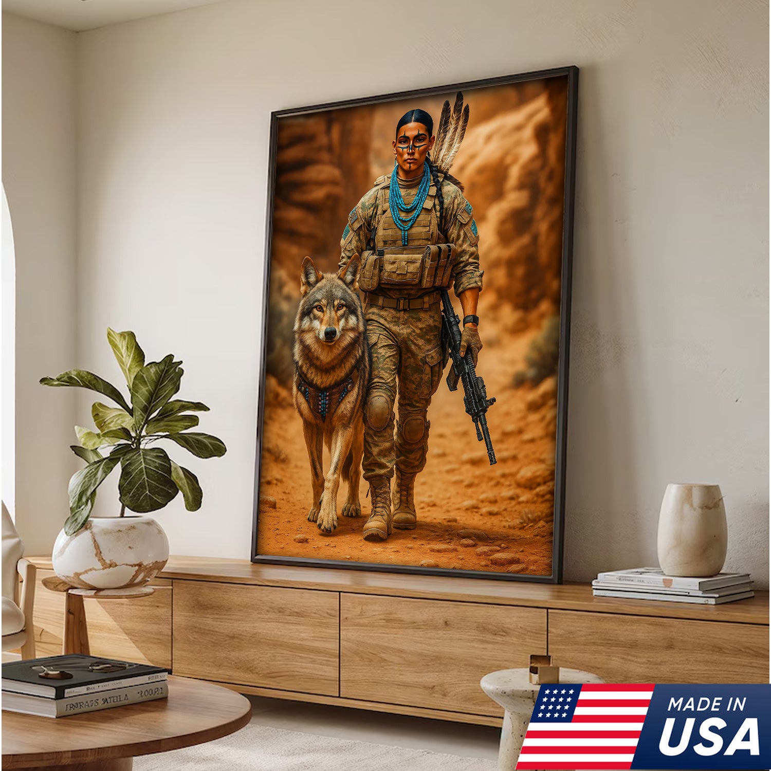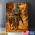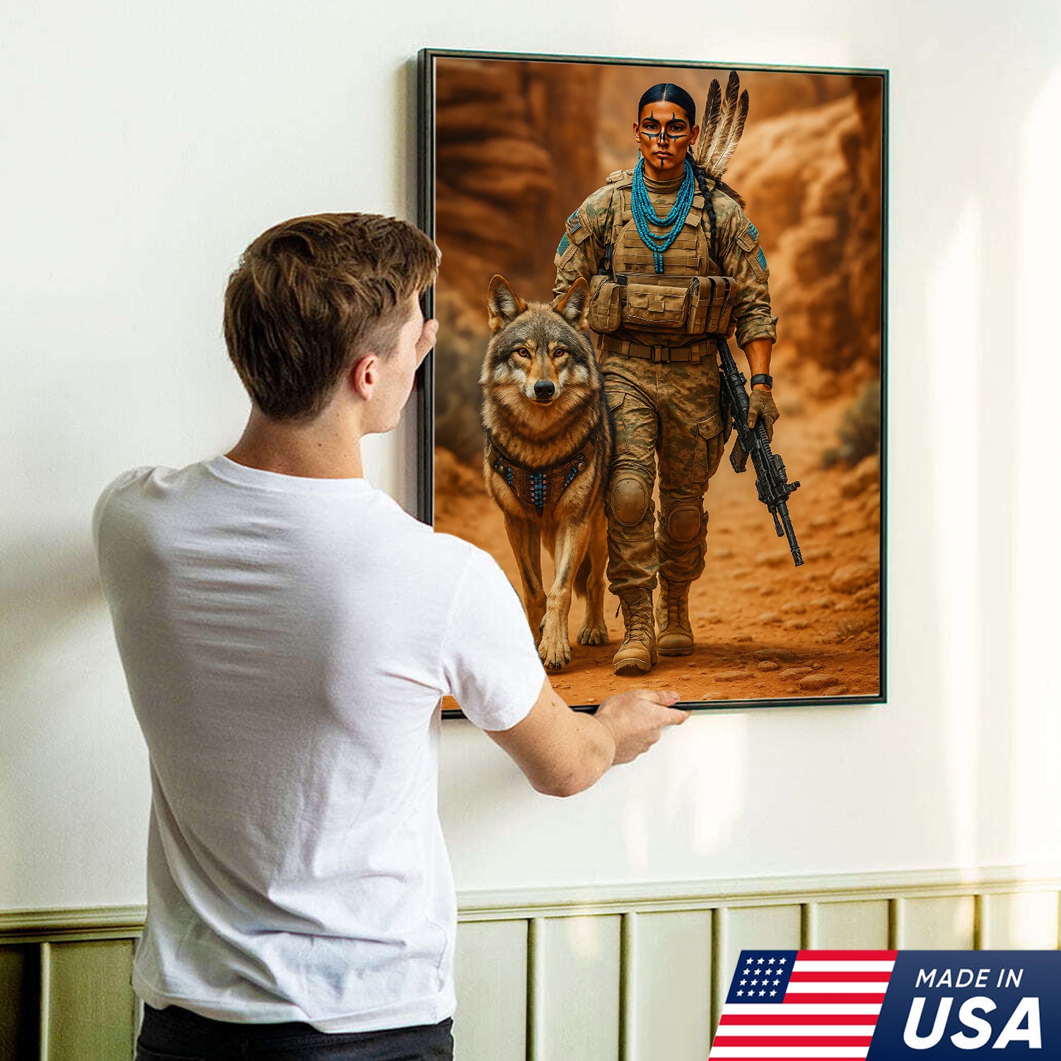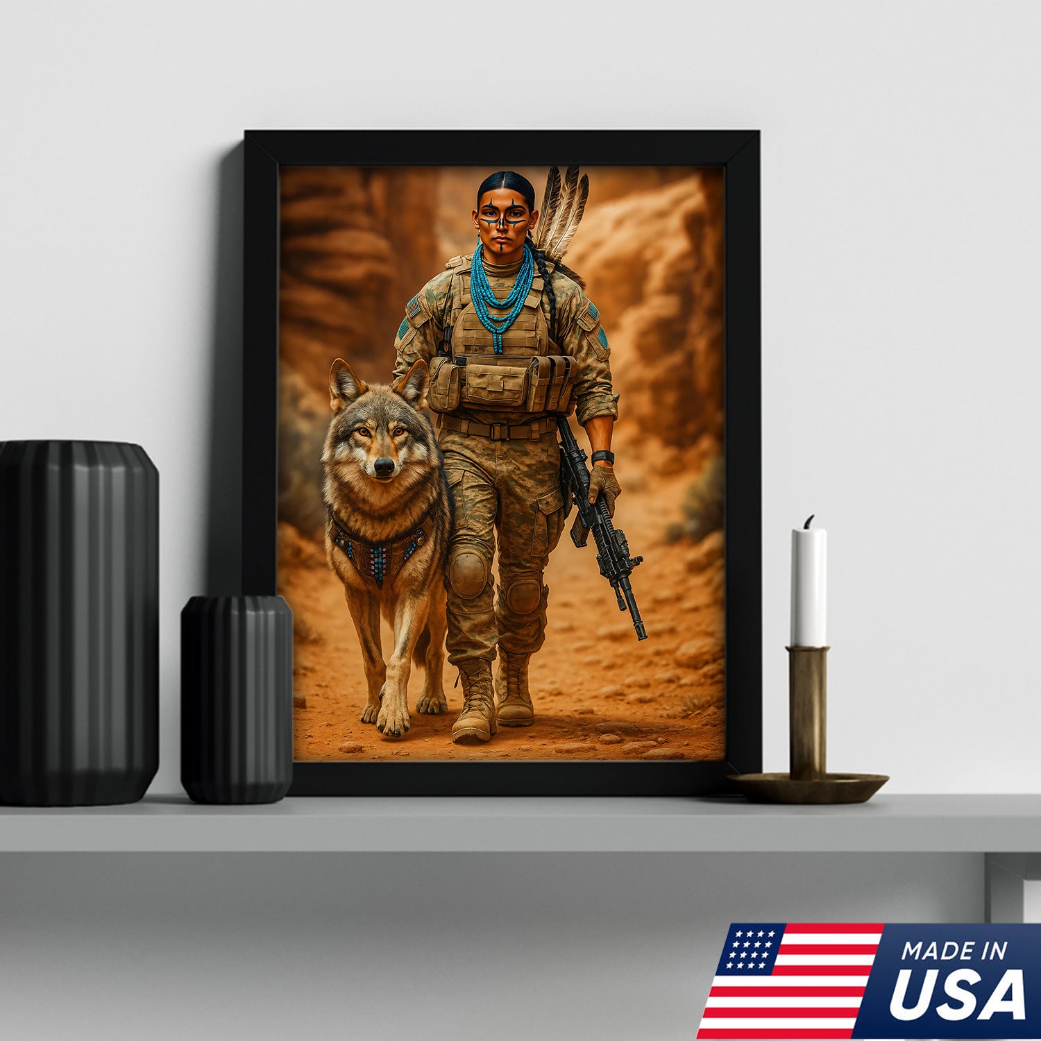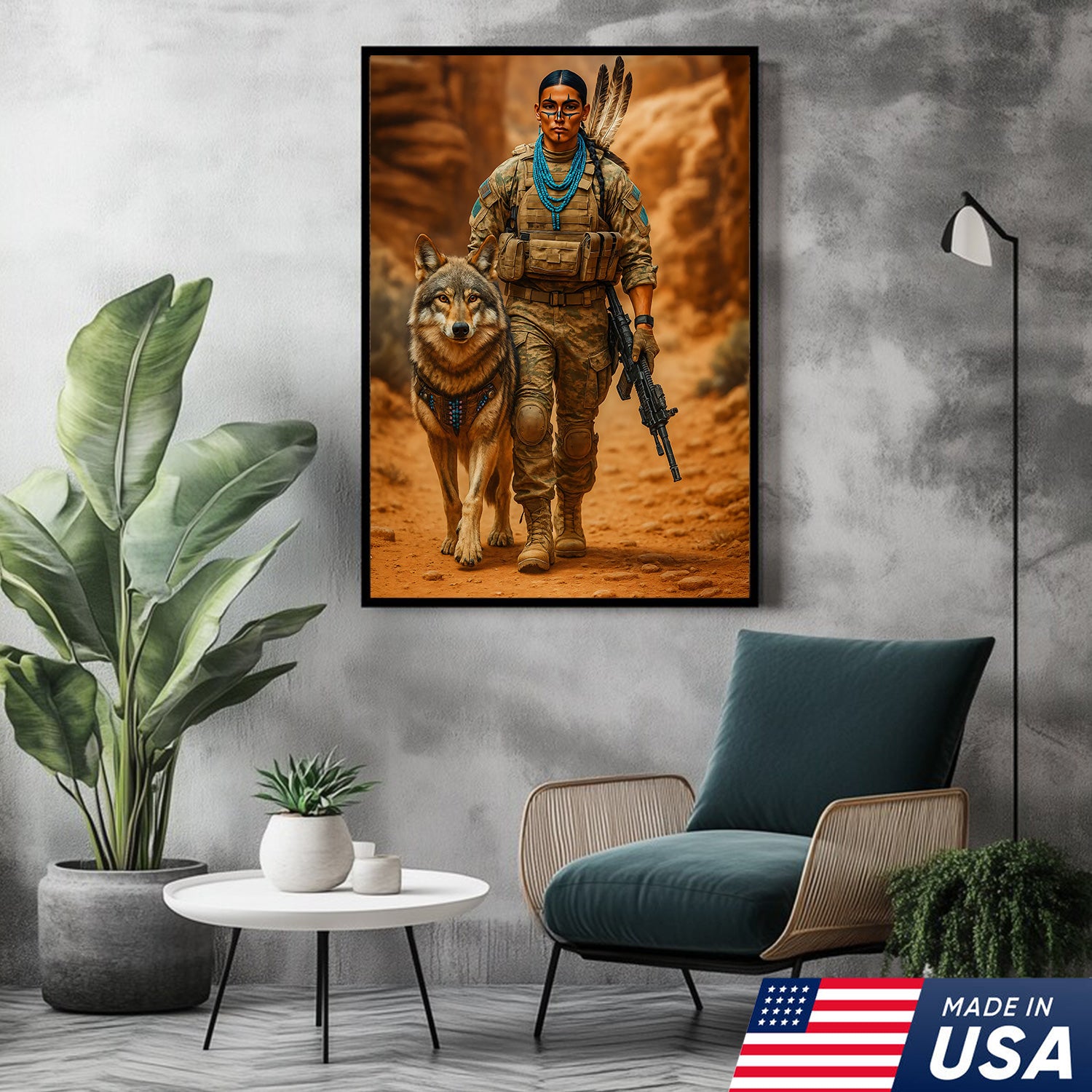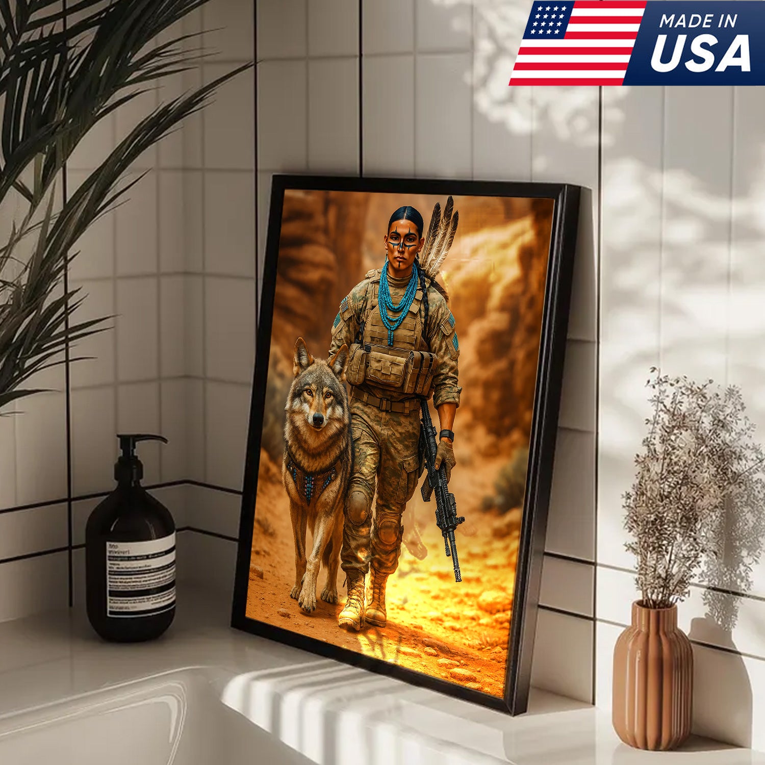 Native Warrior and Wolf Desert Canvas Wall Art, Southwestern Tribal Soldier Spirit Animal Print, Wolf Lover Rustic Wall Decor