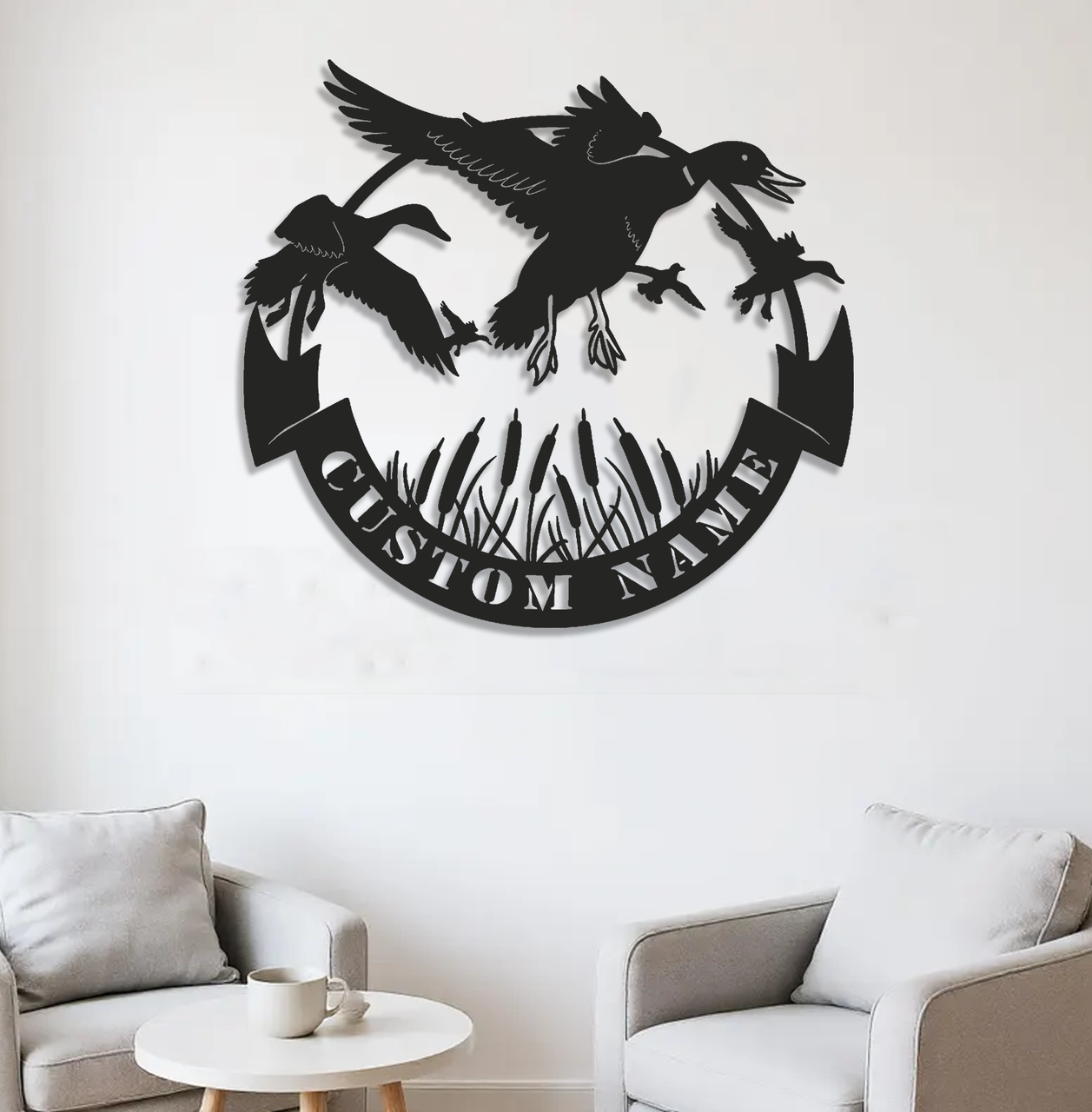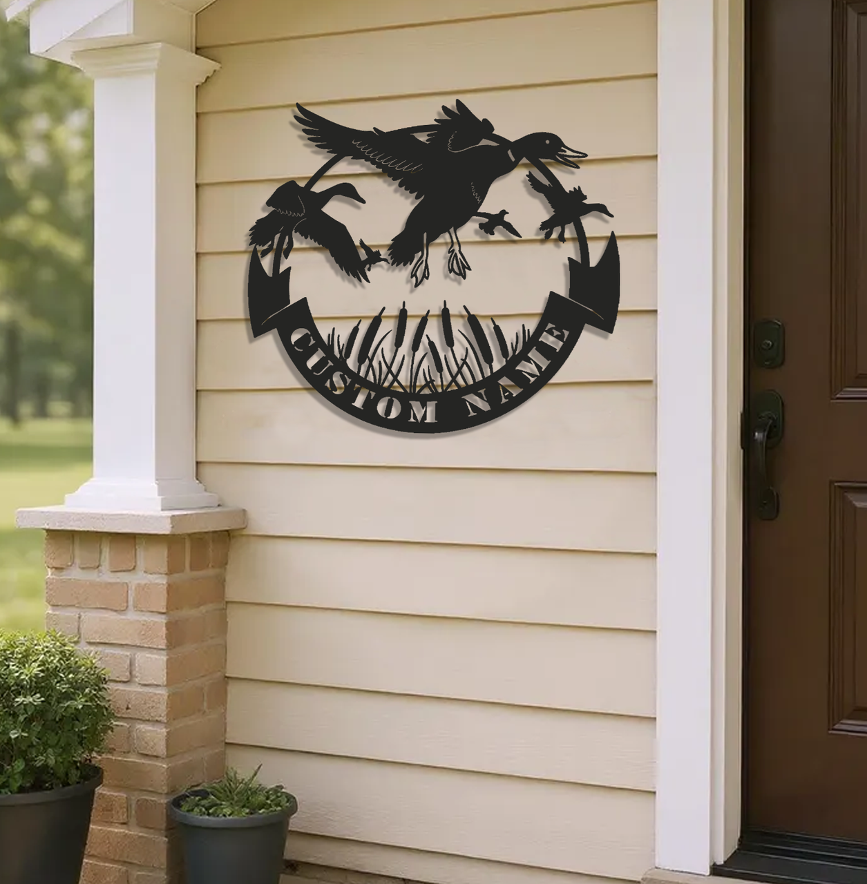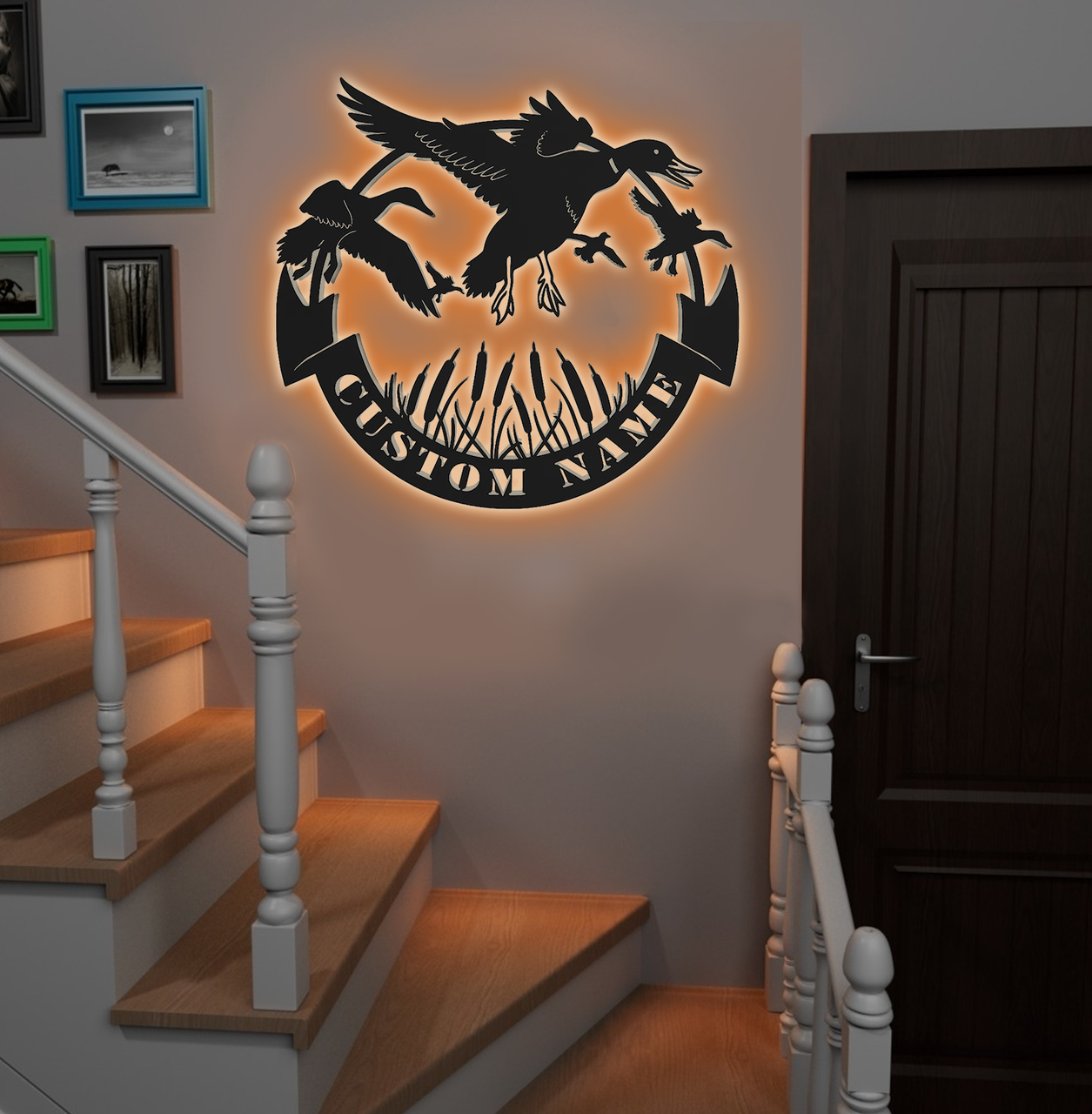 Personalized Duck Hunting Metal Sign WITH LED/WITHOUT LED – Flying Waterfowl Wall Art, Rustic Lodge Decor, Custom Name Wildlife Sign