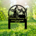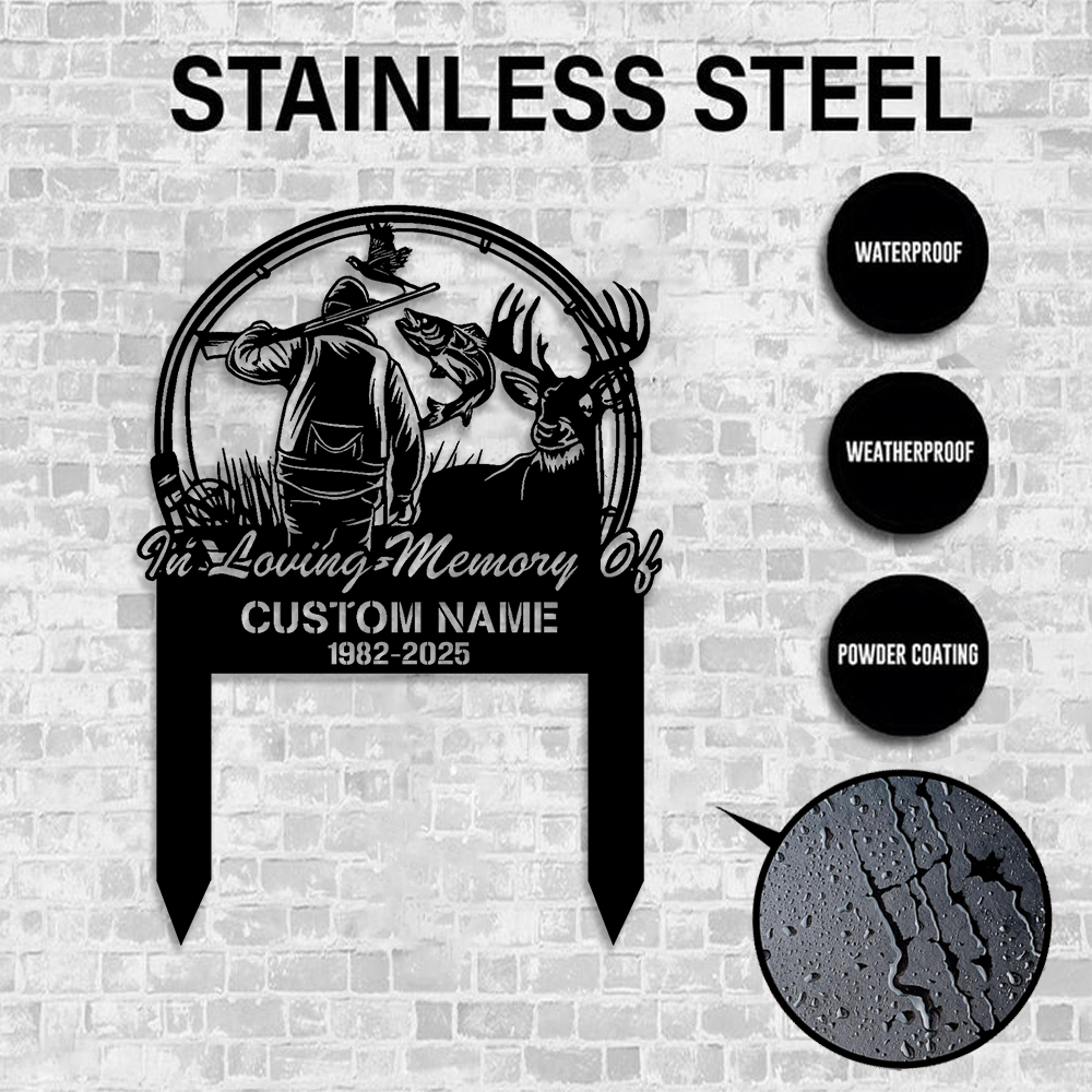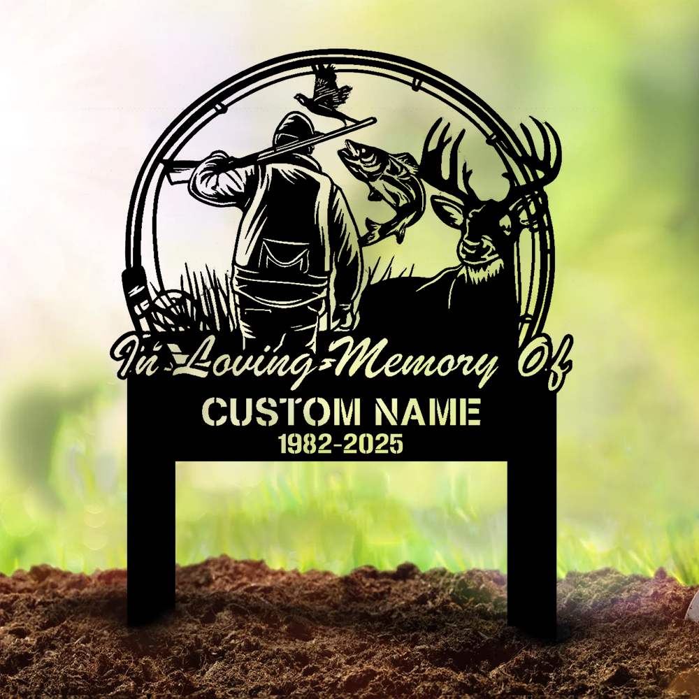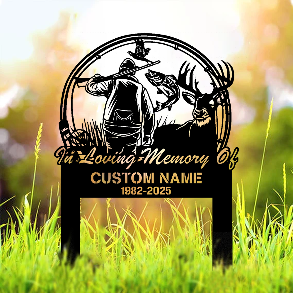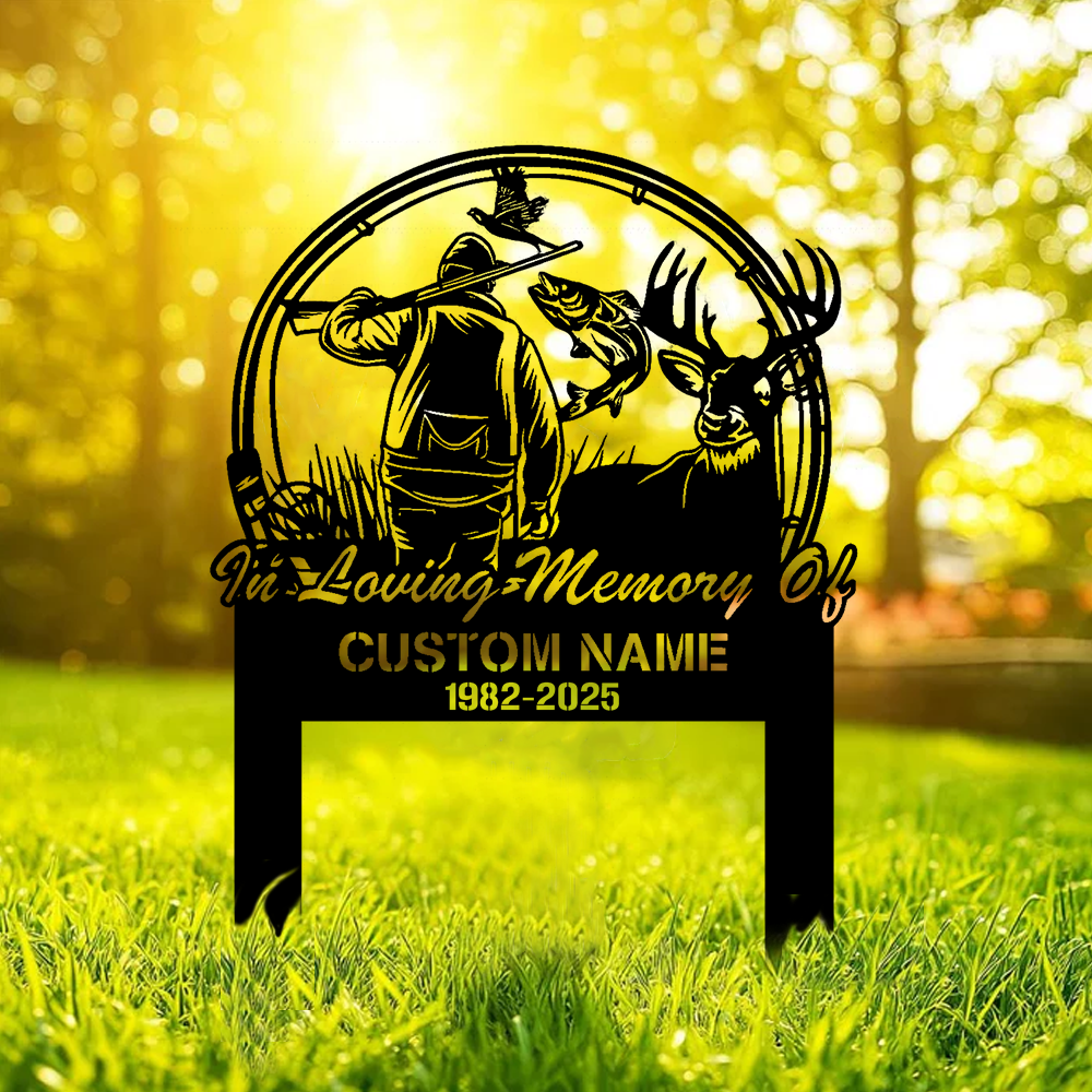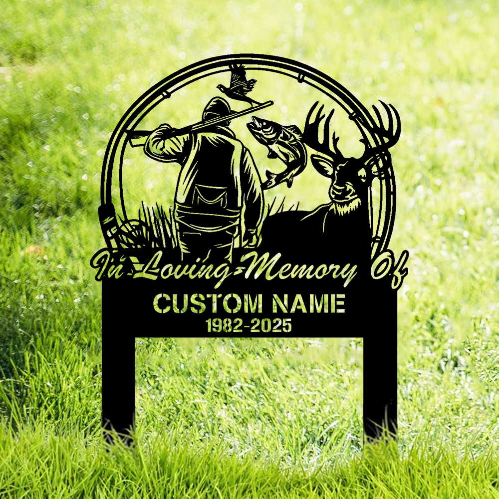 Personalized Hunter Memorial Metal Sign – In Loving Memory Grave Marker with Deer, Fish & Duck Scene