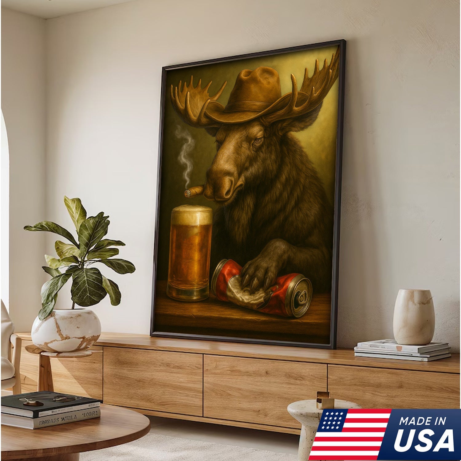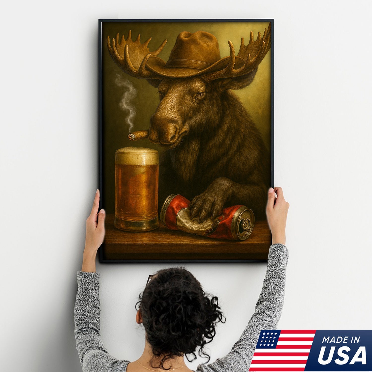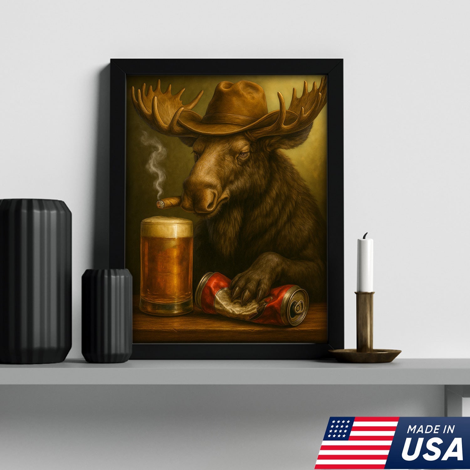 Rustic Cowboy Moose Beer Canvas – Funny Bar Wall Art Gift for Hunters, Cabin Decor & Man Caves