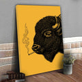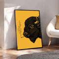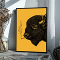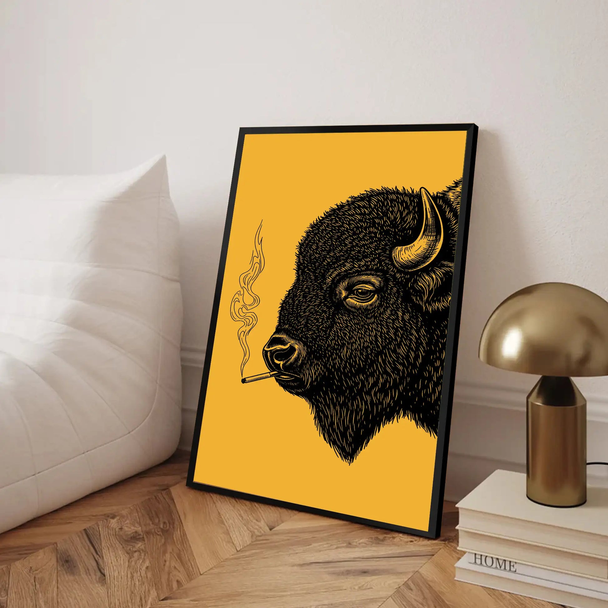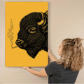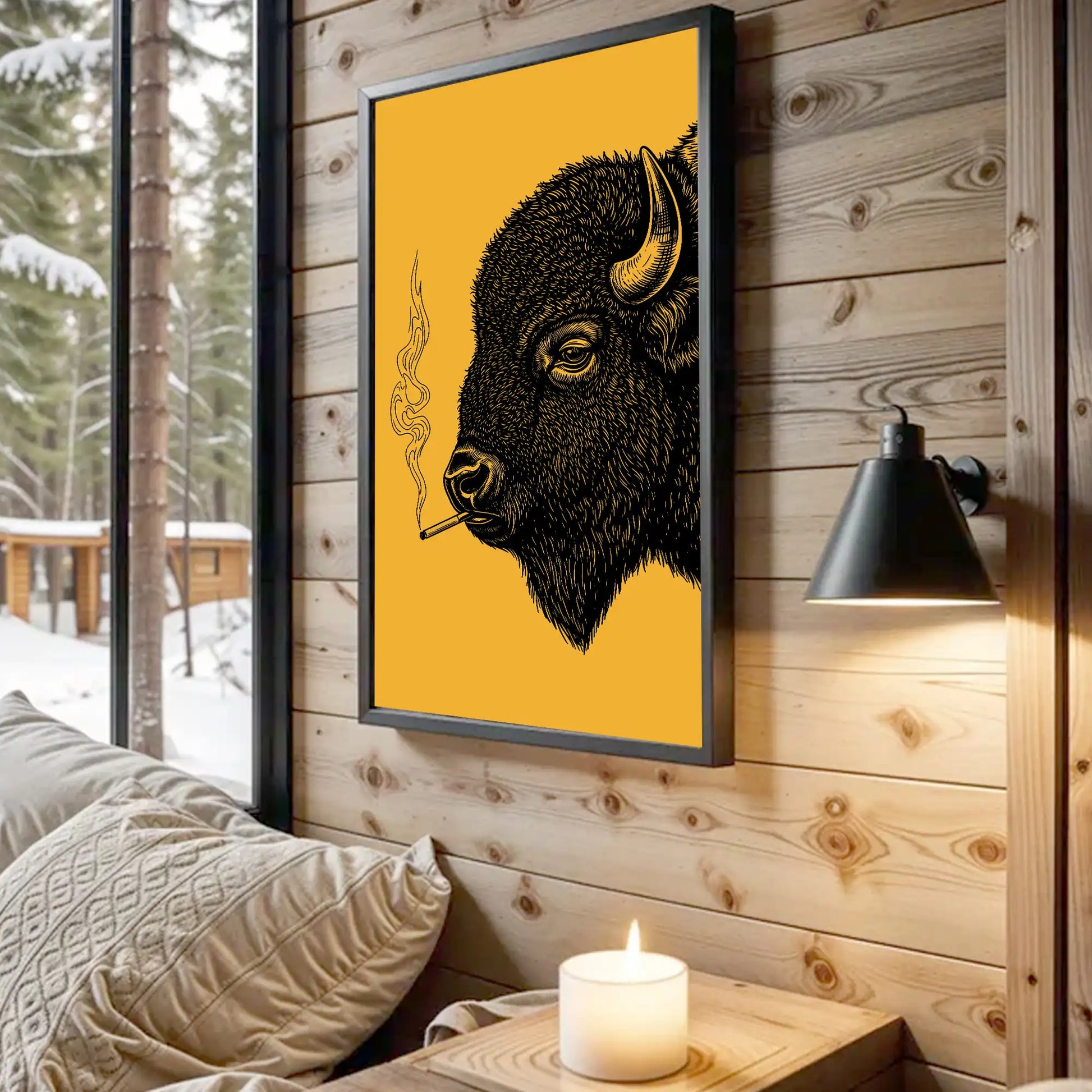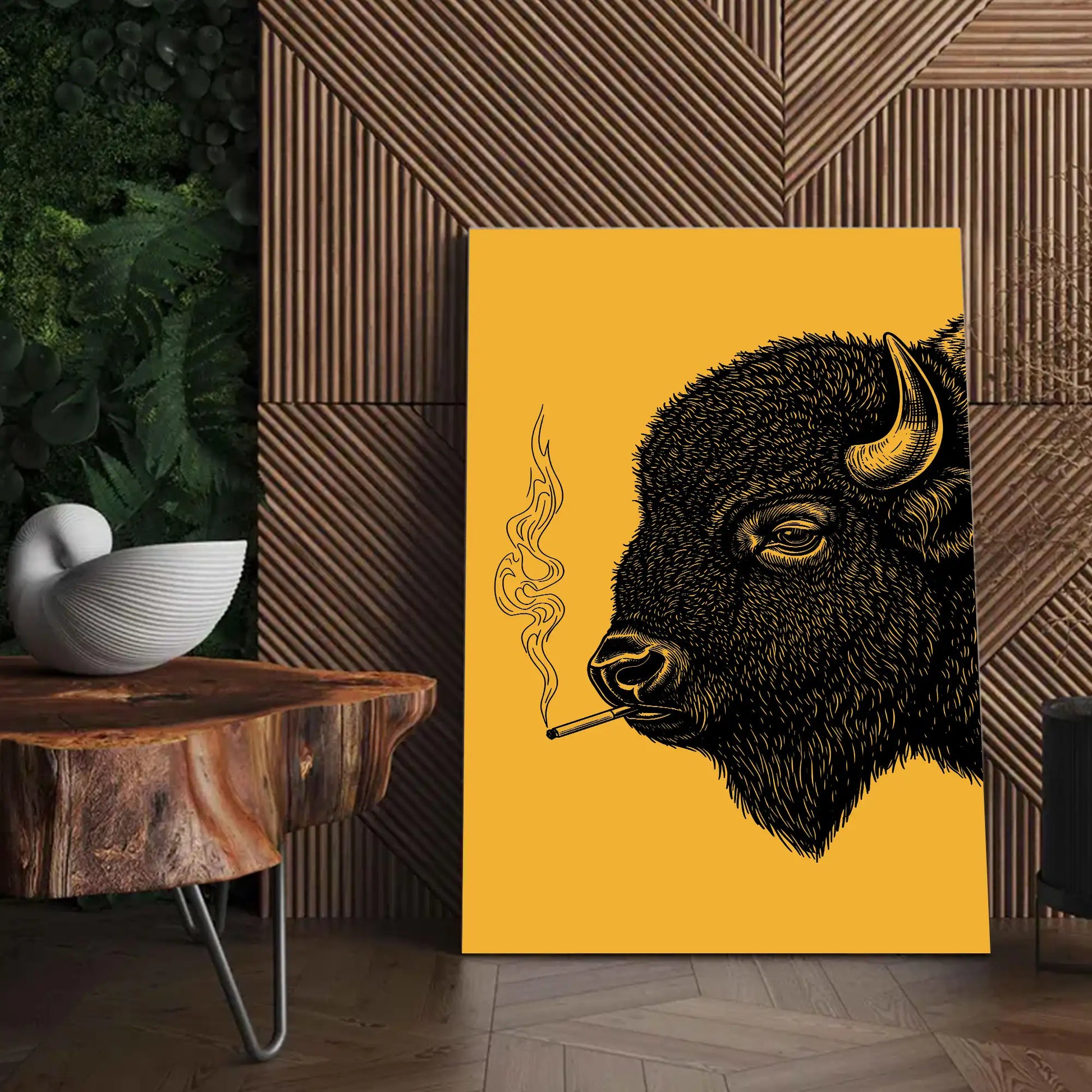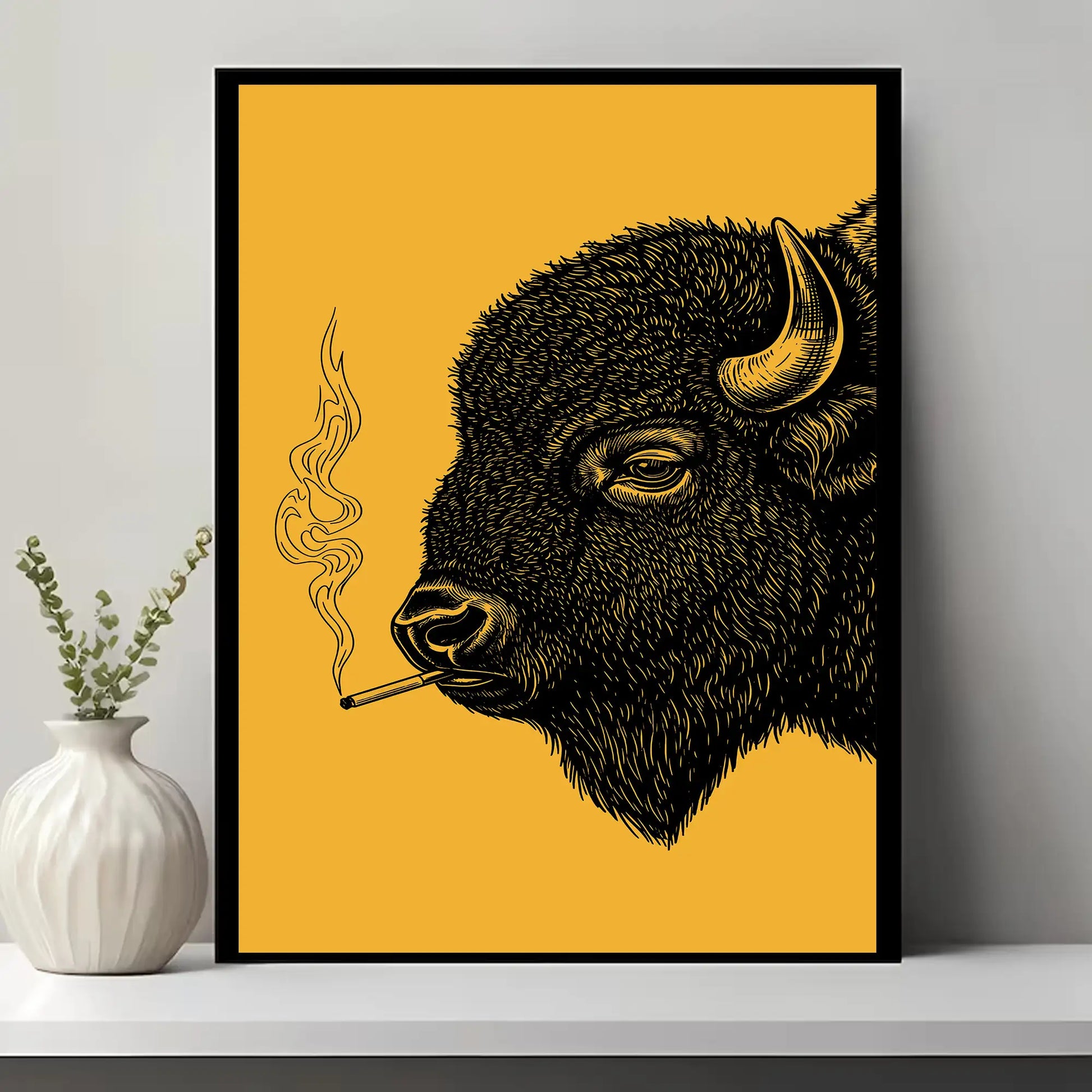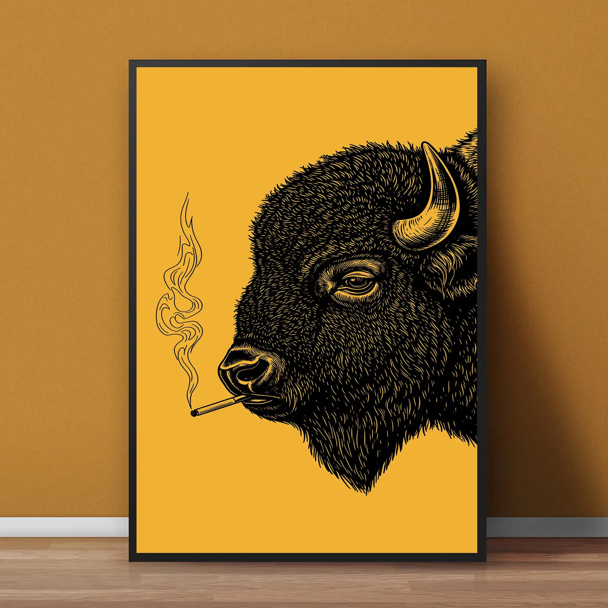 This striking wall art features a powerful bison rendered in bold black lines against a golden background, holding a cigarette with smoke curling upward. Among tribes of the Great Plains such as the Lakota and Cheyenne, the bison is a sacred symbol of abundance, strength, and survival. This artwork transforms that revered imagery with a rebellious twist, turning the bison into a modern icon of defiance and grit. Its sharp details and warm contrast make it both a bold decorative piece and a conversation starter. Perfect for rustic homes, bars, studios, or anyone seeking statement western wall art.